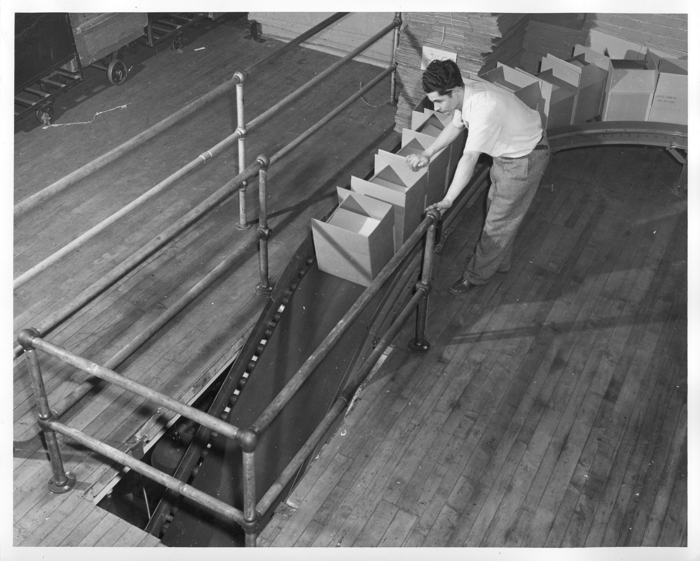Black and white photographic print of textile worker George Rusyn transporting boxes of shuttle bobbins on a conveyor belt at the American Thread Company, Willimantic, CT. Unknown photographer.Photograph Details