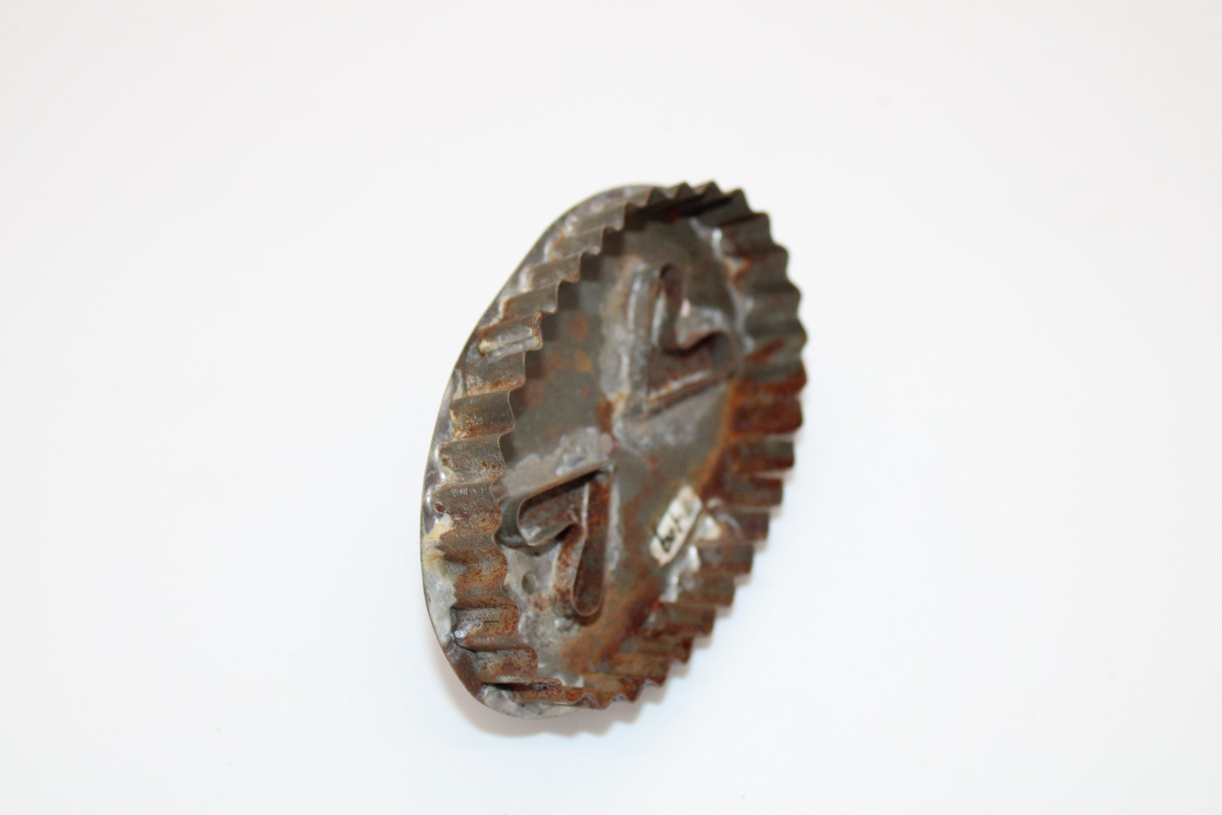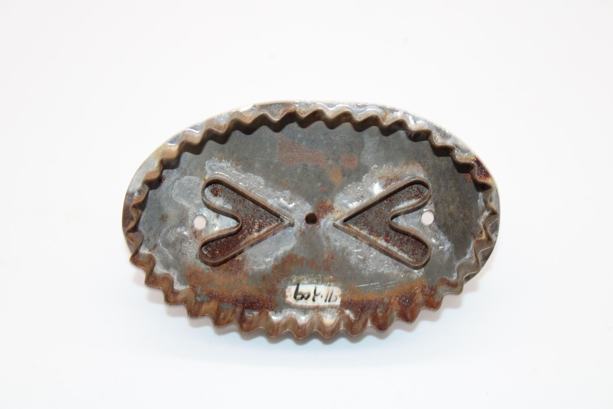 An oval cookie cutter with a zigzag edge. Two V shapes (hearts?) are in the center. Welding marks are visible at the attachment site of the V's.Made/Created