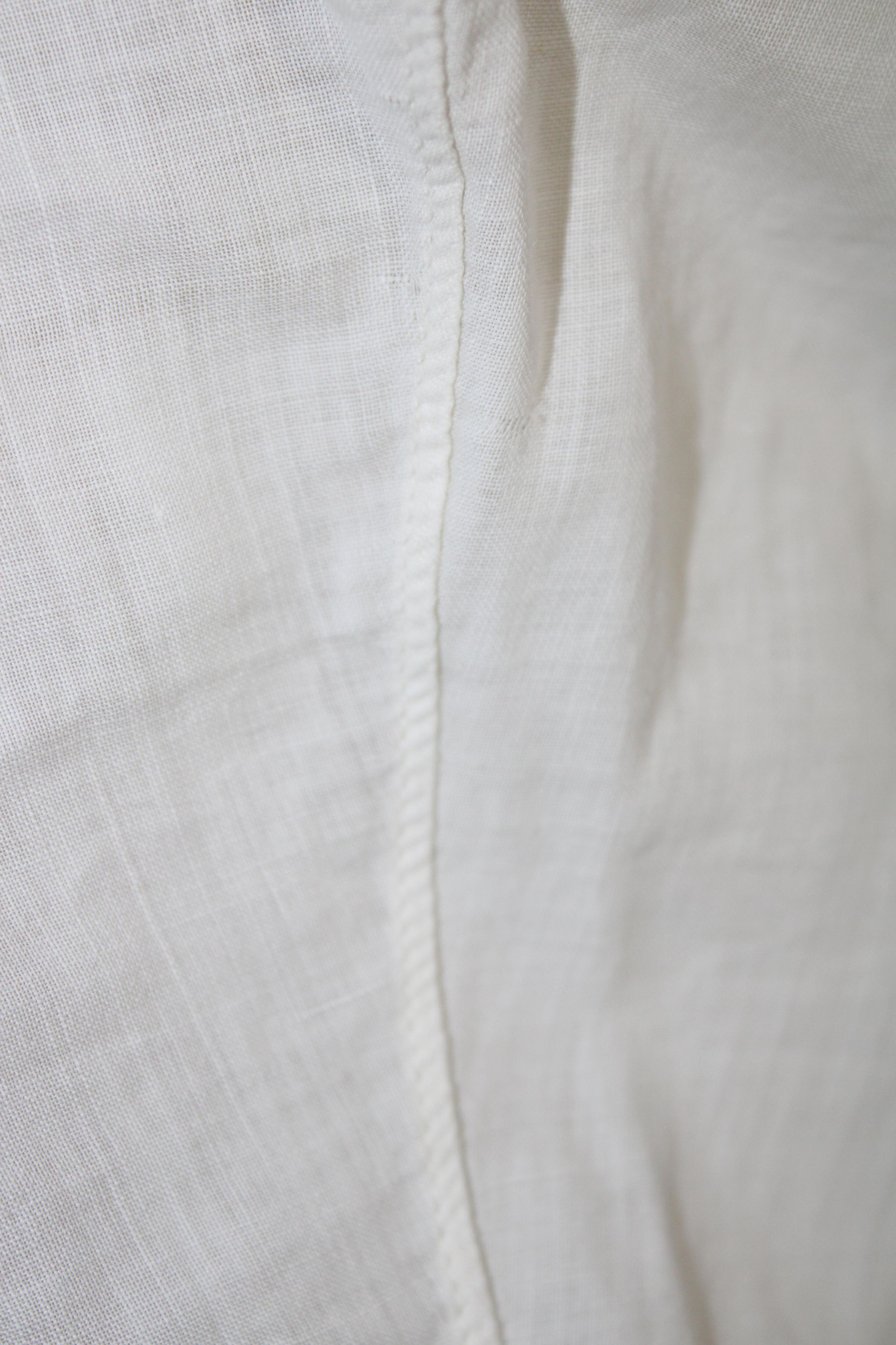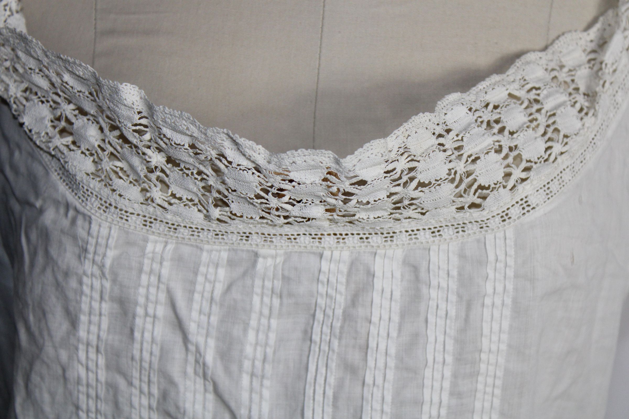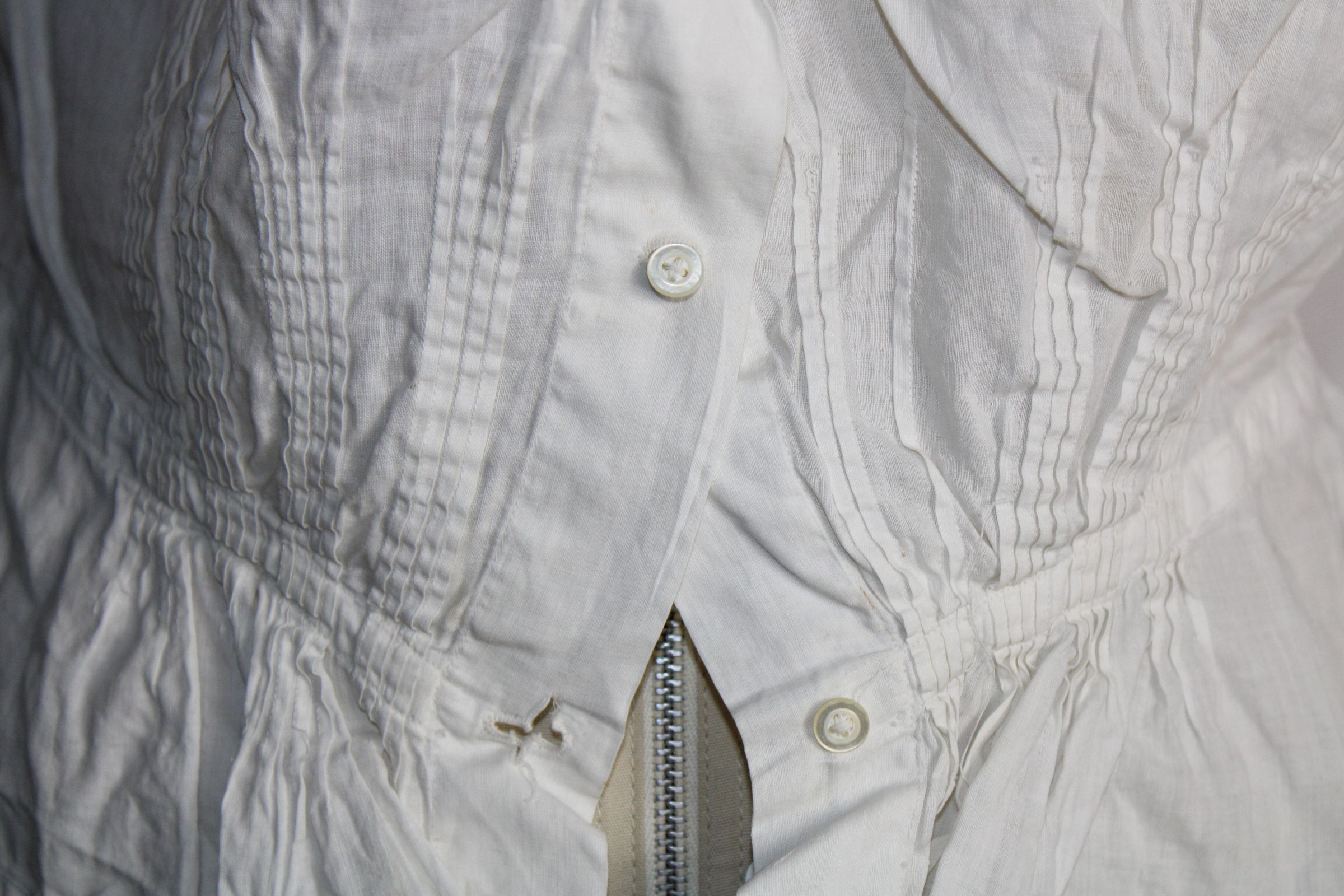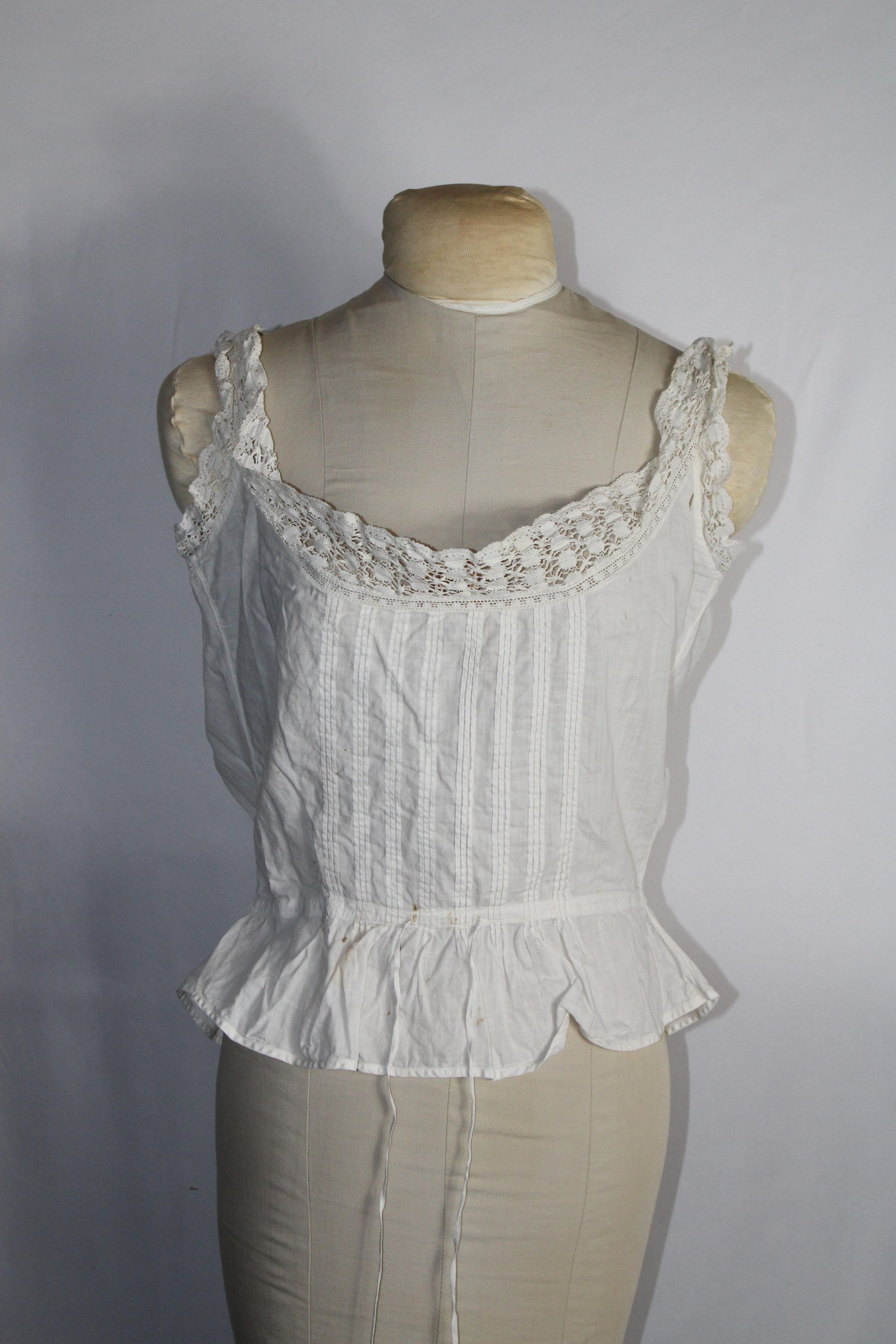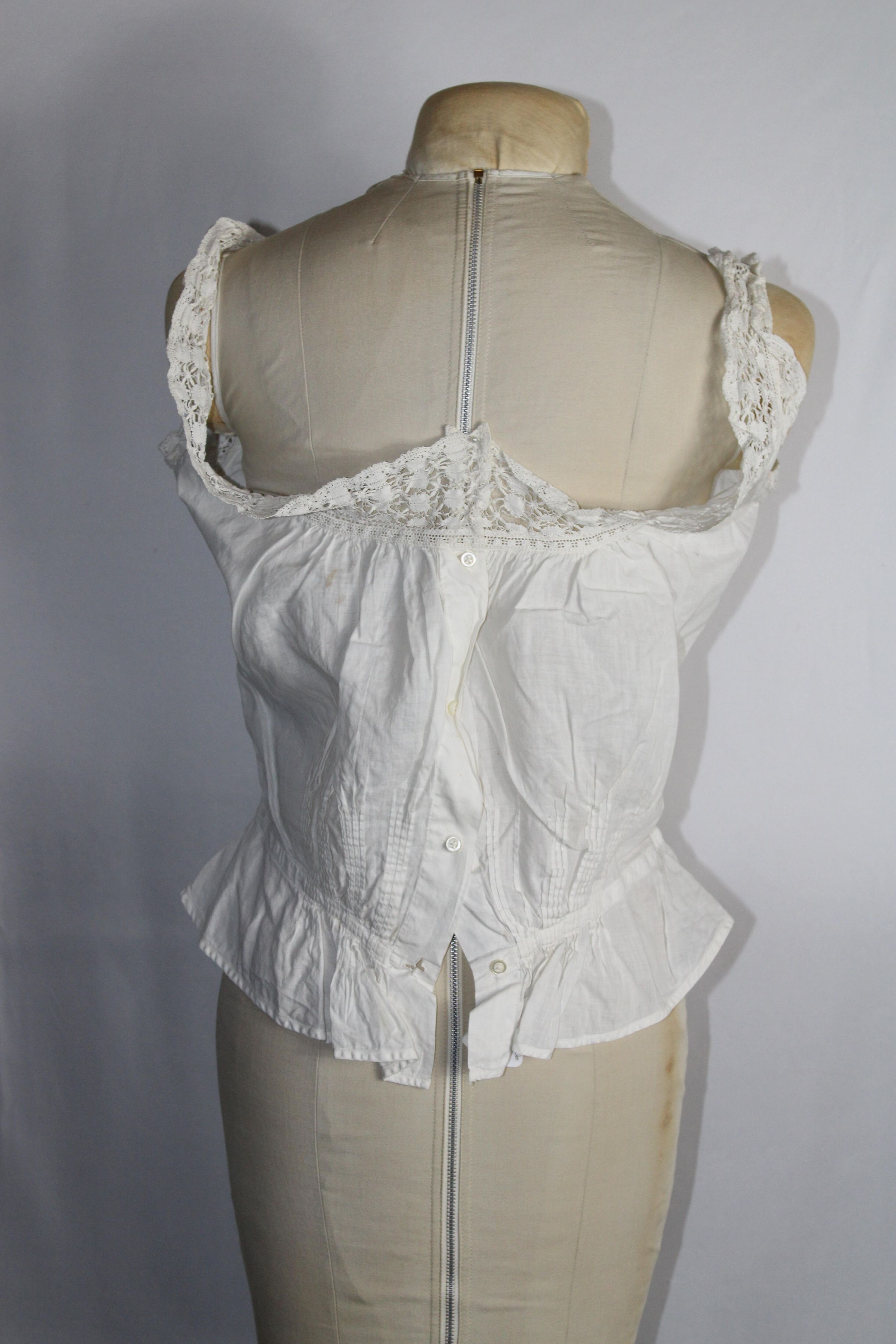 Corset cover with lace border at neckline. Decorated with 1/8 inch pin tucks. Drawstring waist. Button closure in front.Collection