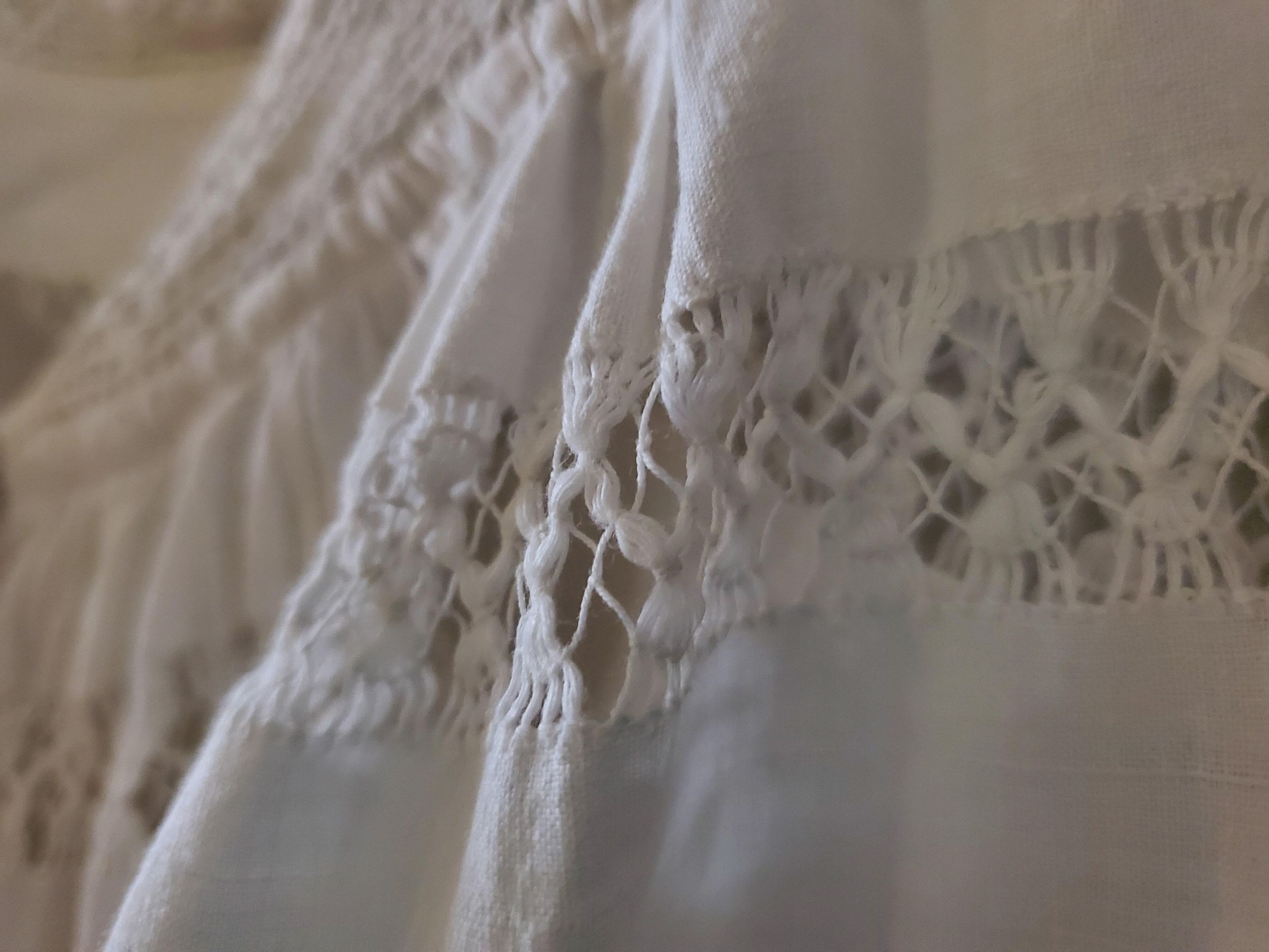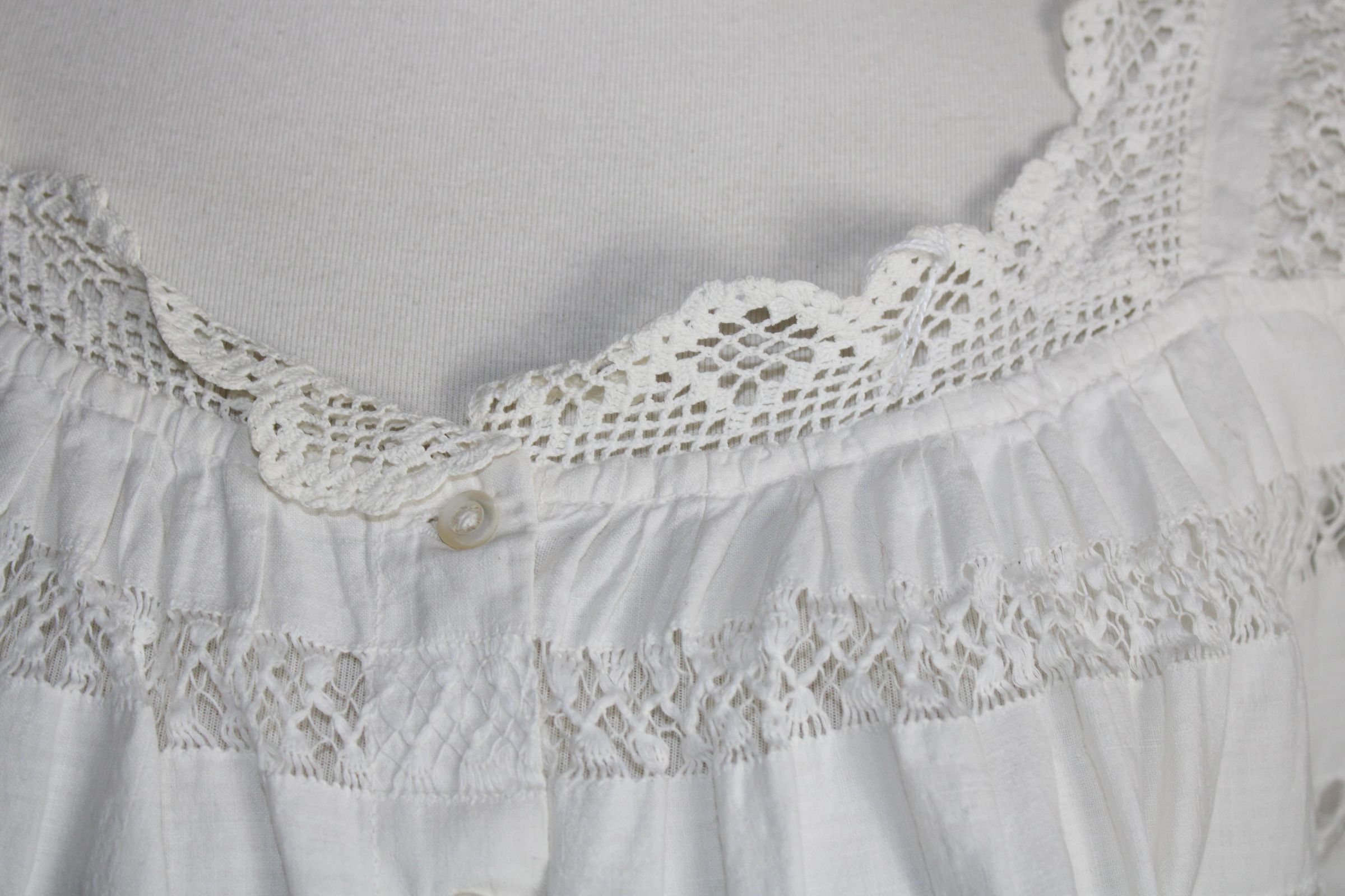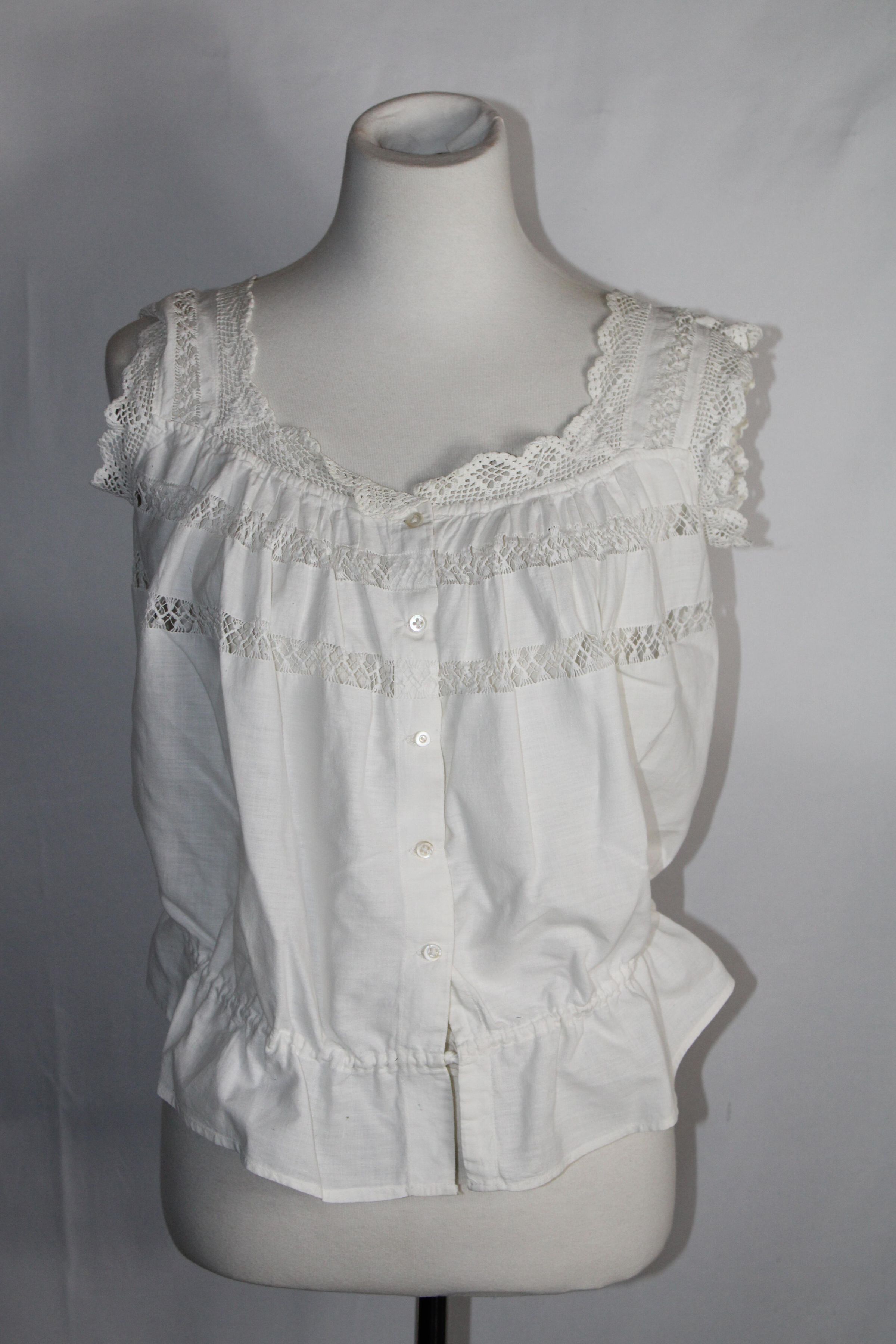 A white cotton poplin corset cover, most likely 1920s. Lace insertions and lace borer along neckline and sleeves. Drawstring at waist.Collection