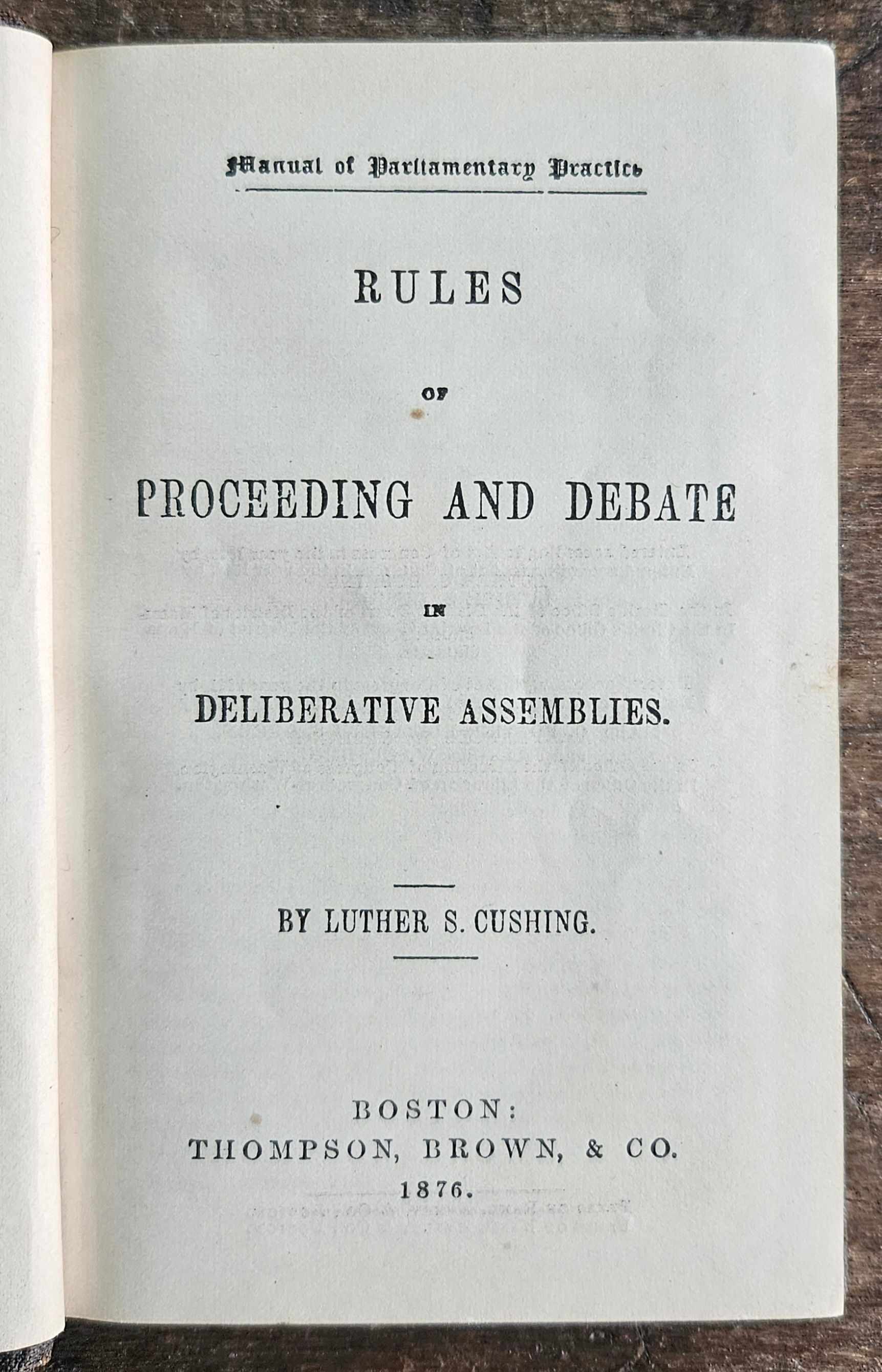 Manual of Parliamentary Practice: Rules of Proceedings and Debate in Deliberative Assemblies, by Luther S. Cushing. 1876. Boston: Thompson, Brown & Co.Collection