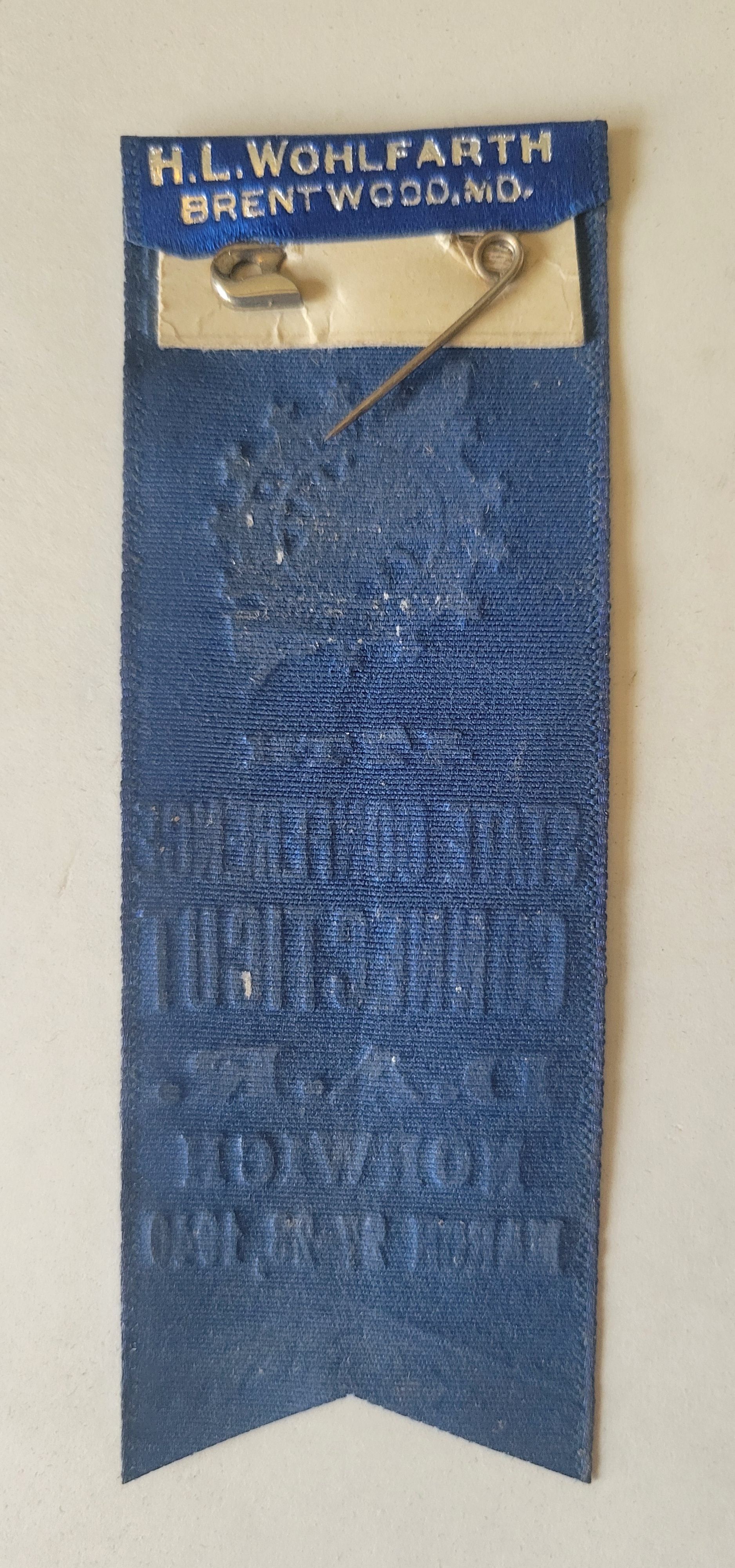 A delegate ribbon pin from the 47th State Conference of the Connecticut Daughters of the American Revolution. Dated March 27-28, 1940. A safety pin is attached at the back, where the manufacturer is listed as H.L. Wohlfarth of Brentwood MD.Collection