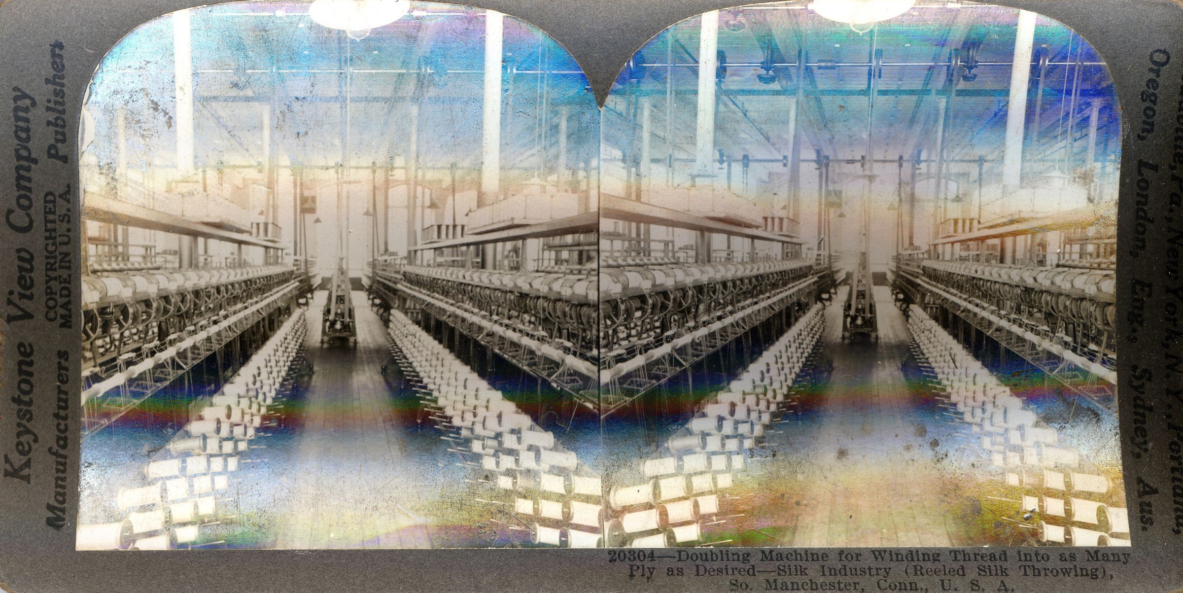 Stereograph of doubling machine for winding thread at Cheney Brothers silk mills in South Manchester, CT, 1914. Black and white print on cardboard. Card is warped. Unknown photographer. Studio: Keystone View Company, Meadville, PA. Serial #20304.Photograph Details