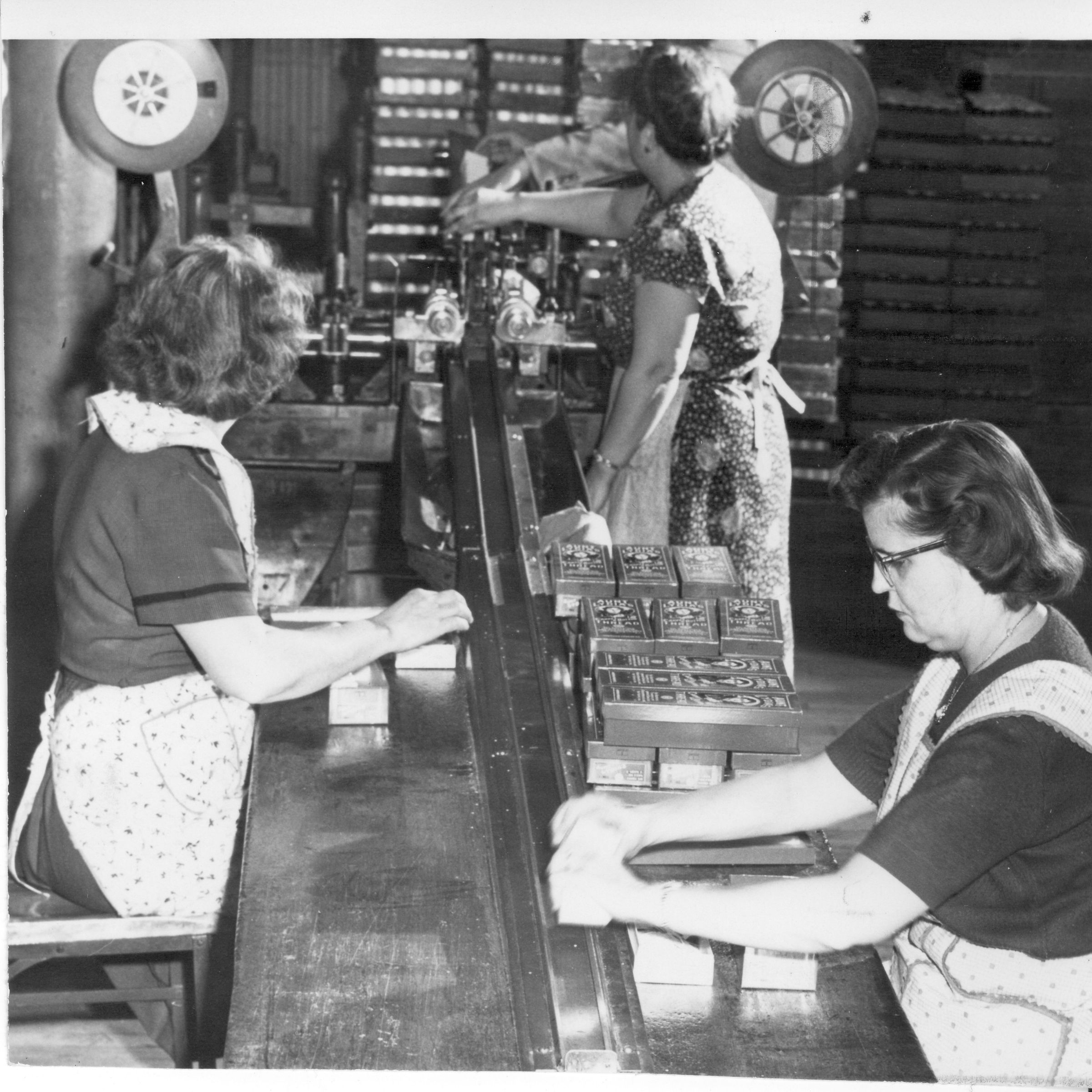 Black and white photographic print of three textile mill workers packaging what appears to be Aunt Lydia's Yarn in the Packaging Department at the American Thread Company, Willimantic, CT, c. 1957. Unknown photographer.Photograph Details