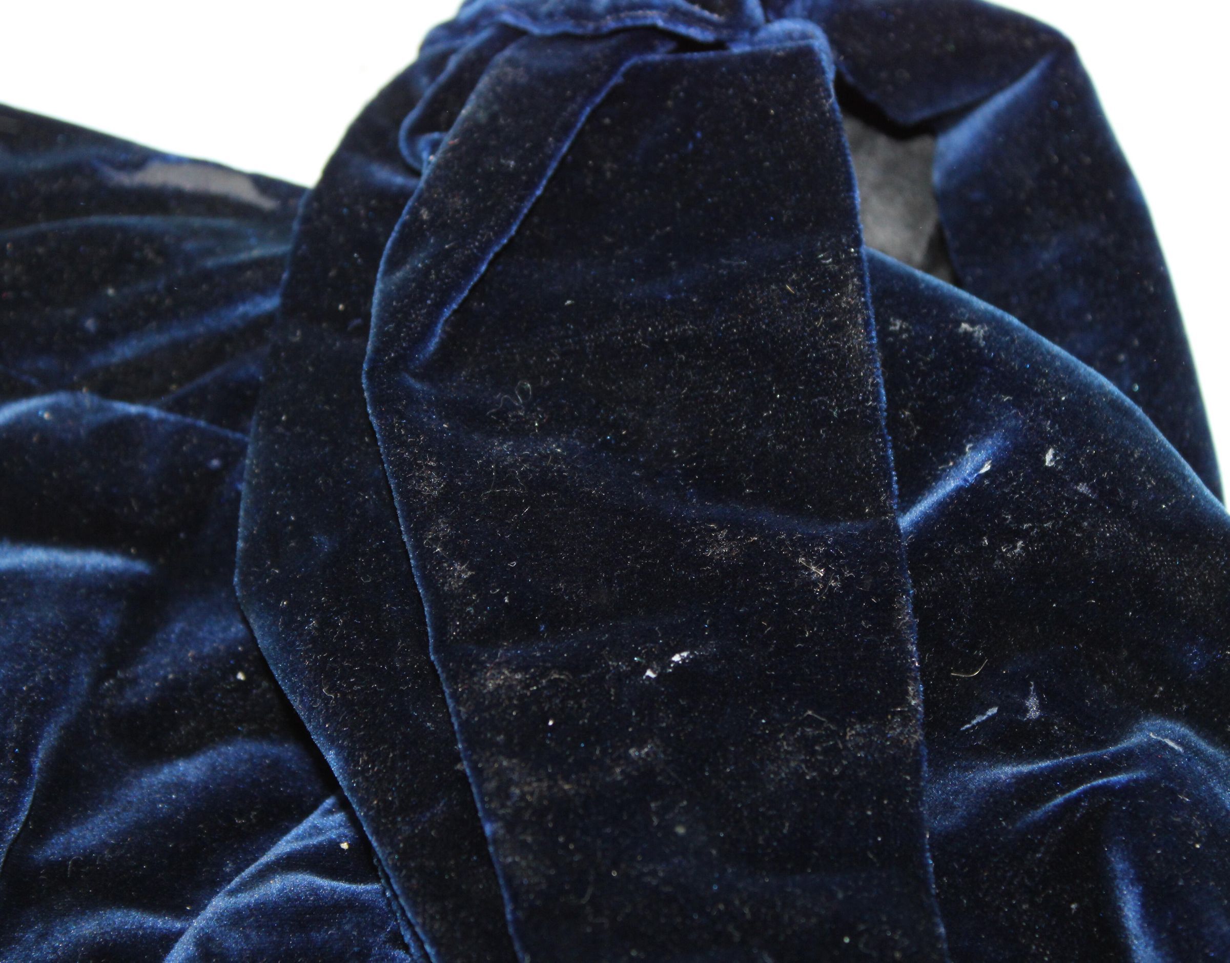 A late Victorian bodice made of navy silk velvet. Front button closure. Has an illegible label: "Rou___l Venue Ca___t". Tails at back have weights at the ends.Collection