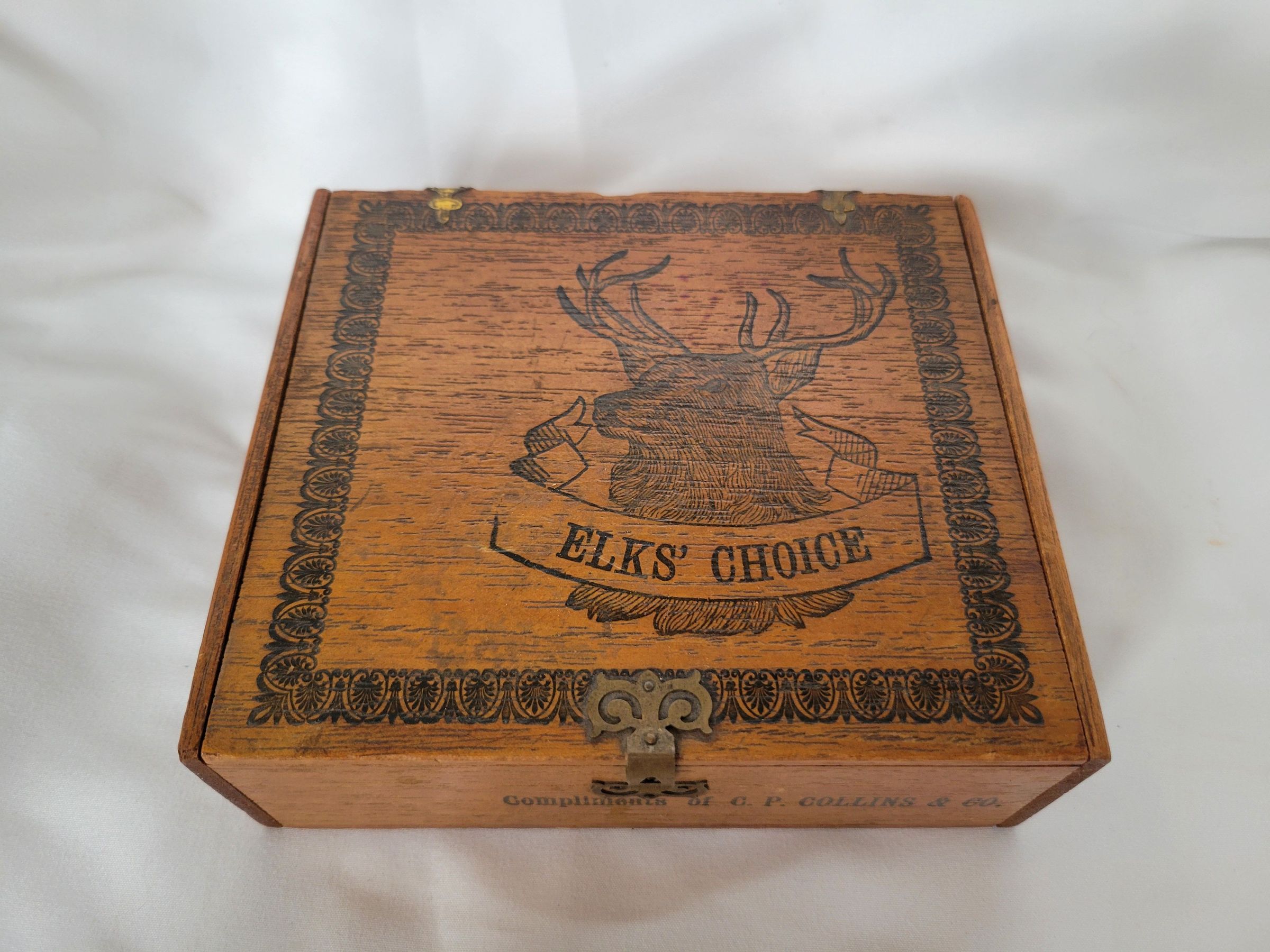 A rectangular wooden box with black stamped border and elk's head design with the words "ELKS' CHOICE." On the front of the box, near the metal latch, is stamped "Compliments of C.P. COLLINS & CO." On the inside of the lid a piece of paper is glued with an illustration of an elk's head and "Elk's Choice/Cervus Alces/ Compliments/of/C.P. Collins & Co." "Cervus alces" is the scientific name for the elk, according to the British. In modern America this particular specification refers to the moose. The bottom of the box has a partial label indicating the factory where is was made, No. 645, 1st District of Michigan, and a notice which is partially missing but in full would read "The manufacturers of the Cigars herein contained have complied with all the requirements of law. Every person is cautioned not to use either this box for cigars again or the stamp thereon again, nor to remove the contents of this box without destroying said stamp under the Penalties provided by law in such cases." The stamp mentioned would have been adhered over the opening of the box to indicate whether the box had been opened, it also served as notice that certain taxes had been paid for the contents by the manufacturer.