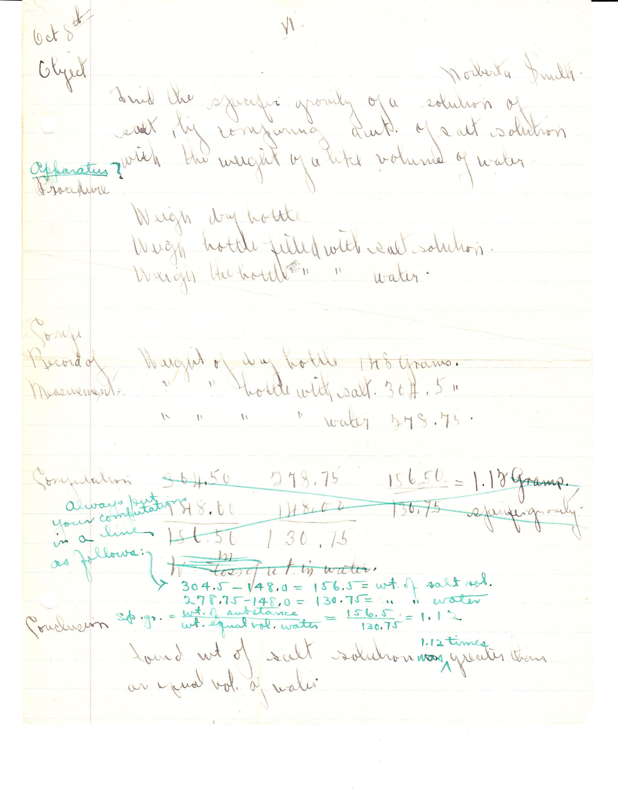 Chemistry assignment by Mary Norberta Smith, corrected by a teacher. Probably from when Smith was a student at the Willimantic Normal School in the late 1910's. Dated Oct. 8, but no year.Collection