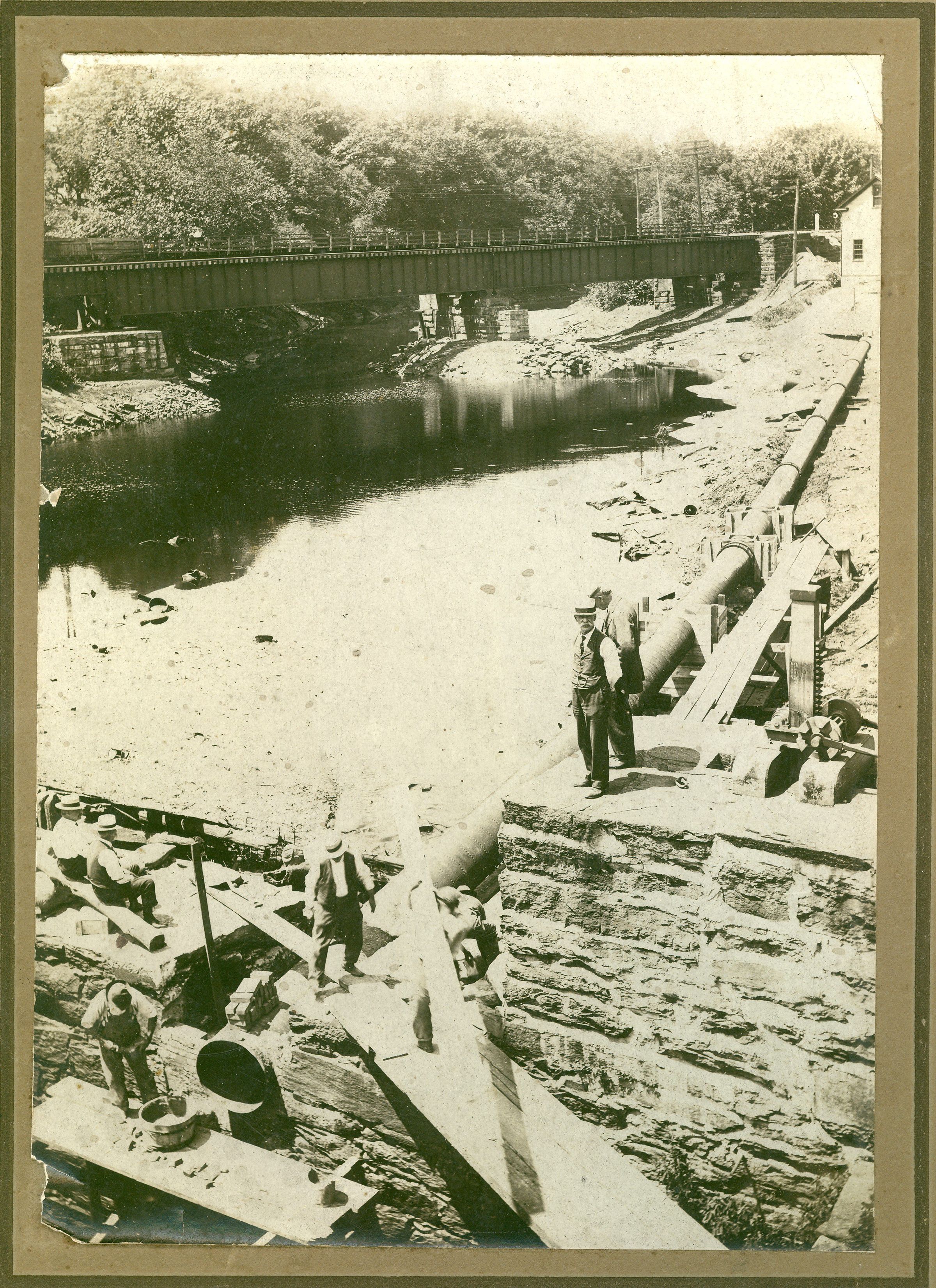 Black and white photographic print of construction work on one of the Mill No. 1 dams, American Thread Company, Willimantic, CT. Unknown photographer. Taken c. 1920.Photograph Details