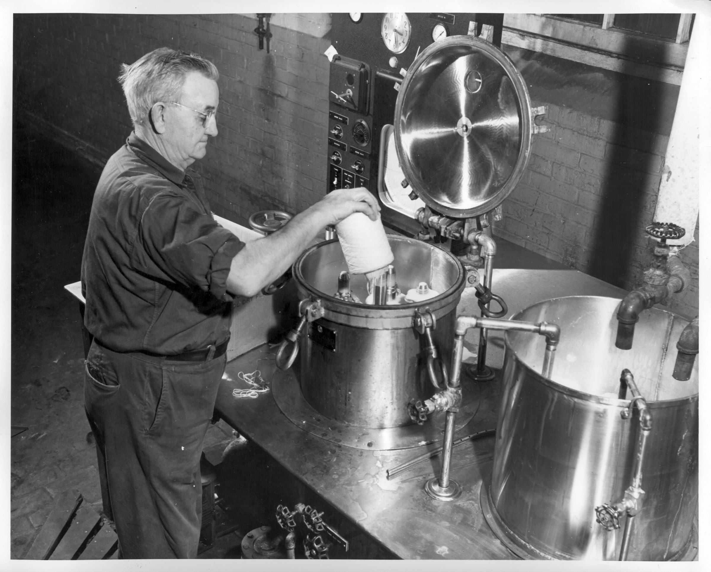 Black and white photographic print of textile worker John Neiland operating an experimental dyeing apparatus in the Package Dye Shop, American Thread Company, Willimantic, CT. Unknown photographer. Taken c. 1957.Photograph Details