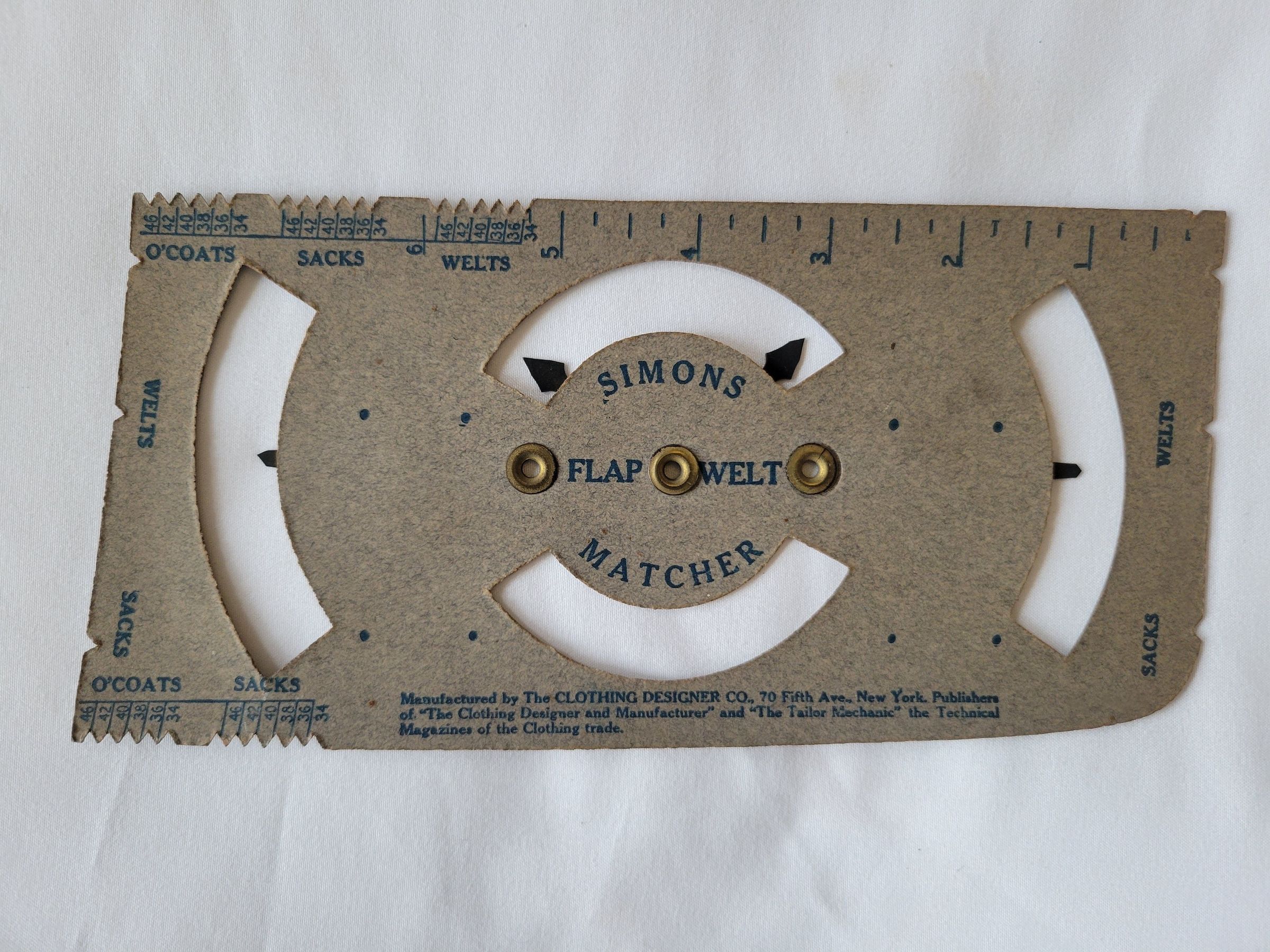 The Simons Flap Welt Matcher is a tool intended for tailoring professionals to aid the making of welt pockets with flaps. It is primarily made of cardboard and features a rule along one edge, four curved cut outs, and four rotatable metal arrows resembling clock hands. It was manufactured by the Clothing Designer Co. of 70 Fifth Ave, New York.Collection