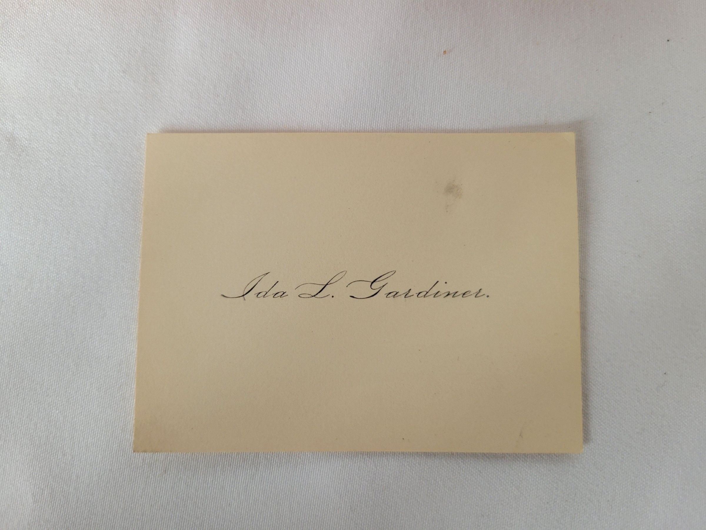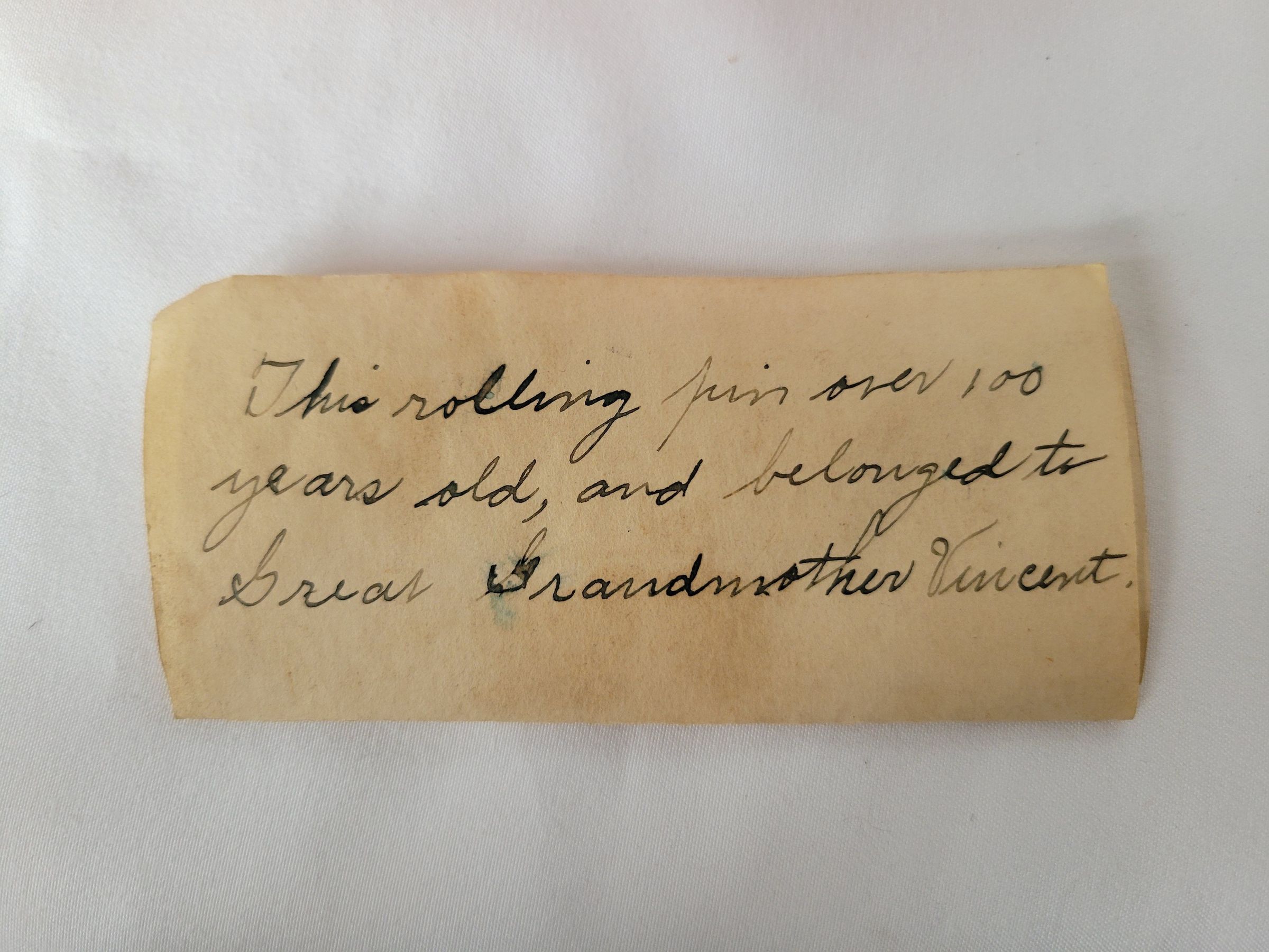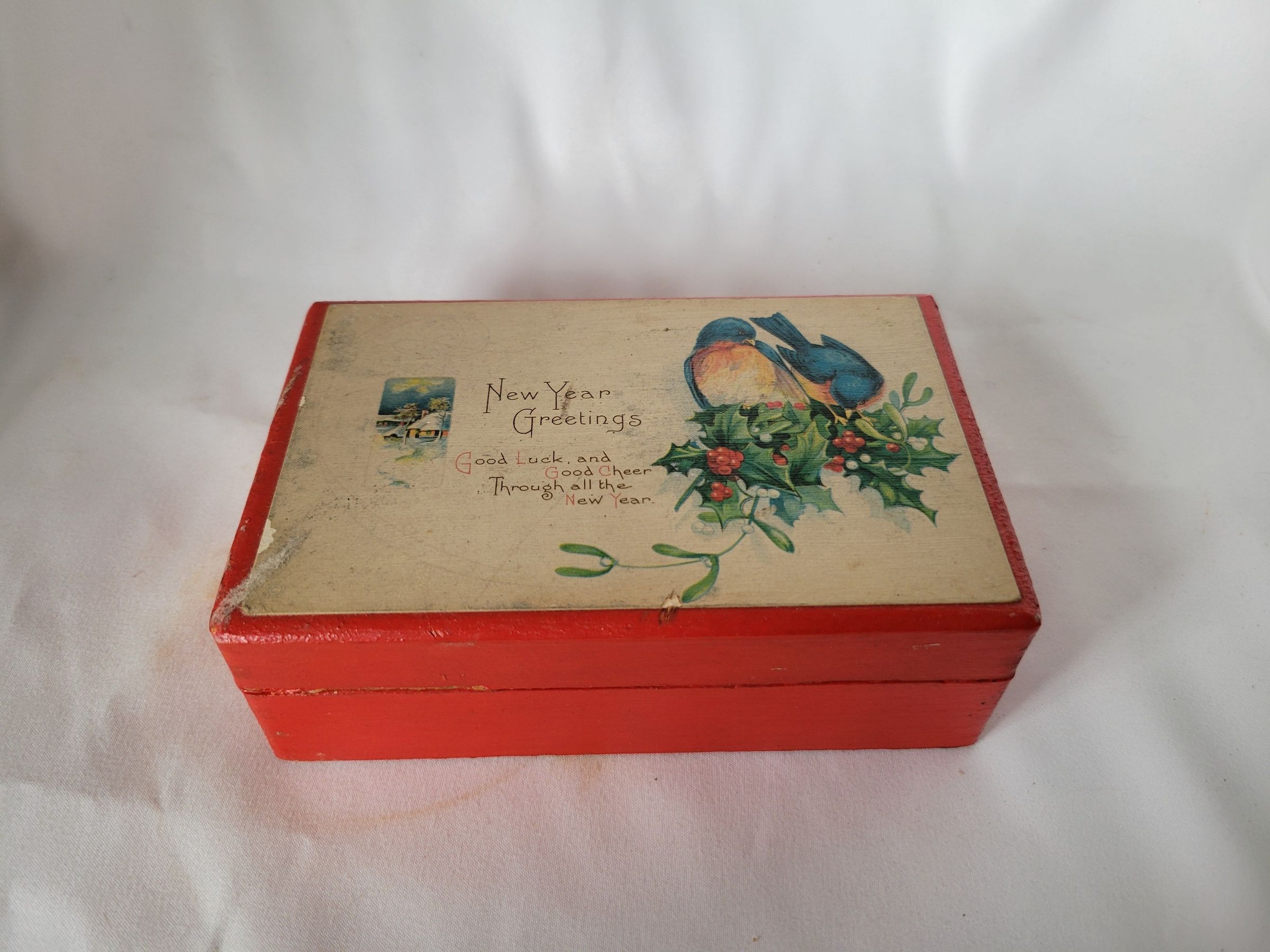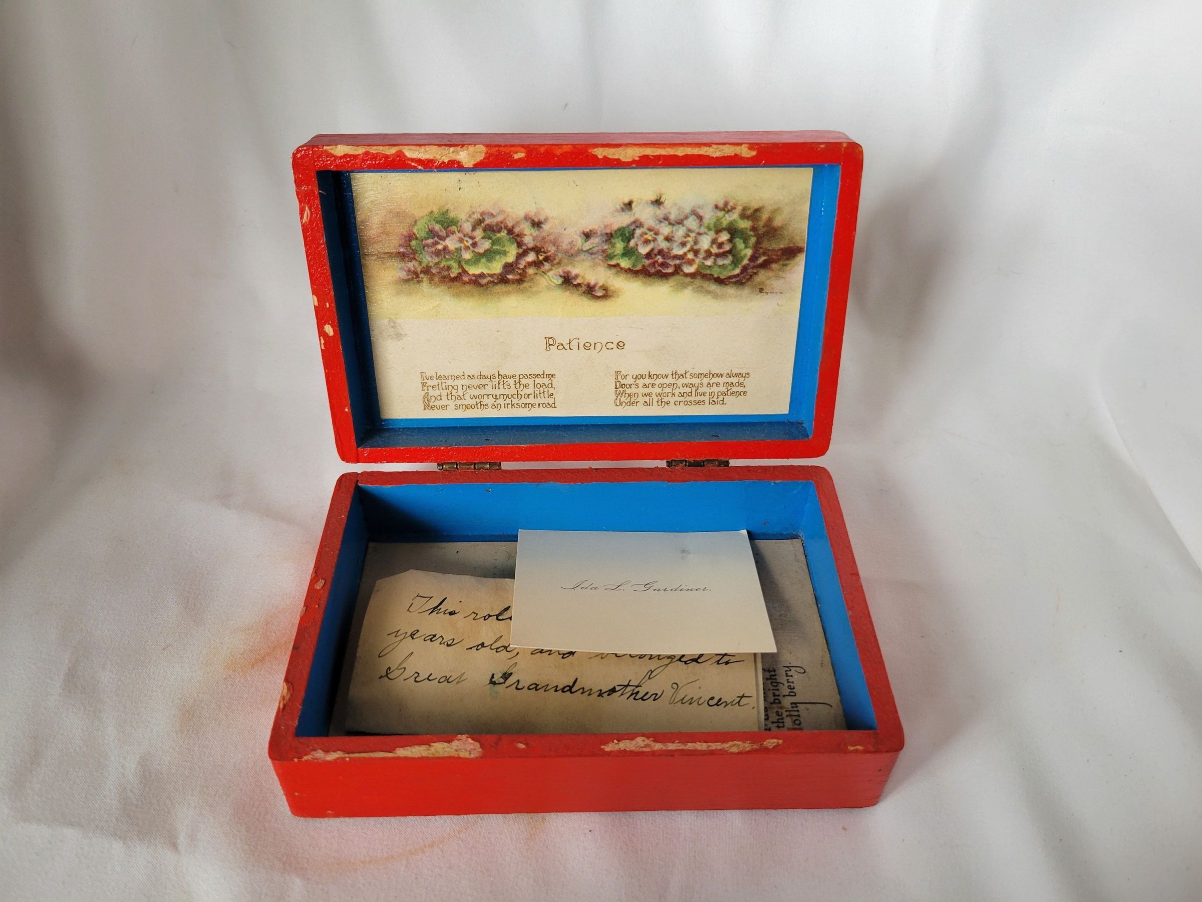 A wooden box which has been painted and decoupaged with greeting cards circa 1900. Inside are two pieces of paper, one with a printed name and handwritten note on the back, the other a handwritten note referencing a rolling pin which is not included. The box is in good condition, though the inside lip has some of the paint torn off.Collection
