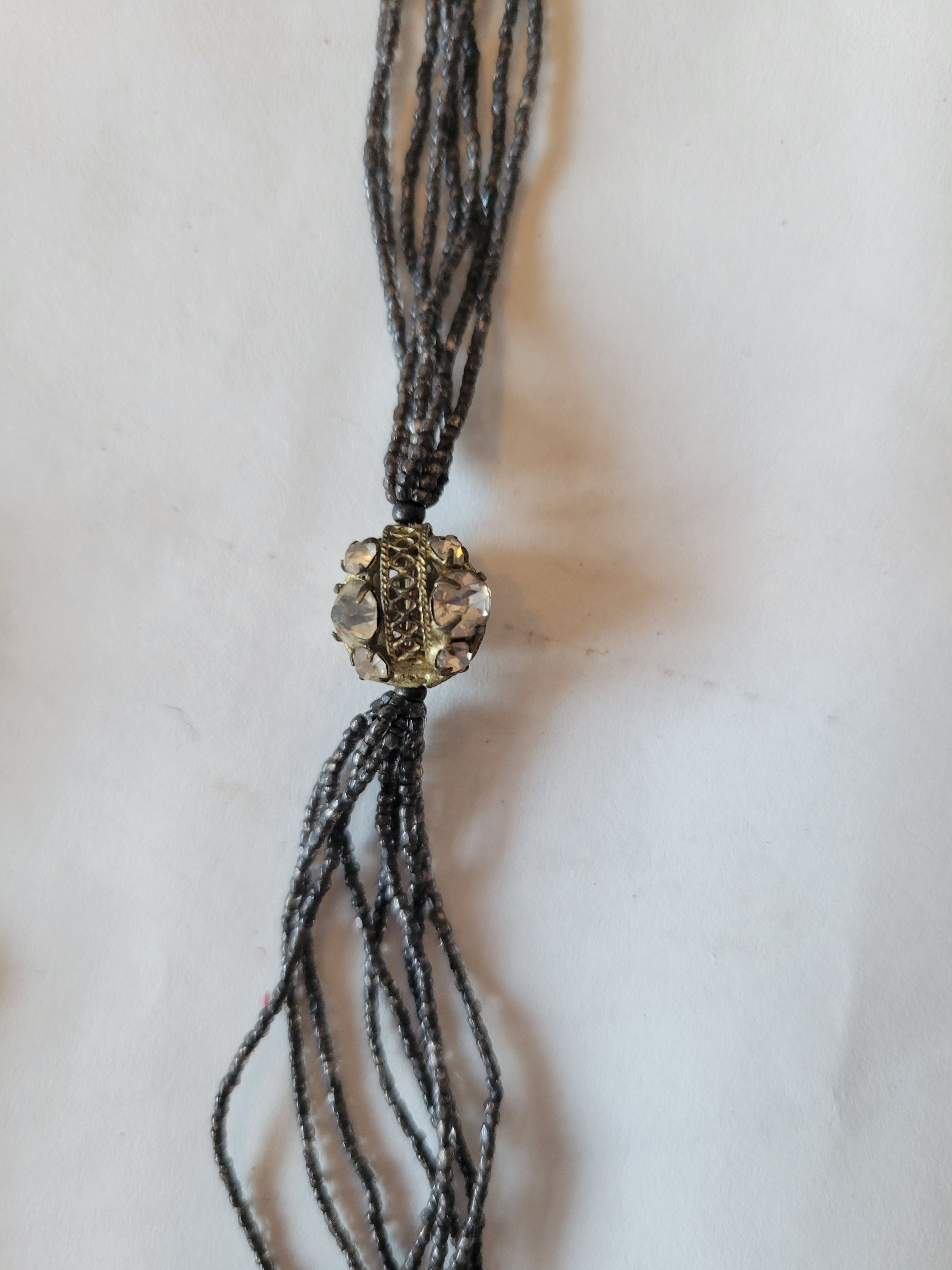 A grey and black beaded art deco style necklace. These types of long beaded necklaces were popular in the 1920s and into the 1930s. This necklace is broken at the top, a few of the beaded strands are loose.Collection