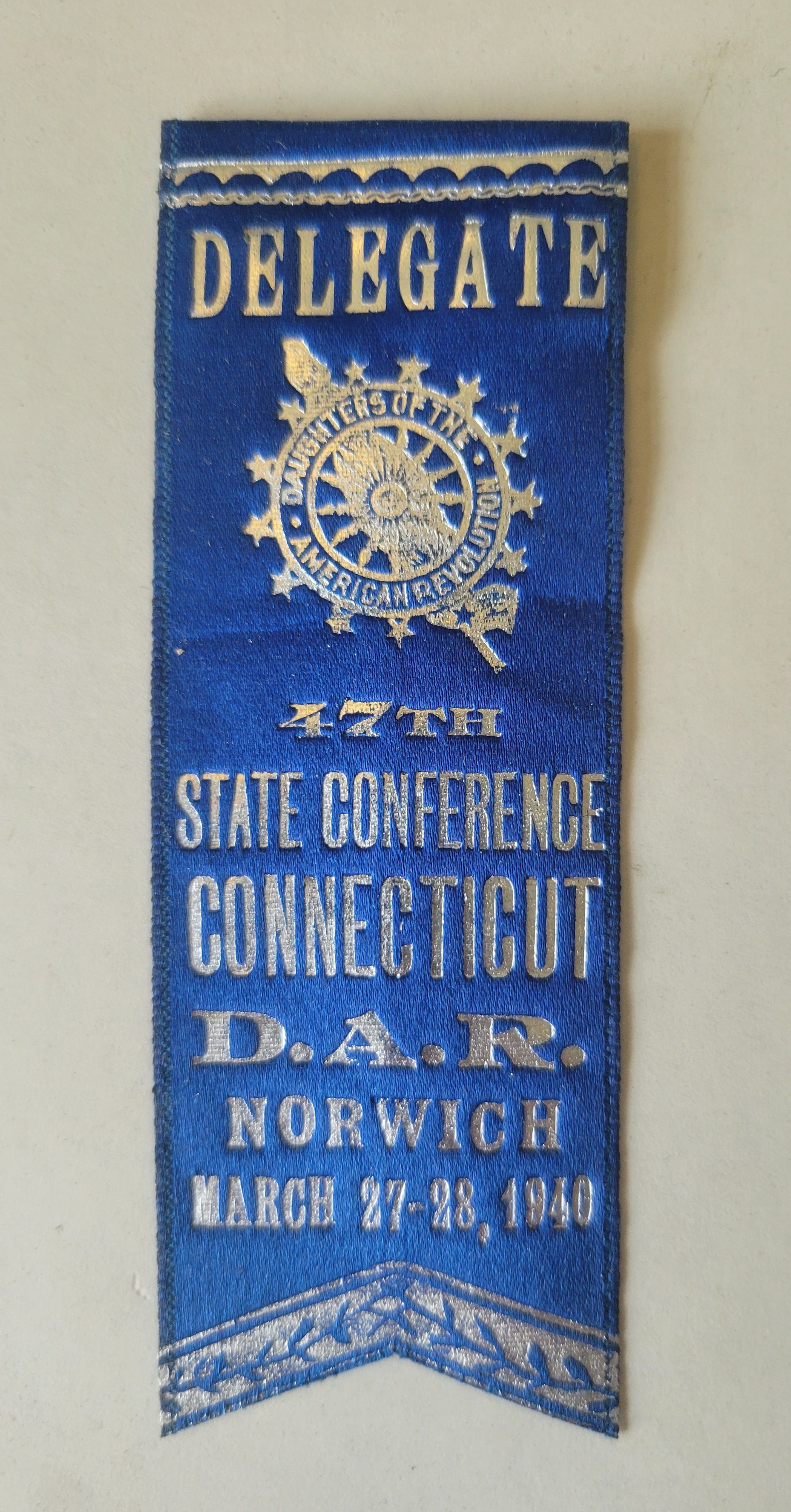 A delegate ribbon pin from the 47th State Conference of the Connecticut Daughters of the American Revolution. Dated March 27-28, 1940. A safety pin is attached at the back, where the manufacturer is listed as H.L. Wohlfarth of Brentwood MD.Collection