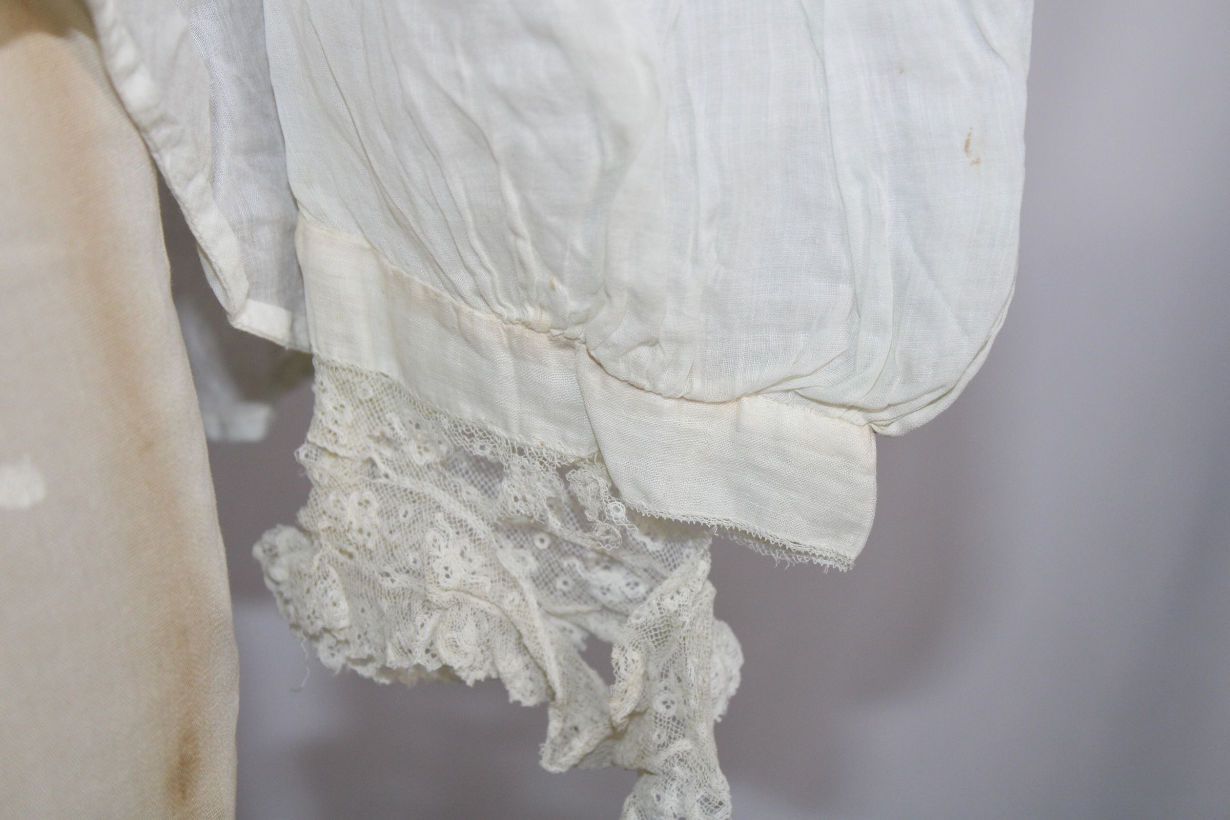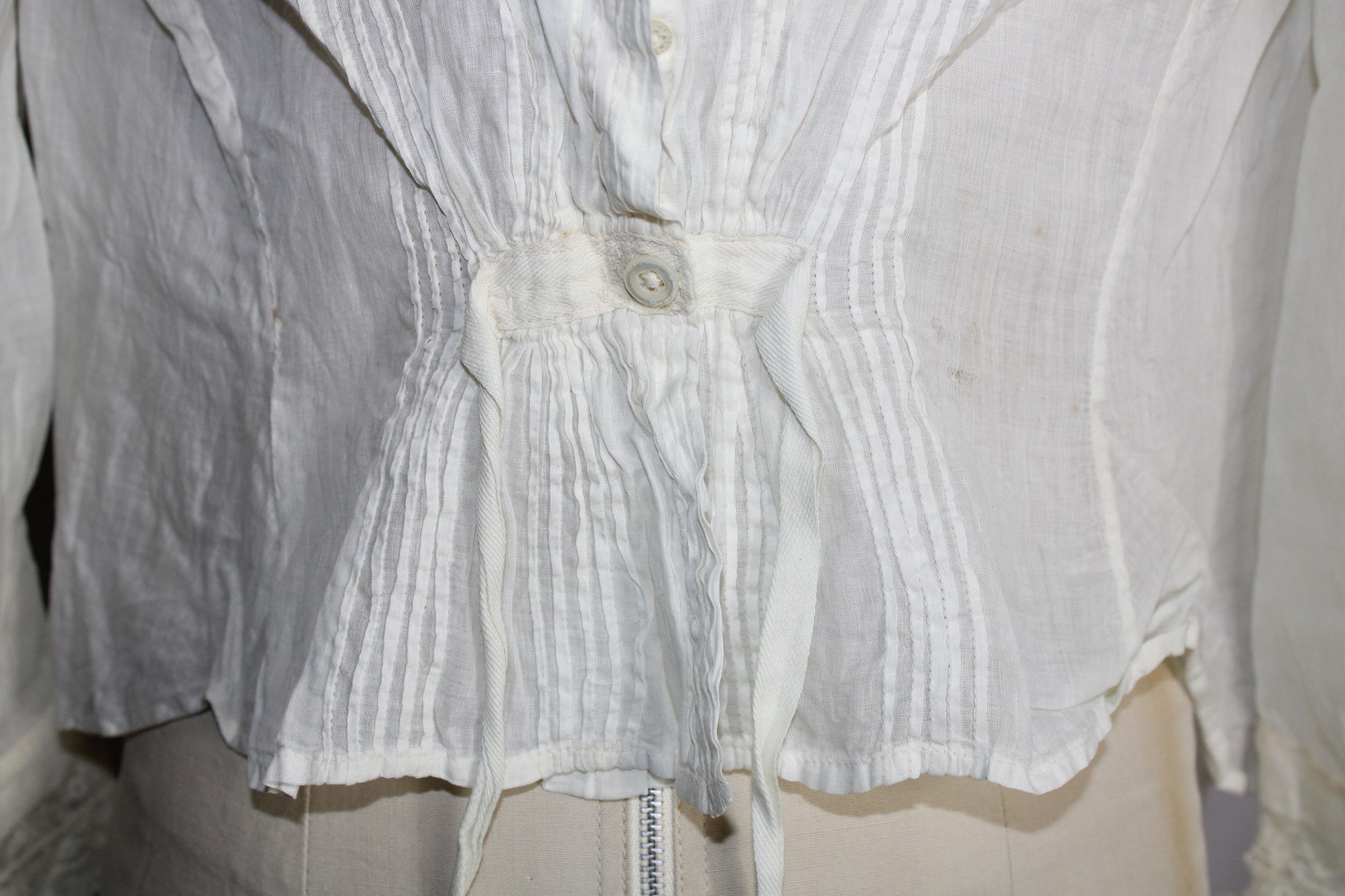 Likely Edwardian blouse with 1/16 inch pin tucks and lace insertion. Lace collar. Lace at sleeve ends beginning to detach. Button closure at back with cinching string.Collection