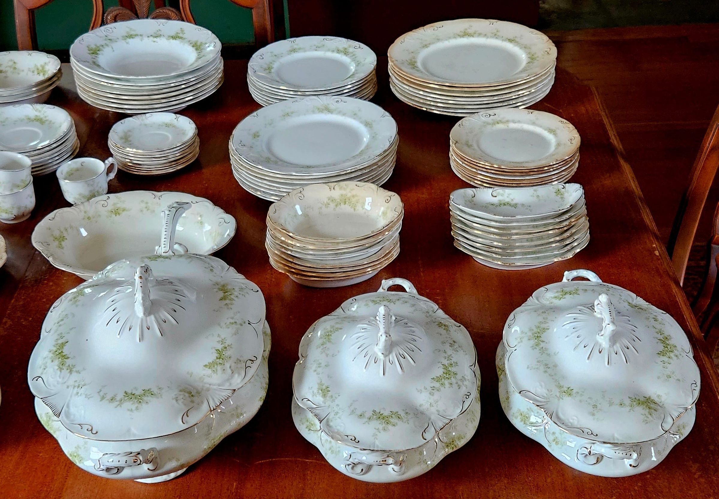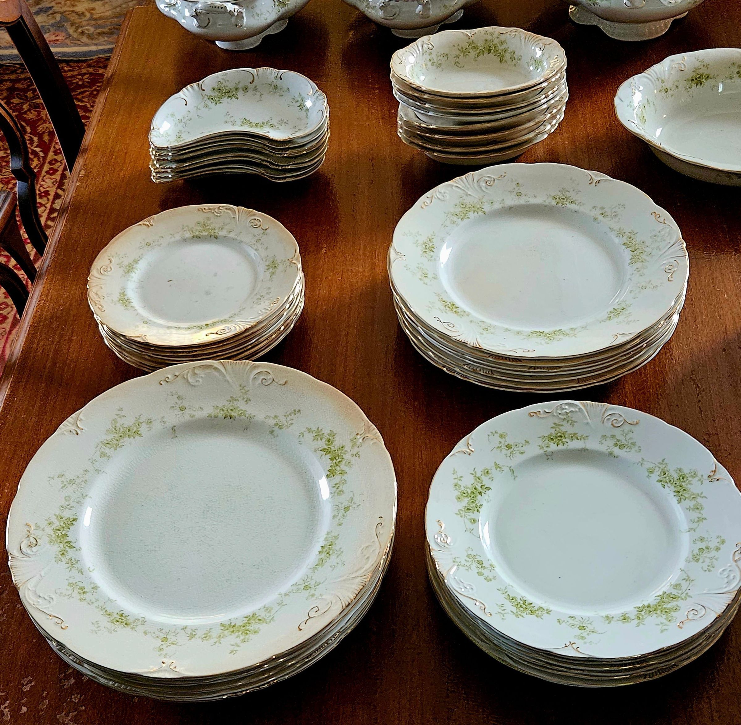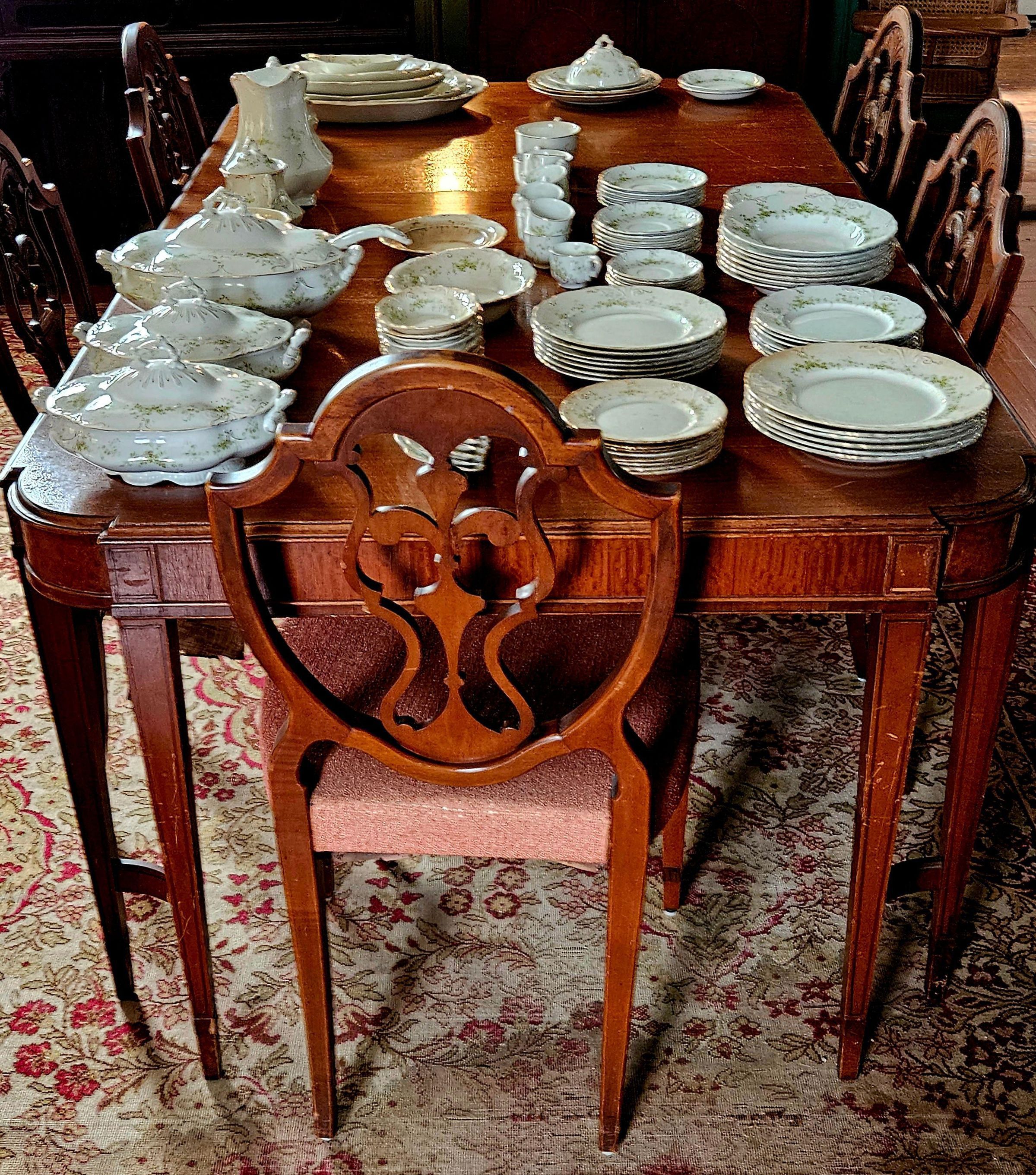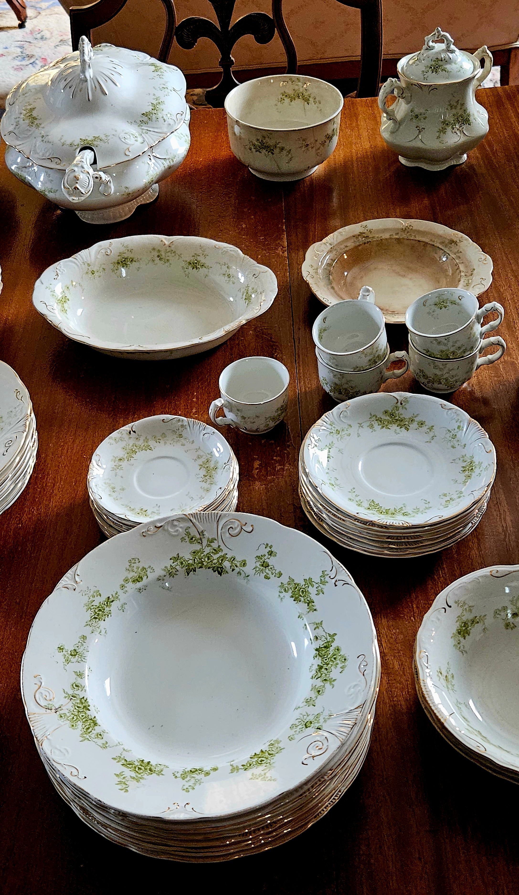 Semi-porcelain dinnerware set owned by Willimantic Mayor Oscar O. Tanner. Tanner was born 4 April 1858 and died 29 March 1933. He was mayor of the City of Willimantic 1898-1900 and 1904-1906. Tanner led the return to power in Willimantic of the Democratic party, which had been in the minority in Willimantic and Windham since before the Civil War. A saloon owner and boxing promoter, Tanner developed allies within Willimantic's immigrant communities, especially among Irish Americans. His protege and successor as mayor was Daniel (Danny) Dunn, Willimantic's first Irish American mayor. The dinnerware set was donated to the Mill Museum by Susan Humes of Willimantic, a relative of Tanner's Irish American housekeepers, Mary and Ellen Day. Tanner had left the set to one or both of the Day sisters, from whom it was passed along to the donor. It is not known when or how Tanner acquired the dinnerware, but a good guess would be that he bought through a mail order catalog sometime in the early 20th century, when he would have wanted to be able to entertain political allies and community leaders. The manufacturer's mark on the dinnerware was first used in the late 1890s, but was continued for many years afterwards.