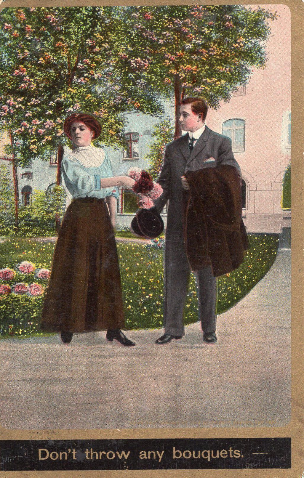 A postcard of a woman rejecting a bouquet a man is giving her with the words "Don't throw any bouquets" printed on it.Postcard Details