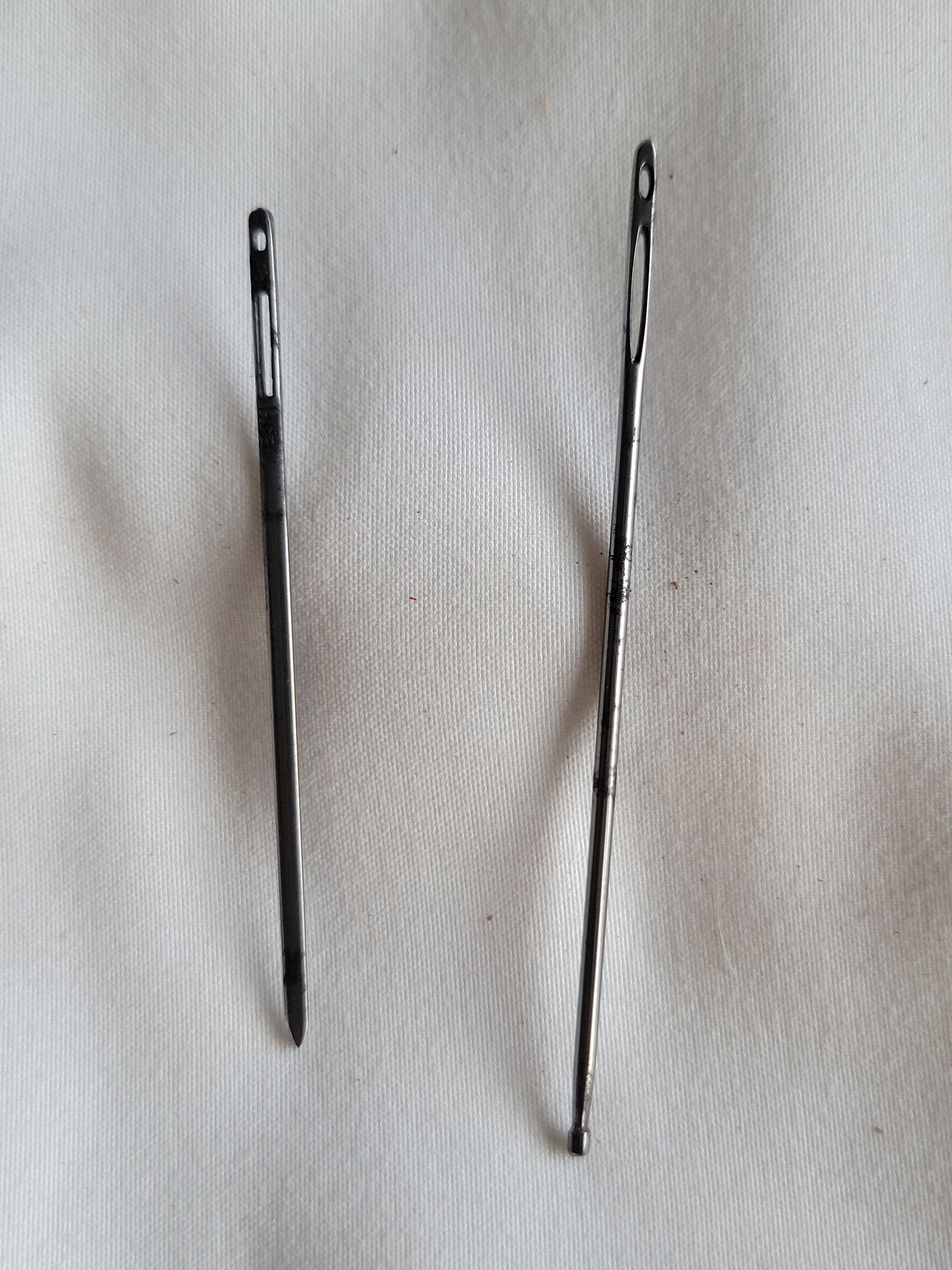 Double eyed needles such as these are used primarily for embroidery to carry two strands, usually two different colors, of thread at a time. The different tips, blunt and sharp, are used for different types of fabric depending on the density and composition of the material.Collection