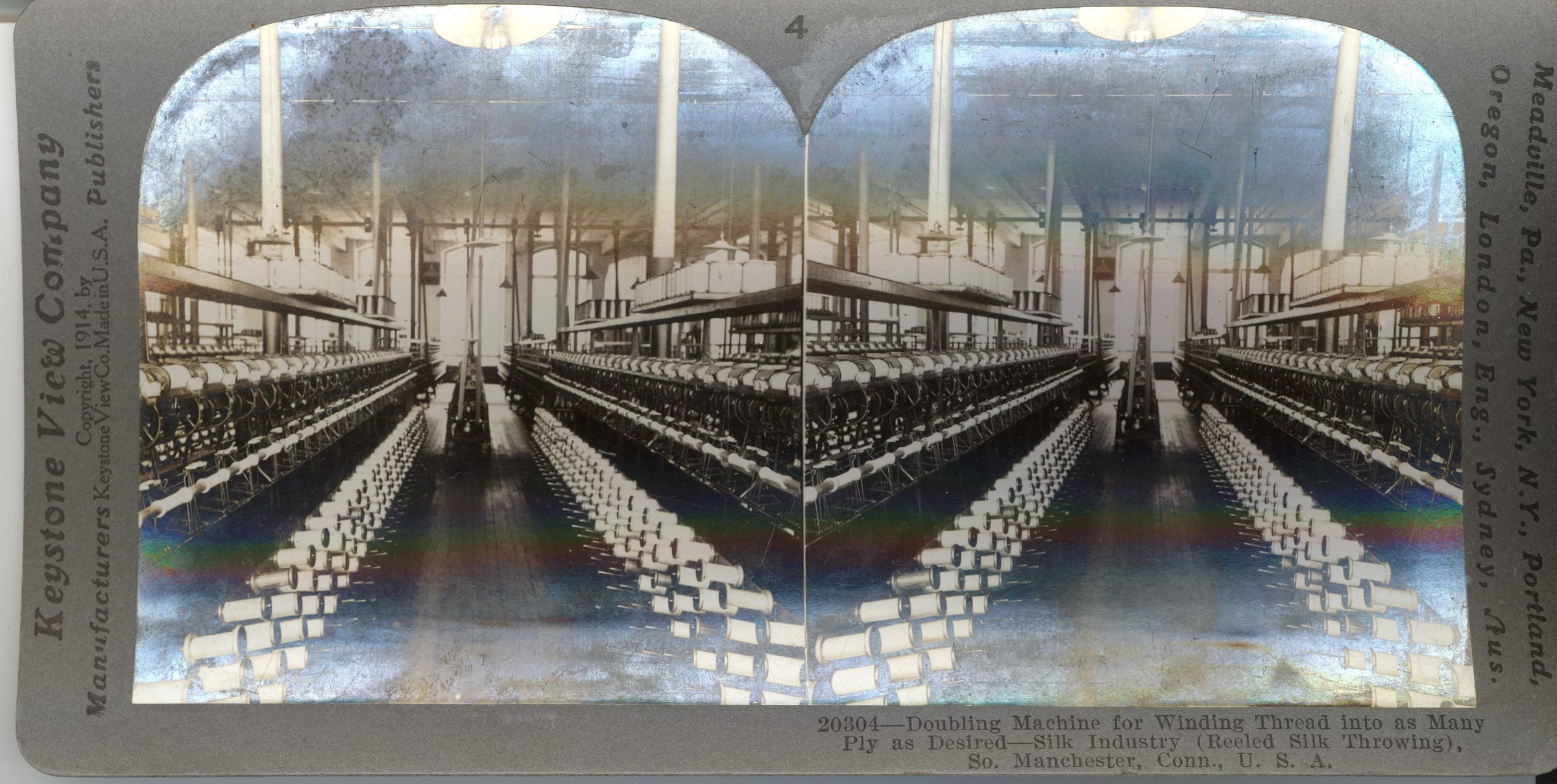 Stereograph of doubling machine for winding thread into as many ply as desired. At Cheney Brothers silk mills in South Manchester, CT 1914. Black and white print on cardboard. Card is warped. Unknown photographer. Studio: Keystone View Company, Meadville, PA. Serial #20304Photograph Details