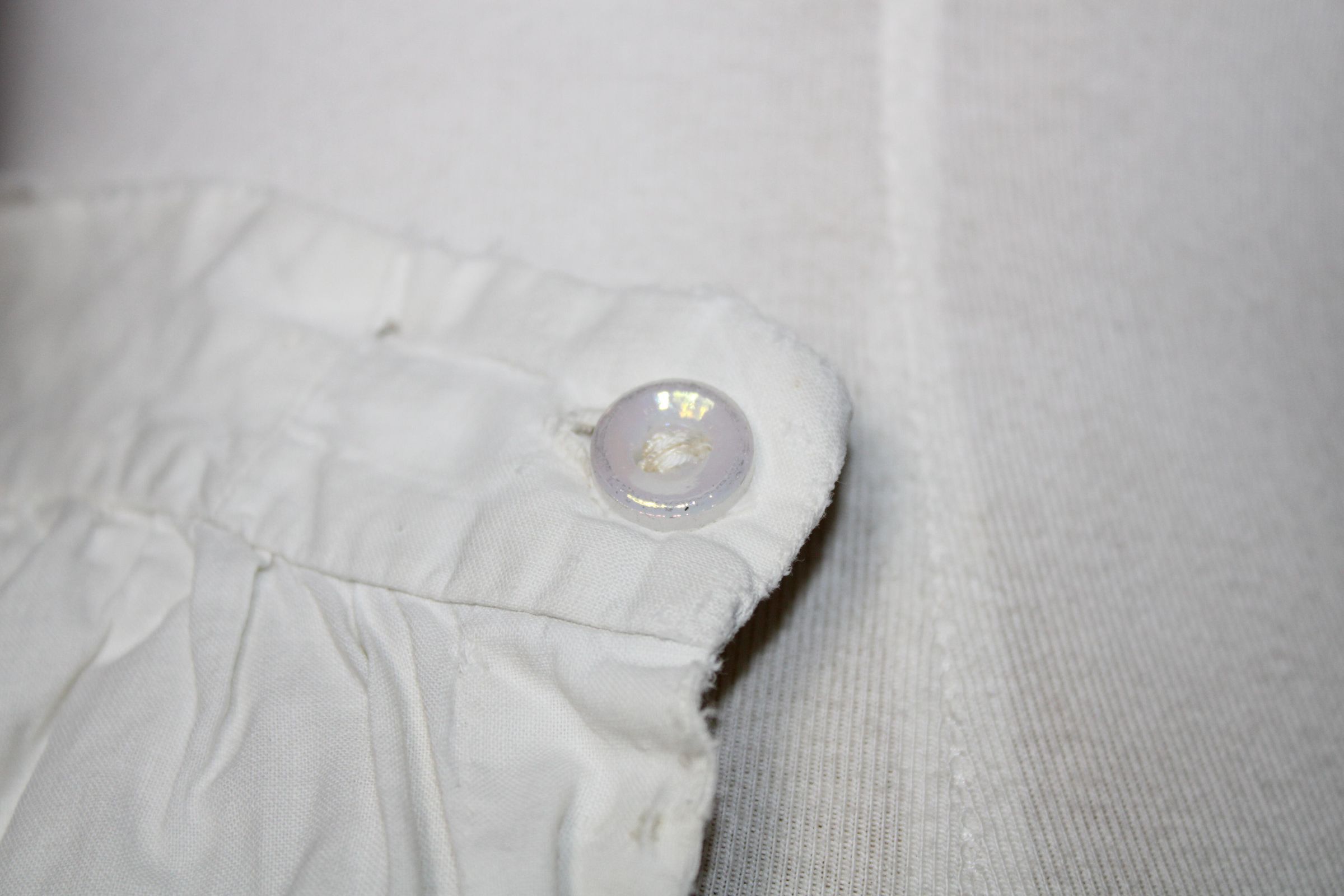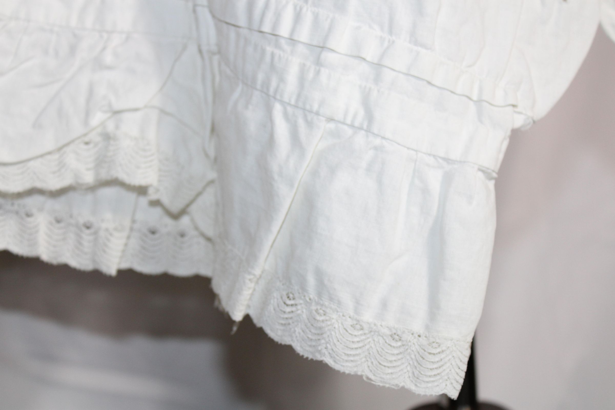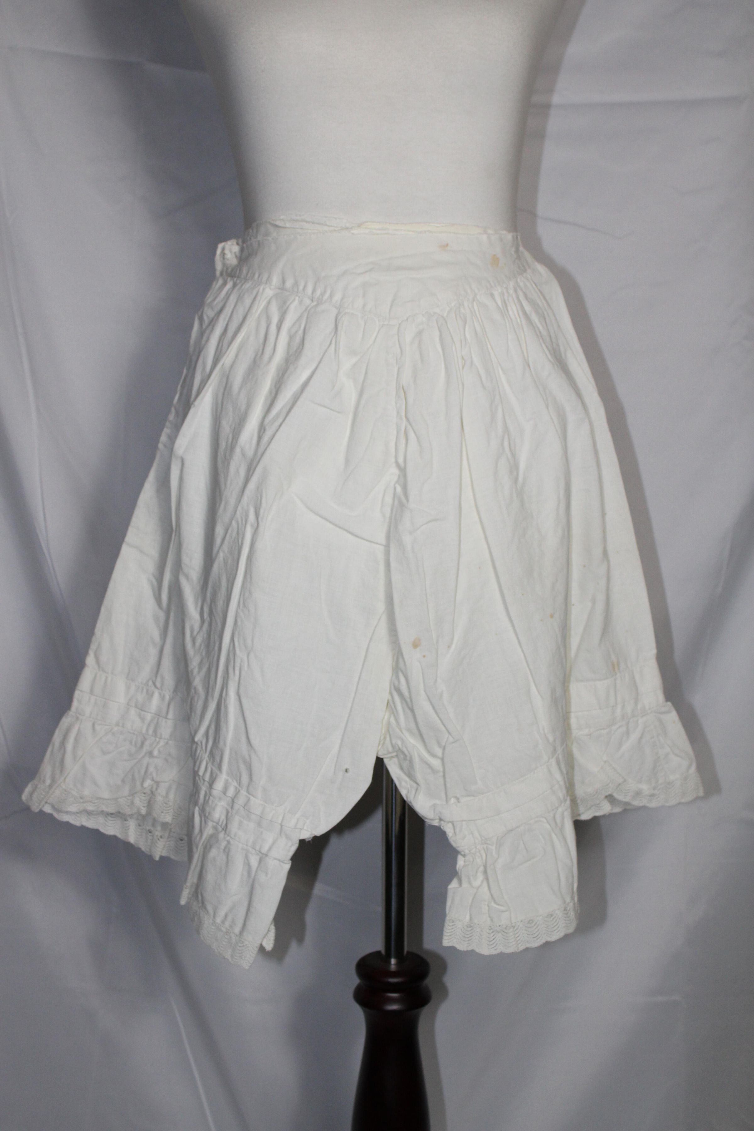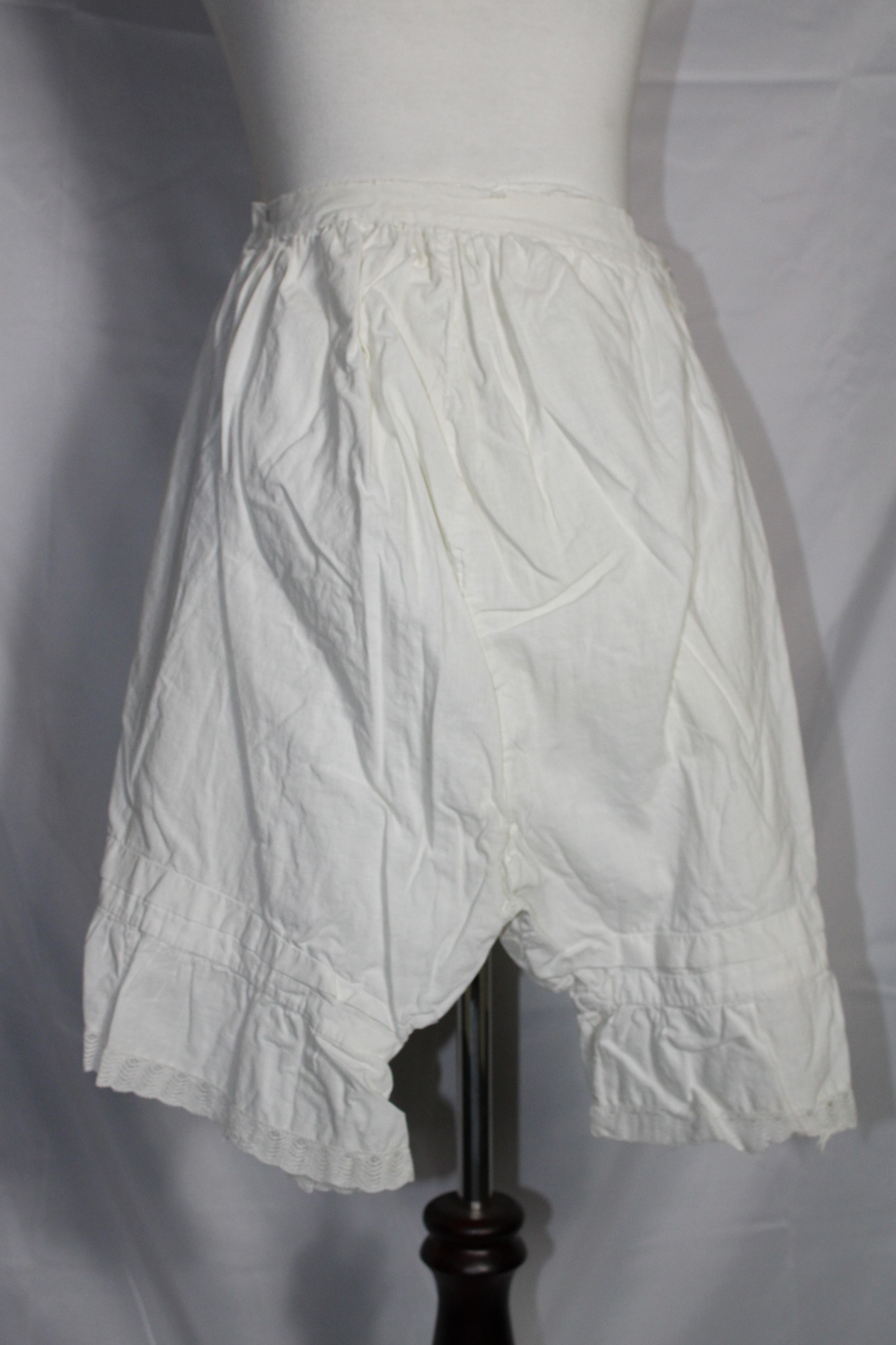Pair of drawers with a triangular yoke. Button closure. Decorated with large pin tucks and lace at the hem. Diamond gusset at crotch.Clothing/Dress/Costume Details