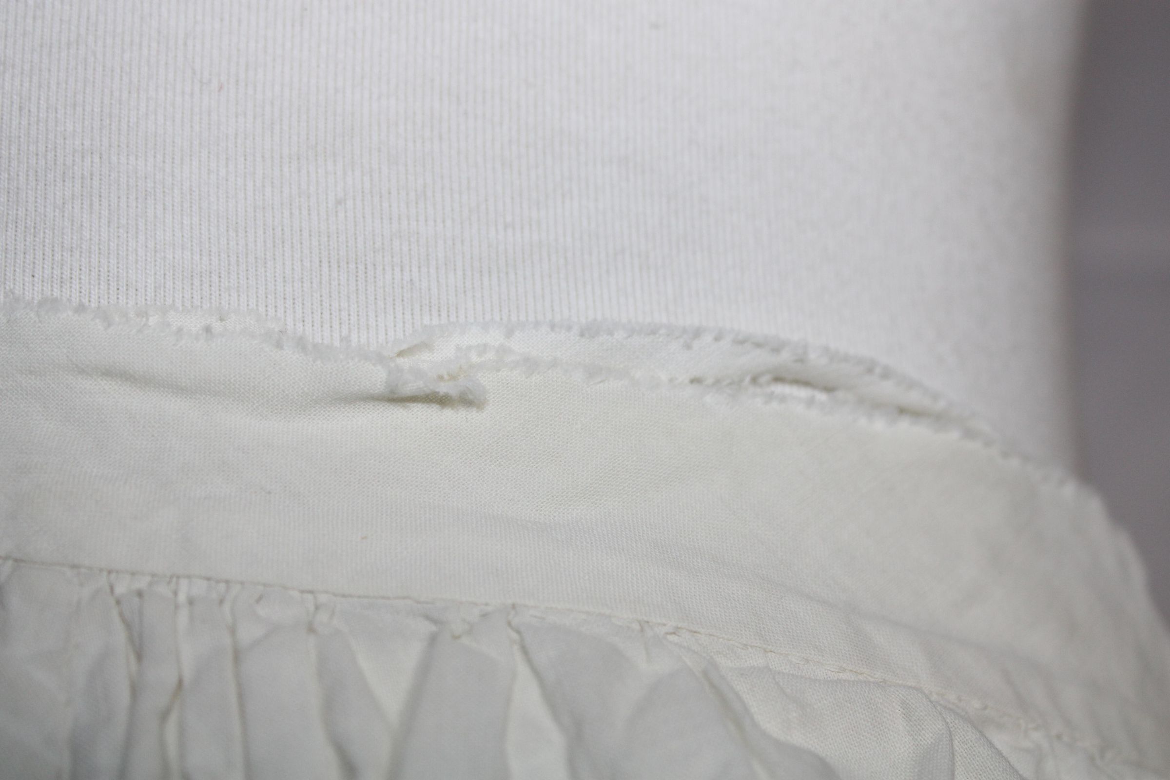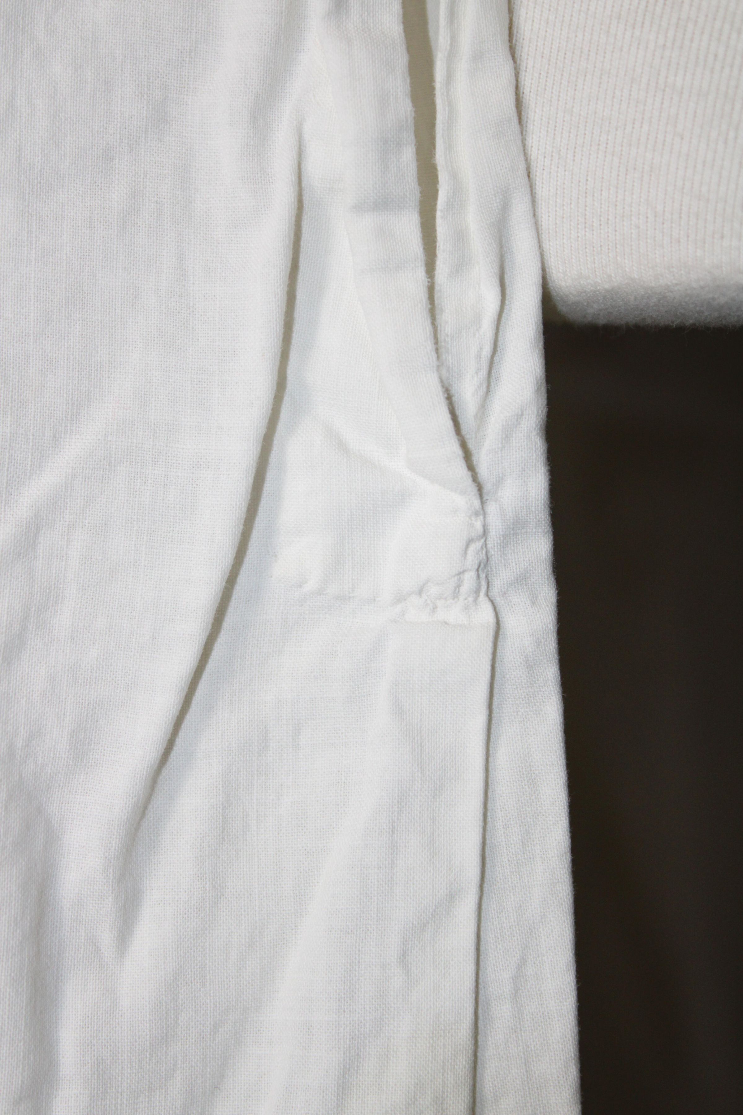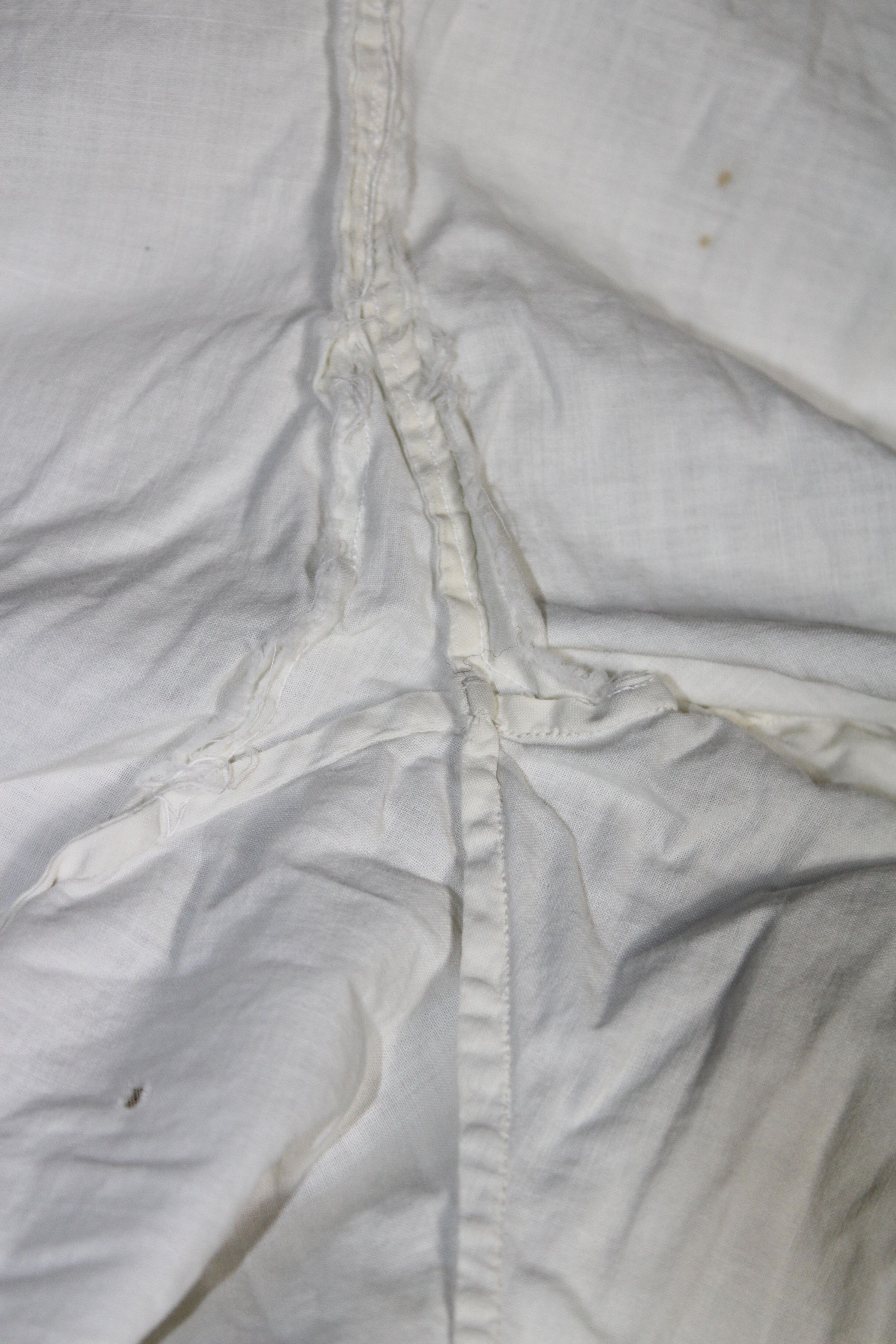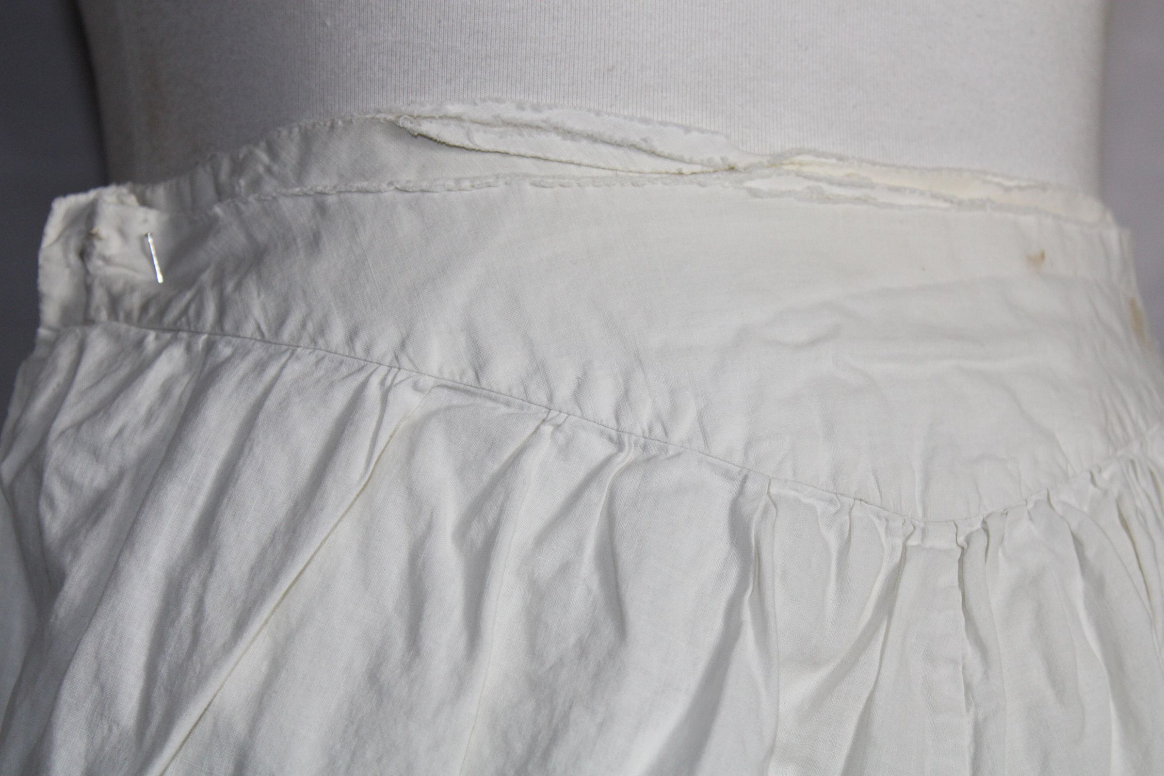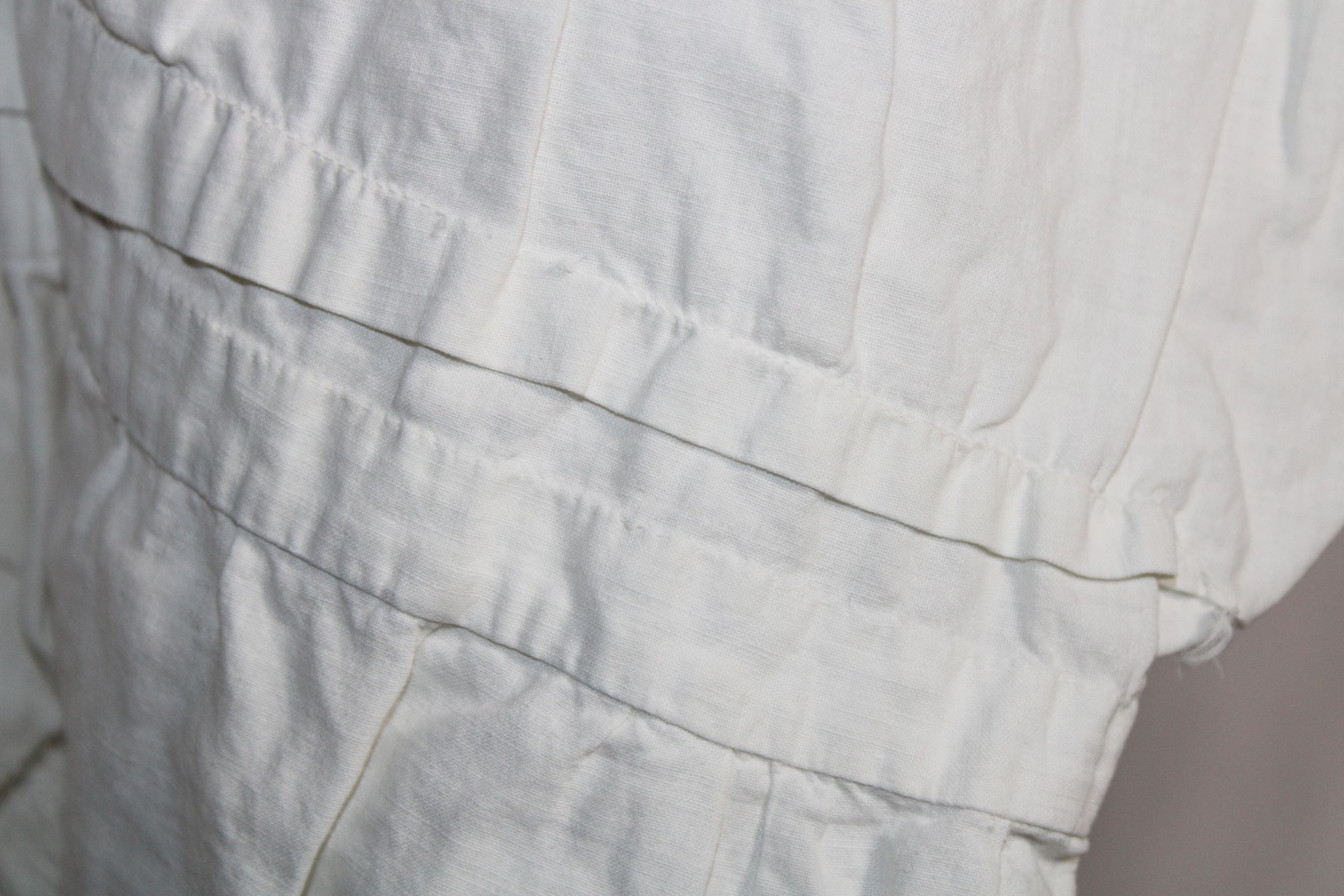 Pair of drawers with a triangular yoke. Button closure. Decorated with large pin tucks and lace at the hem. Diamond gusset at crotch.Clothing/Dress/Costume Details