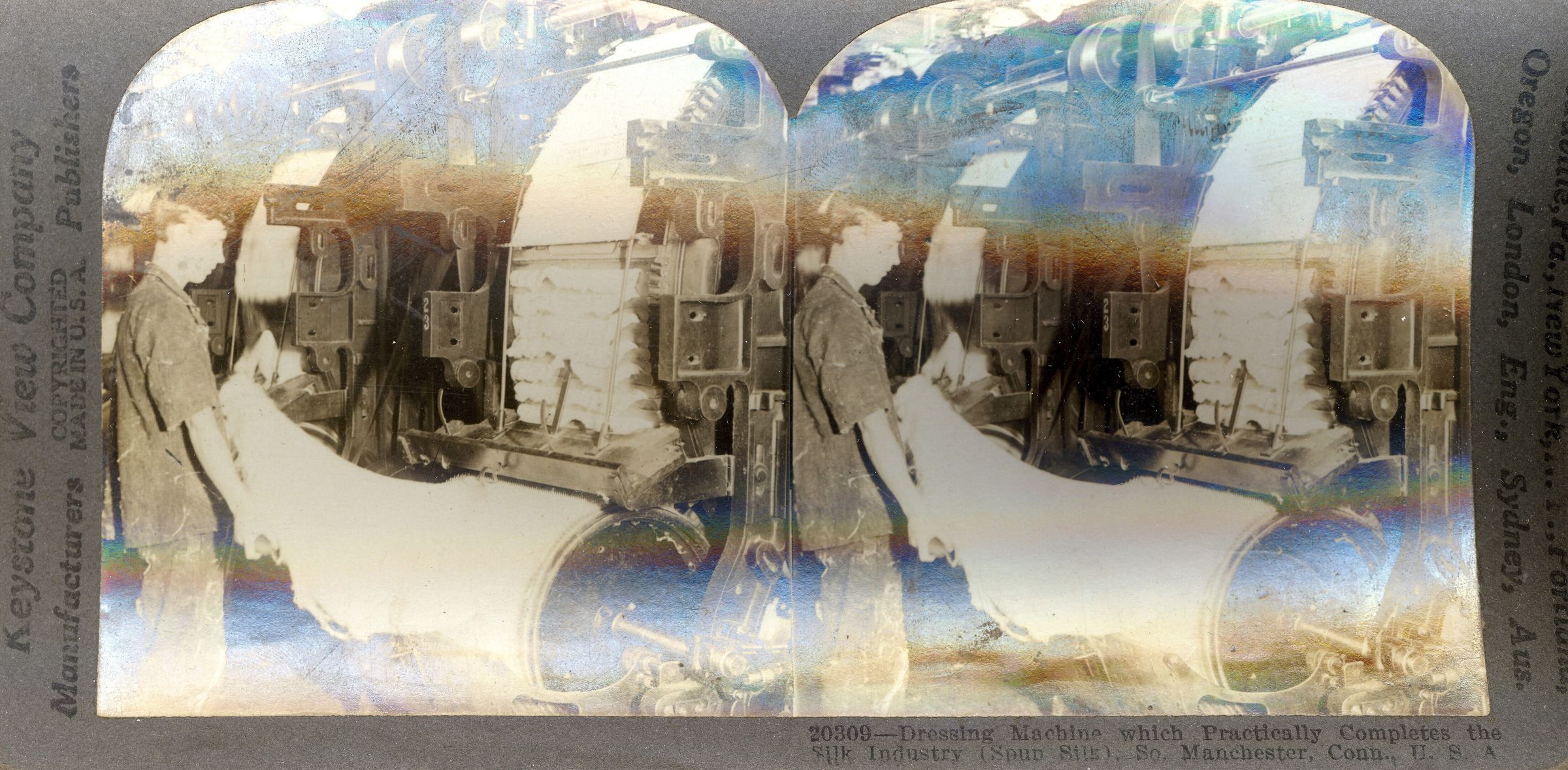 Stereograph of silk workers operating dressing machines at Cheney Brothers silk mills in South Manchester, CT, 1914. Black and white print on cardboard. Card is warped. Unknown photographer. Studio: Keystone View Company, Meadville, PA. Serial #20309.Photograph Details