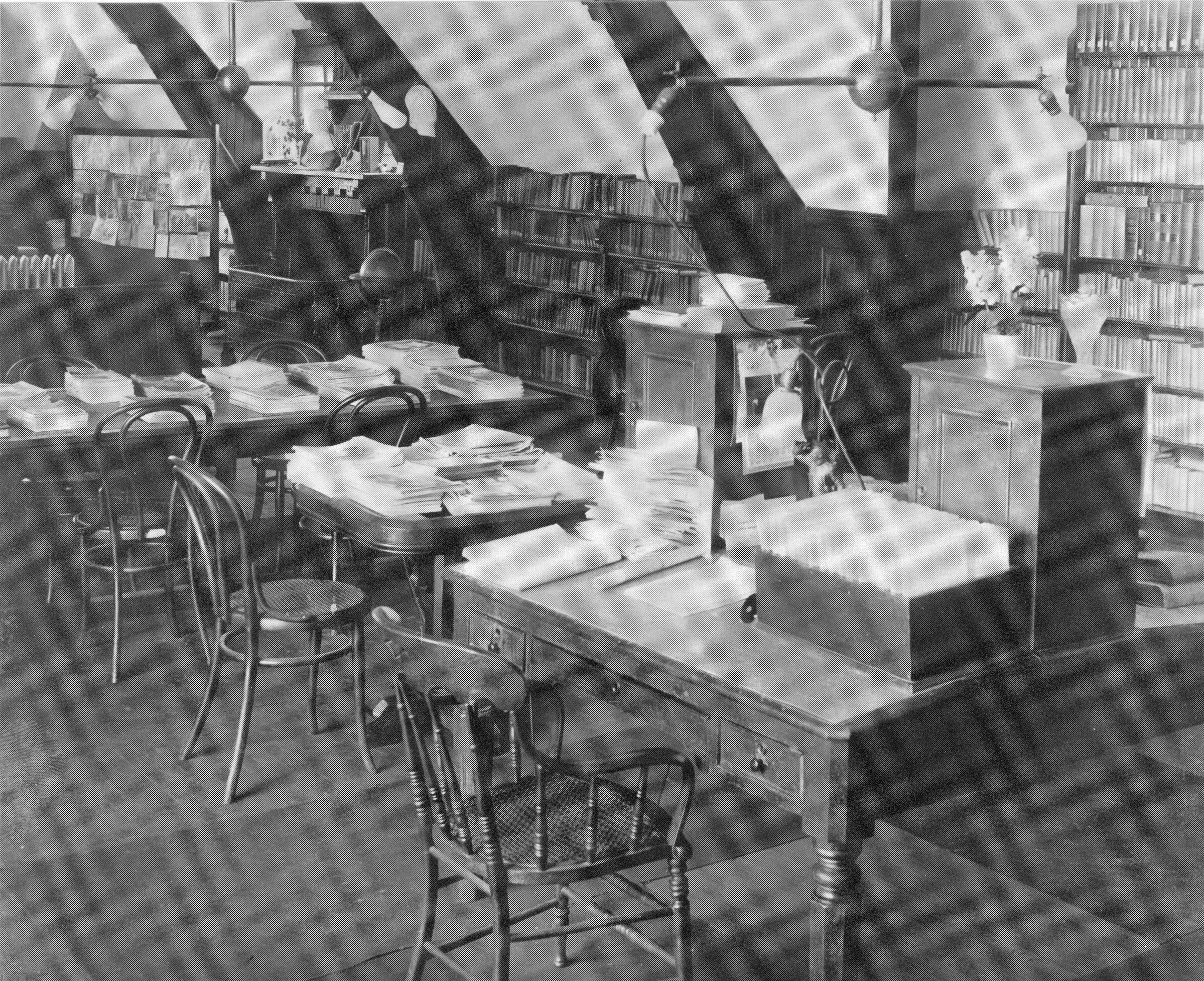 Black and white photographic print of the interior of Dunham Hall Library, located on the third floor of the Willimantic Linen Company's company store (now the Mill Museum), Willimantic, CT. Unknown photographer. Taken c. 1890.Photograph Details