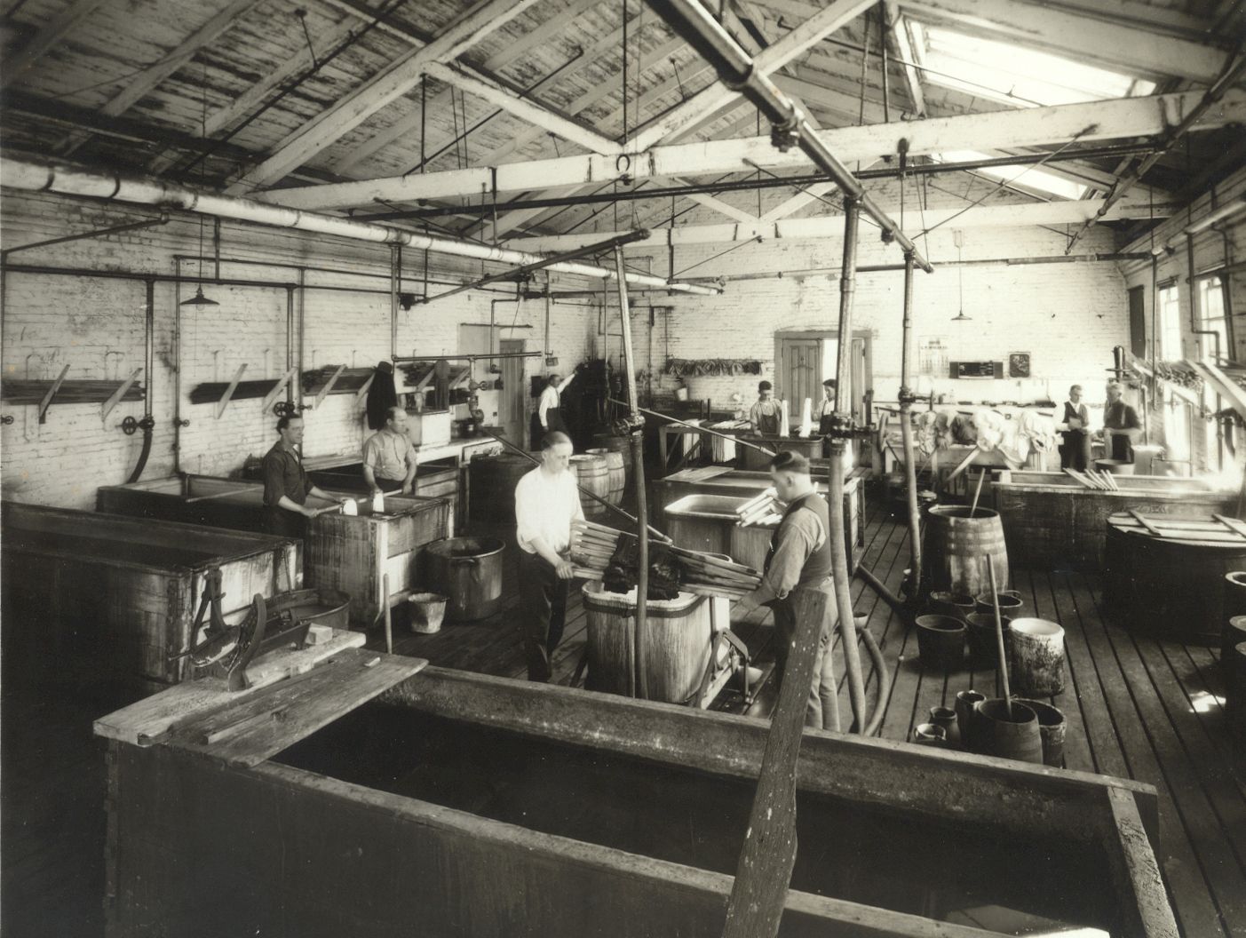 Photograph of unidentified workers in a textile mill dye house, possibly the American Thread Company of Willimantic, CT. Black and white gelatin print. Circa 1900. Unknown photographer.Photograph Details