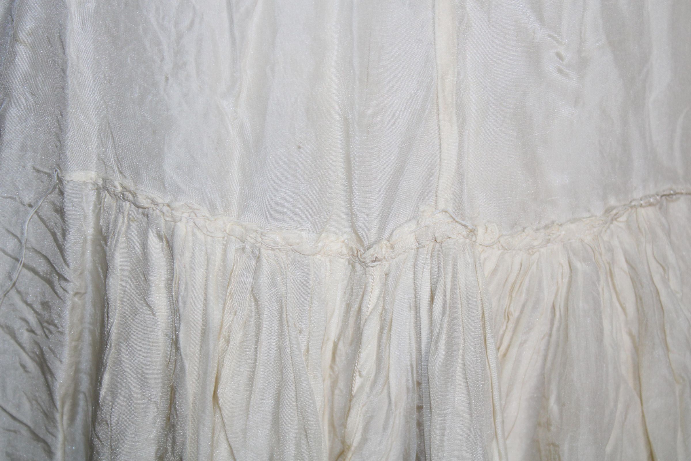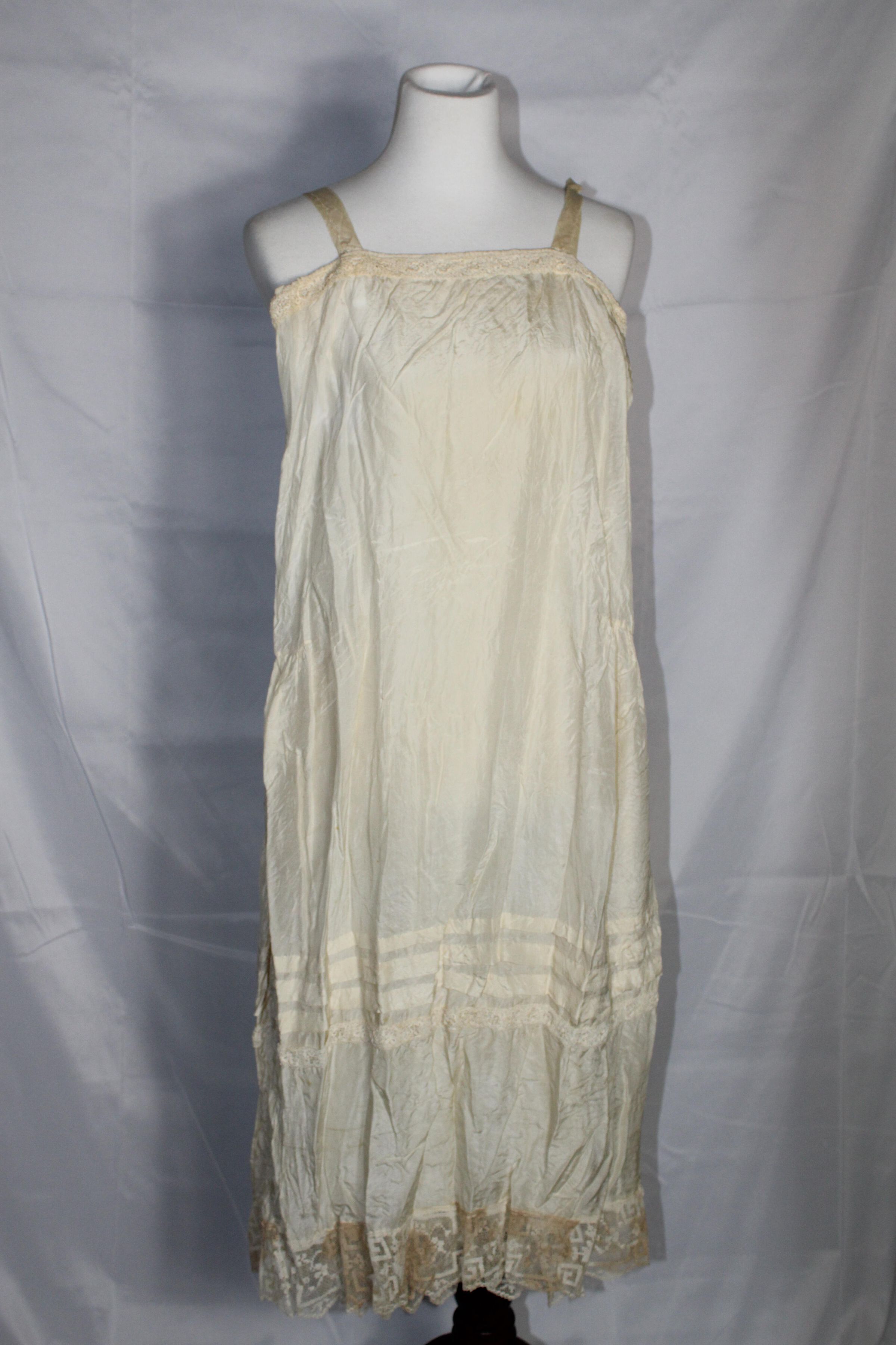 Lightweight slip decorated with crochet lace and pin tucks. Geometric bobbin lace along hem. Small darning spots on front bust.Collection