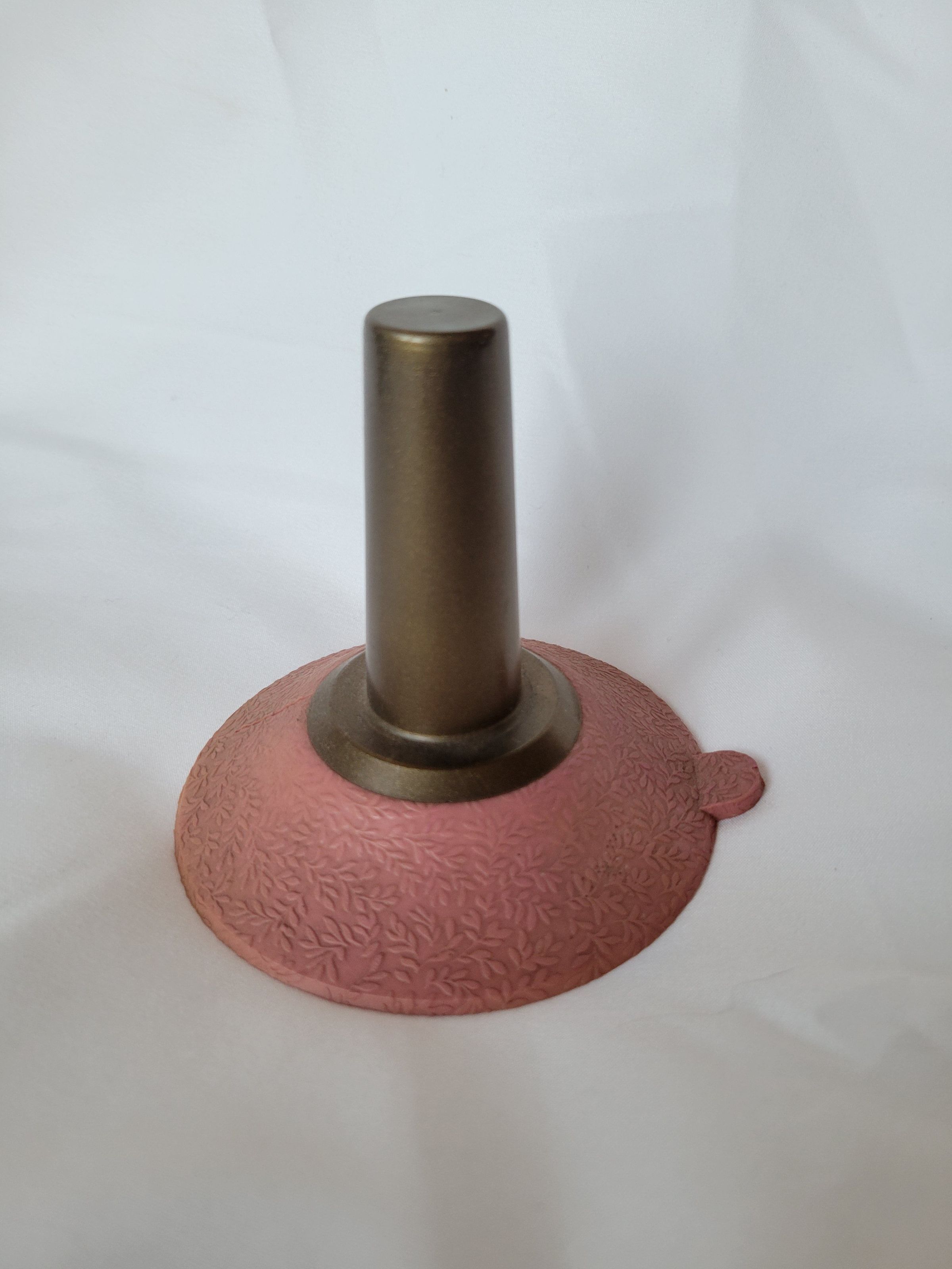A suction cup base for a wig or hat mannequin. The pink base would suction to a dresser top so that the shaft could be inserted into the bottom of the mannequin head. The head would then typically hold a hat or wig (pinned on to the fabric-covered or styrofoam head) while not in use to maintain the shape and style. The suction cup is stained but otherwise in good condition.Collection