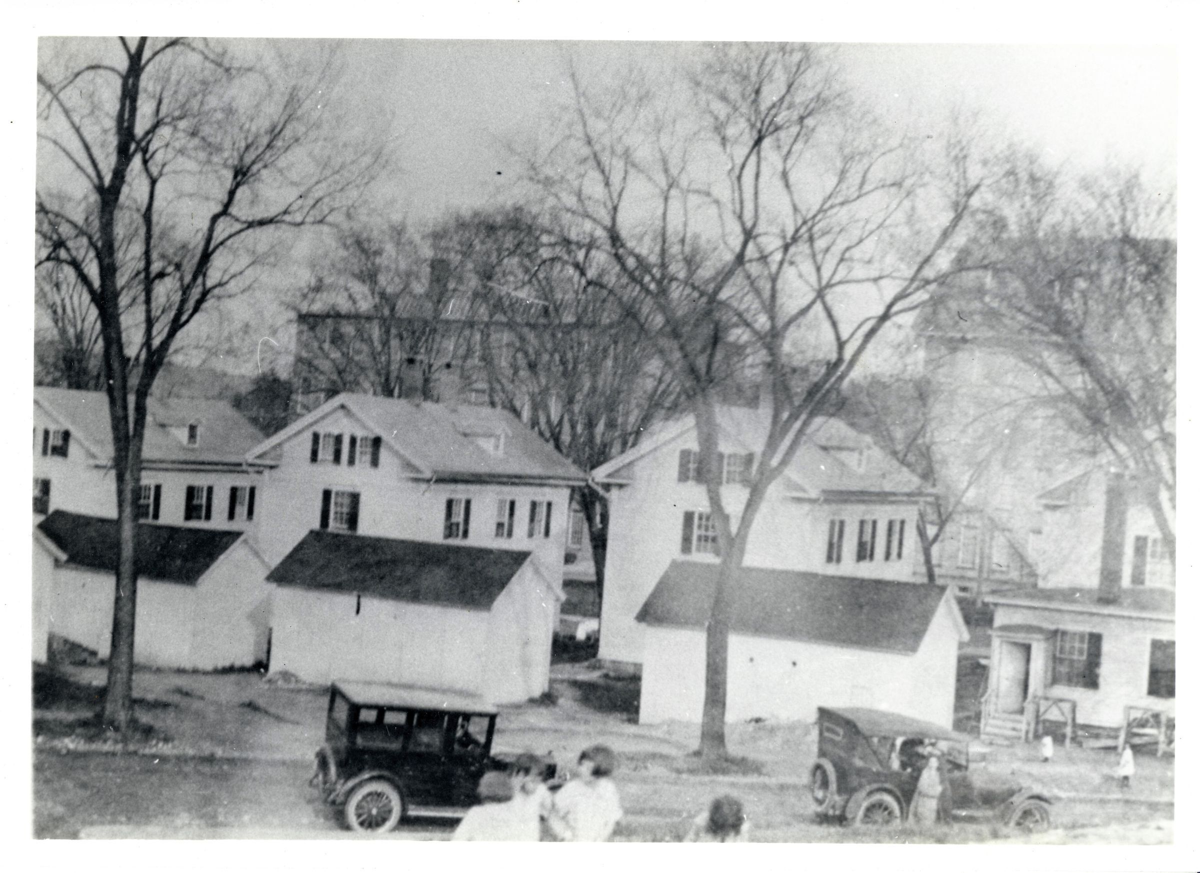 Black and white photographic print of mill worker housing in the Iverton (Model Village) neighborhood, American Thread Company, Willimantic, CT. Taken from in back of the houses, showing sheds/privies. Mill No. 2 in the background. Unknown photographer. Taken c. 1925.Photograph Details