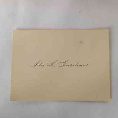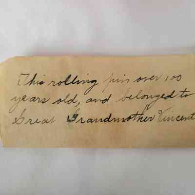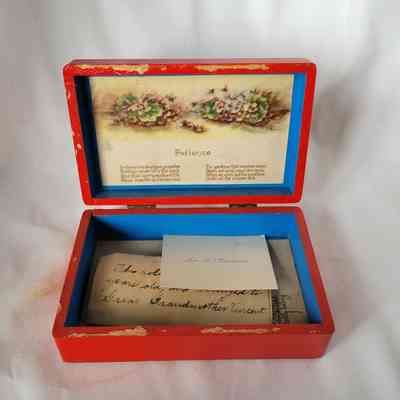 A wooden box which has been painted and decoupaged with greeting cards circa 1900. Inside are two pieces of paper, one with a printed name and handwritten note on the back, the other a handwritten note referencing a rolling pin which is not included. The box is in good condition, though the inside lip has some of the paint torn off.Collection