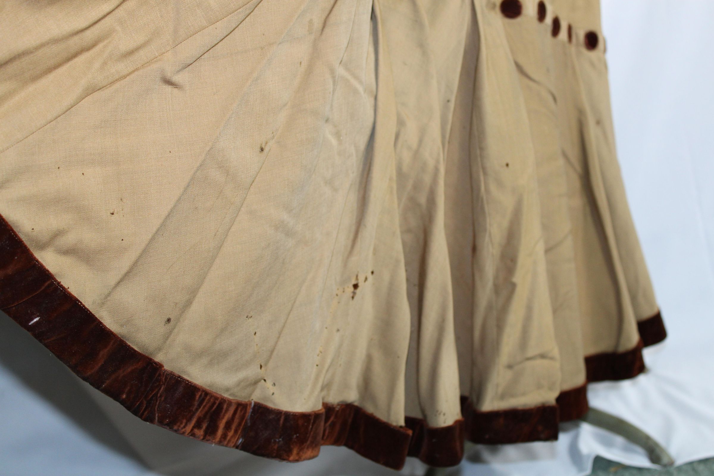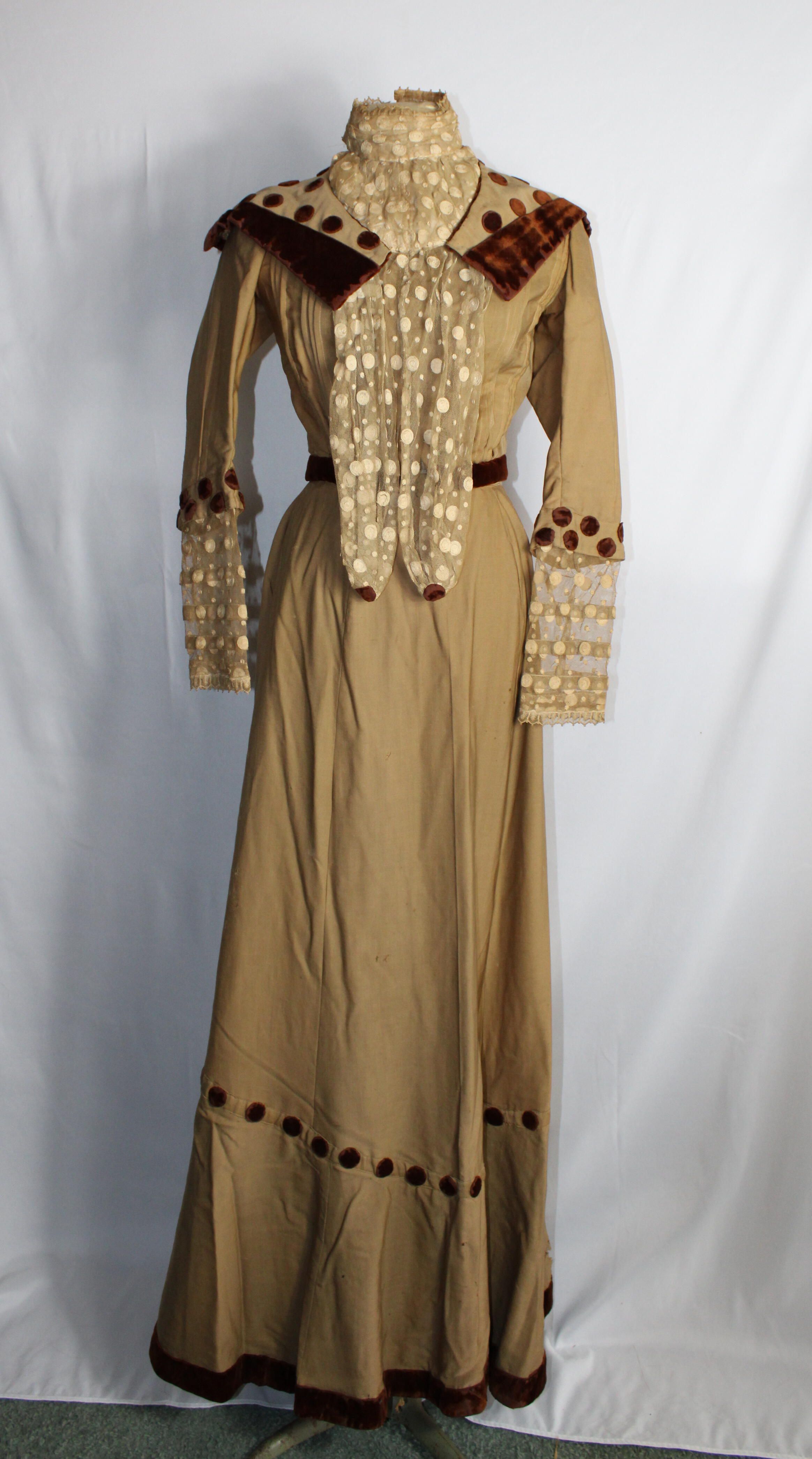 An Edwardian dress, likely a day or afternoon garment. Consists of a skirt and boned jacket. Made of silk with velvet details at the collar, sleeve ends, waist, and skirt hem. The skirt lining is pieced.Collection