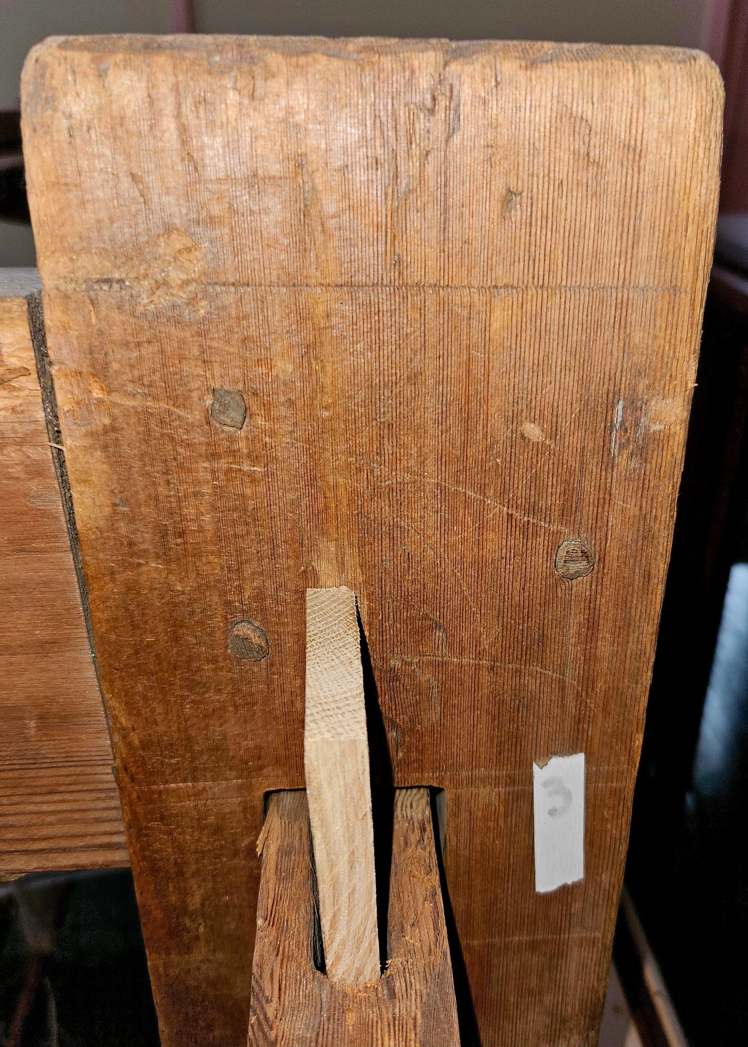 Except for an iron gear, the loom is made entirely of wood, held together by wooden pegs, joints, and wedges. The wood reed and and string heddles were added by Museum staff, along with several wooden parts. New parts are made of unfinished new wood, so that they are easy to identify.Location