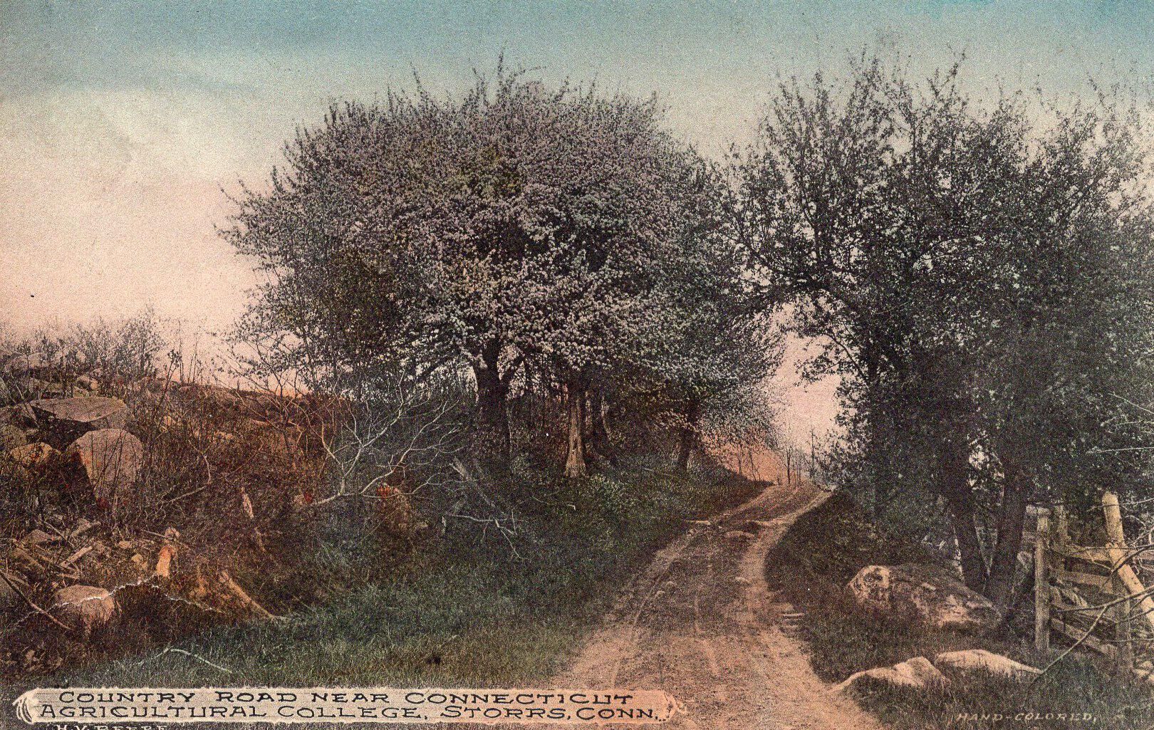 A postcard of a country road near the Connecticut Agricultural College in Storrs, Conn.Condition