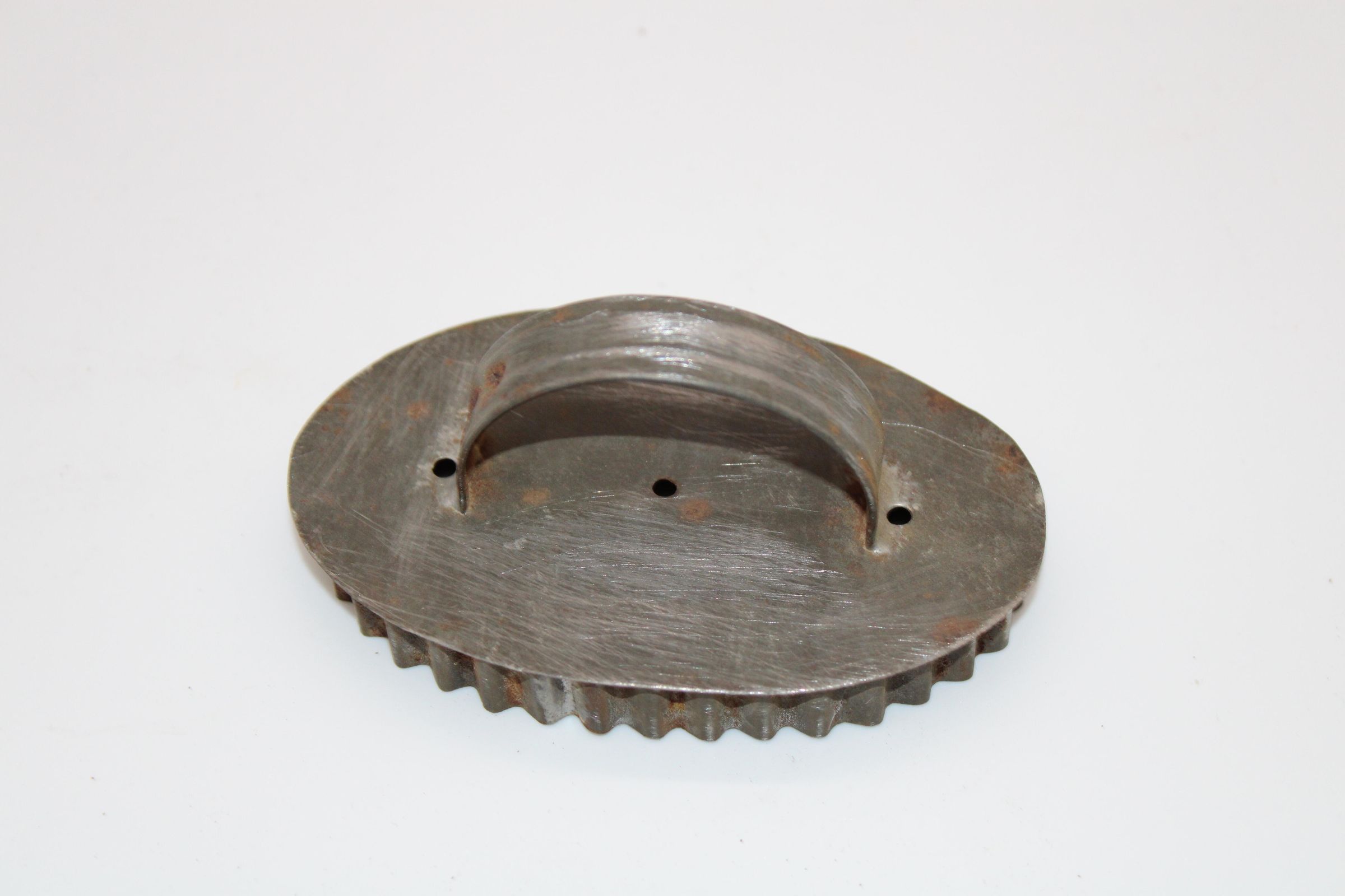 An oval cookie cutter with a zigzag edge. Two V shapes (hearts?) are in the center. Welding marks are visible at the attachment site of the V's.Made/Created