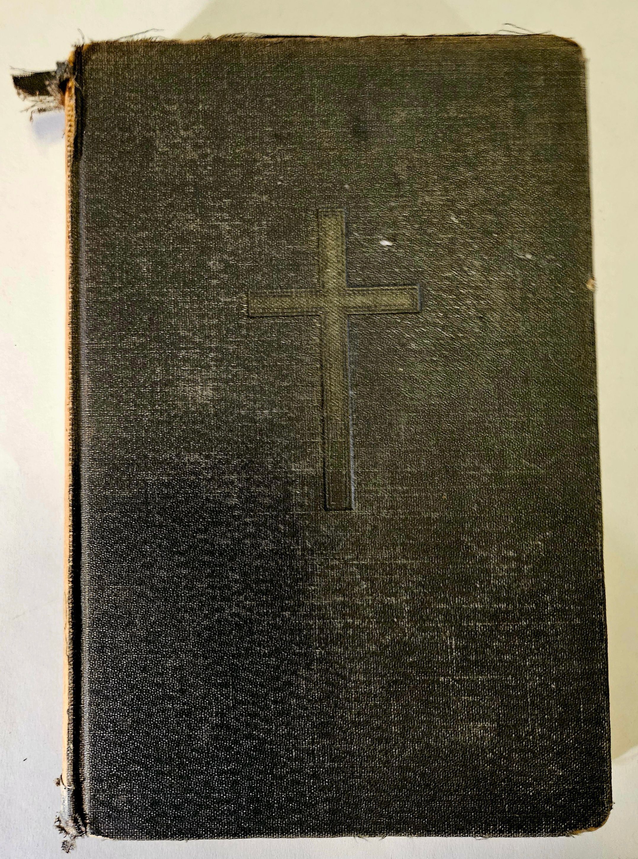The image shows an aged, black hardcover book with a slightly worn appearance, featuring a simple embossed cross in the center of its front cover, suggesting its religious significance; the edges appear frayed, indicating it has been handled or used over time, adding character and a sense of history to the object, while the overall texture of the cover is slightly rough, giving it a tactile quality that might evoke feelings of reverence and tradition for those who have used it in worship or study; the way the light falls across the surface highlights the embossed cross, emphasizing its prominence and serving as a central focal point for the image, drawing the viewer’s attention immediately to the religious symbol, which is crisply outlined despite the book's signs of age.