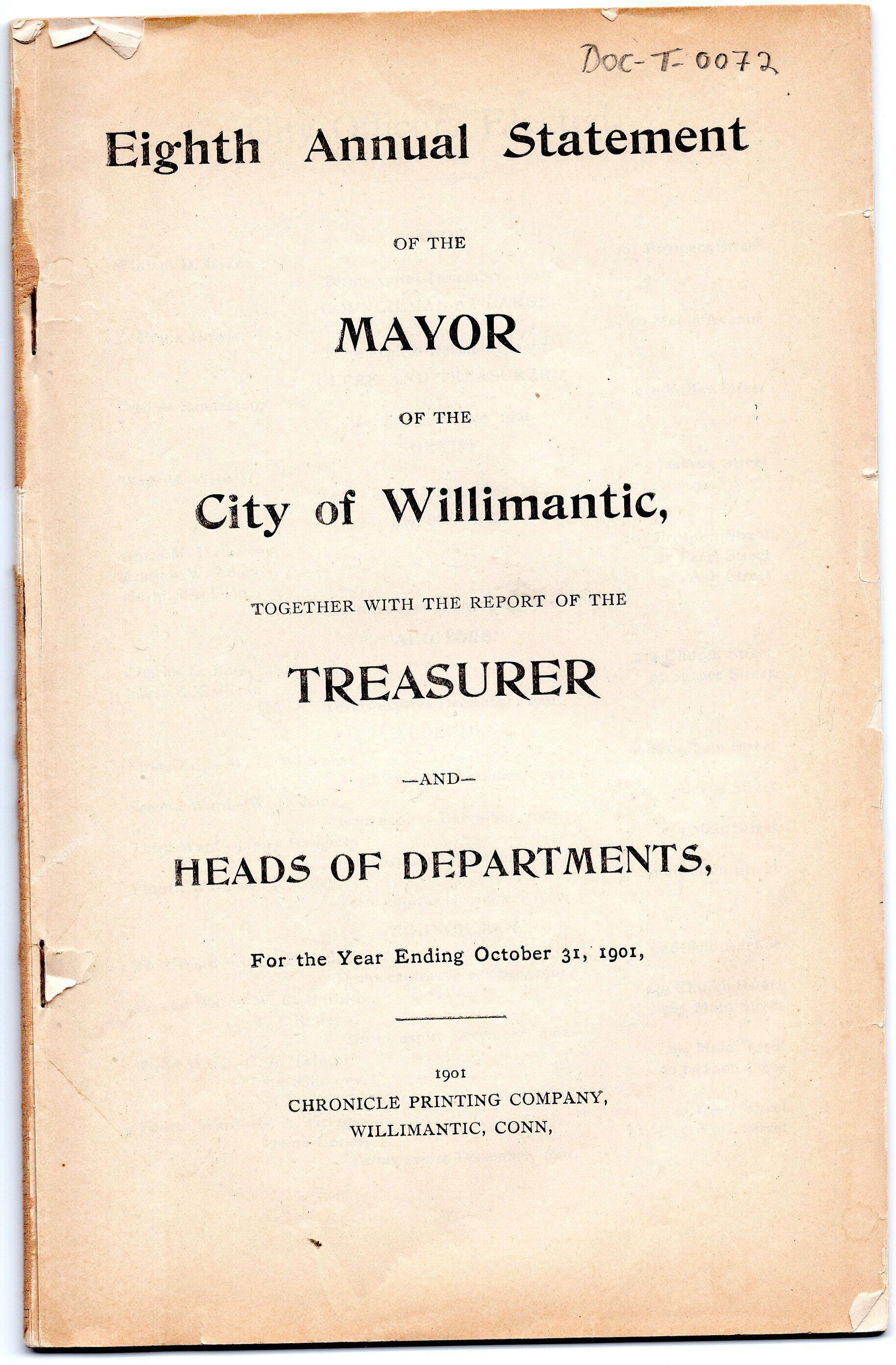 The eighth annual statement of the mayor, William D. Grant, of Willimantic. Includes reports from the treasurer and heads of departments for the year 1901 ending in October 31.Dimensions