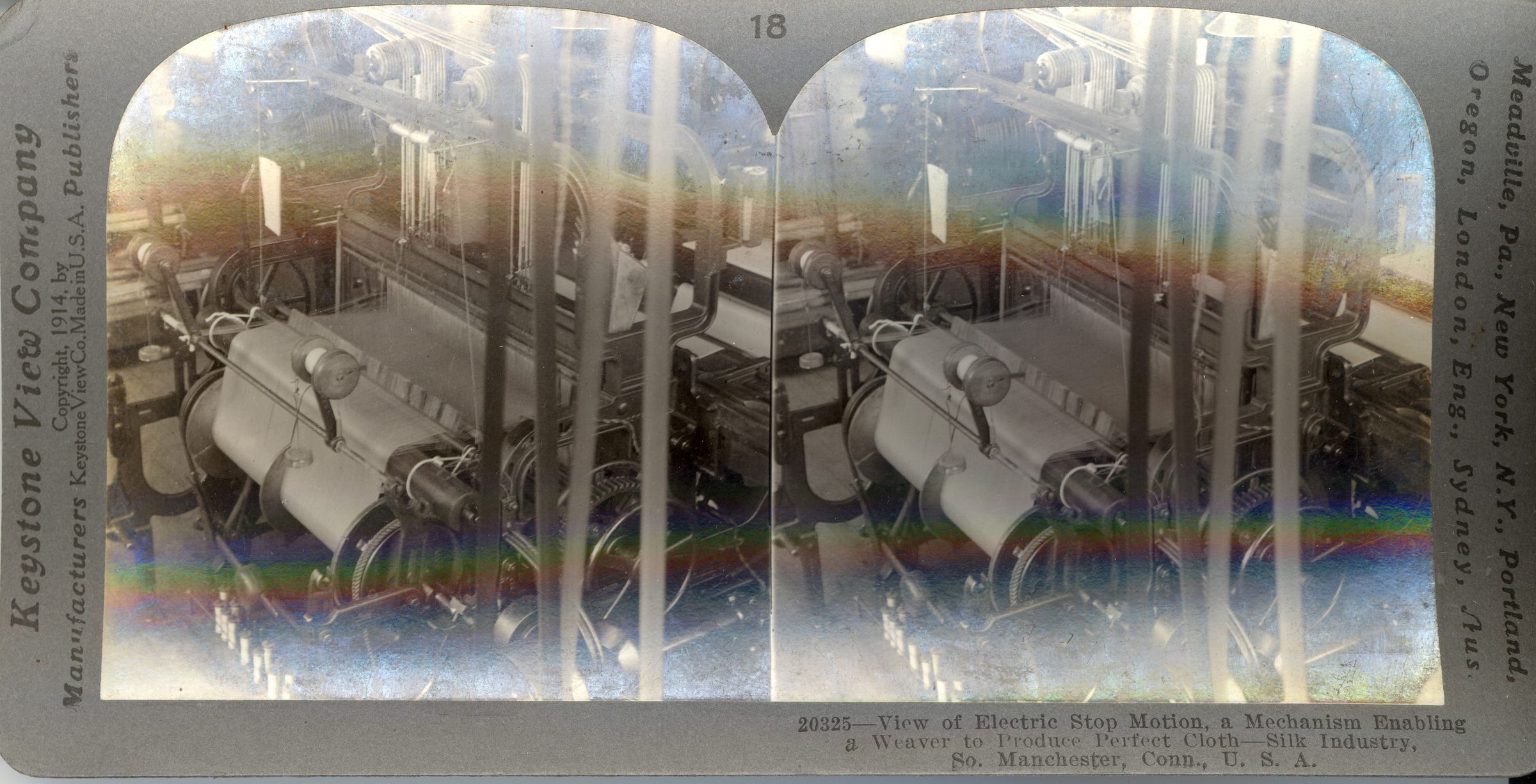 Stereograph of electric stop motion, "a mechanism enabling a weaver to produce perfect cloth." The mechanism was designed to stop the machine in the event of a warp/yarn break. Taken at Cheney Brothers silk mills in South Manchester, CT 1914. Black and white print on cardboard. Card is warped. Unknown photographer. Studio: Keystone View Company, Meadville, PA. Serial #20325Photograph Details