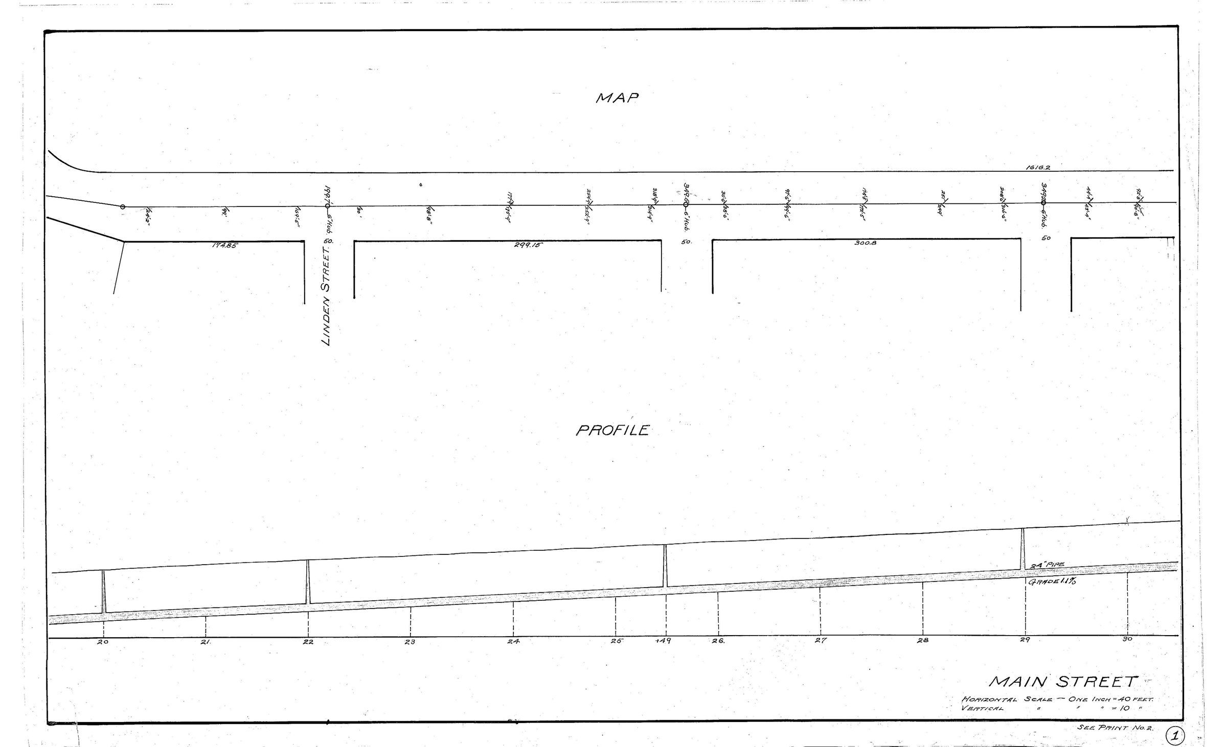Engineering plan of water mains and storm drains under Main Street, Willimantic, CT, Iverton neighborhood, showing both map view and profile. Horizontal scale: 1 in. = 40 ft. Vertical scale: 1 in. = 10 ft.Collection