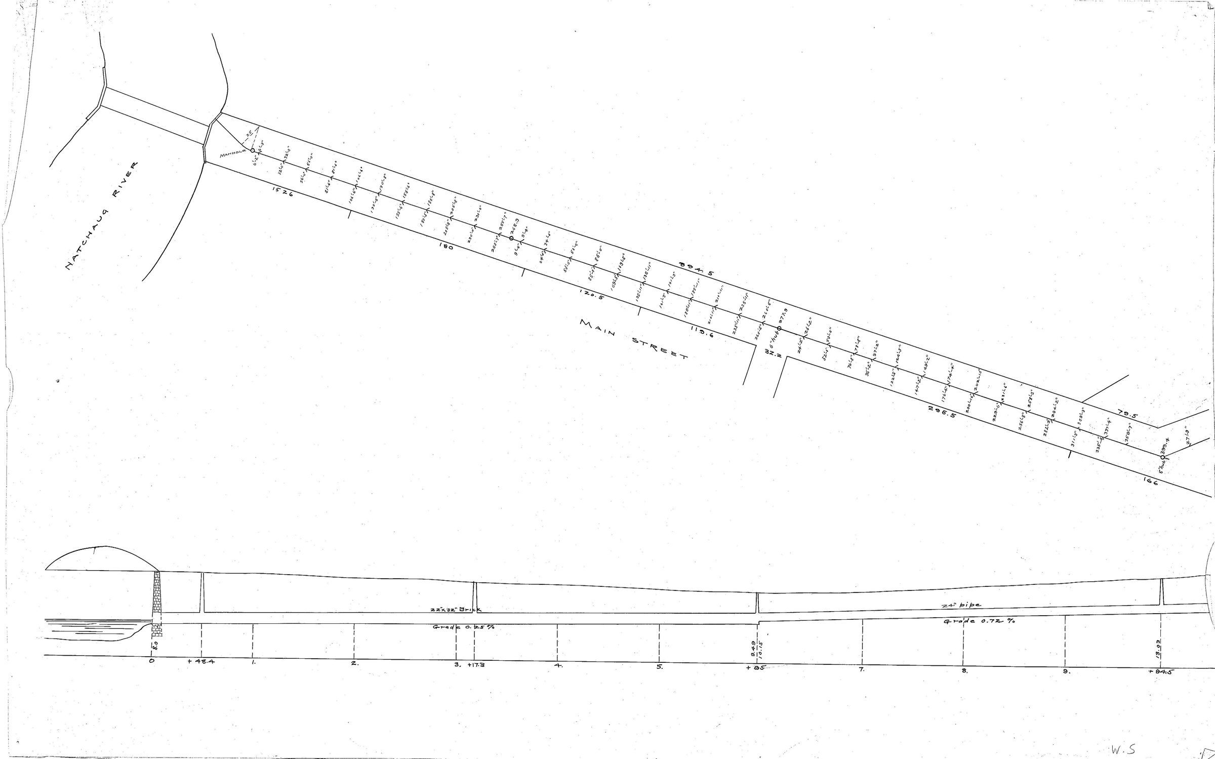 Engineering plan of water or storm drains under lower Main Street, Willimantic, CT (from Cardinal Square to the Horshoe Bridge over the Natchaug River. Shows both length and elevation. Drained into river below bridge. No scale given.Collection