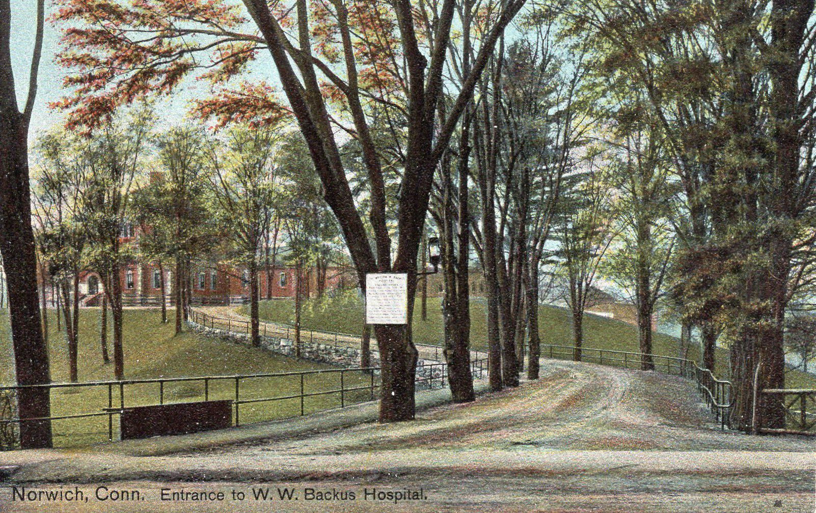 A postcard of the entrance to the W.W. Backus Hospital in Norwich, Conn.Postcard Details