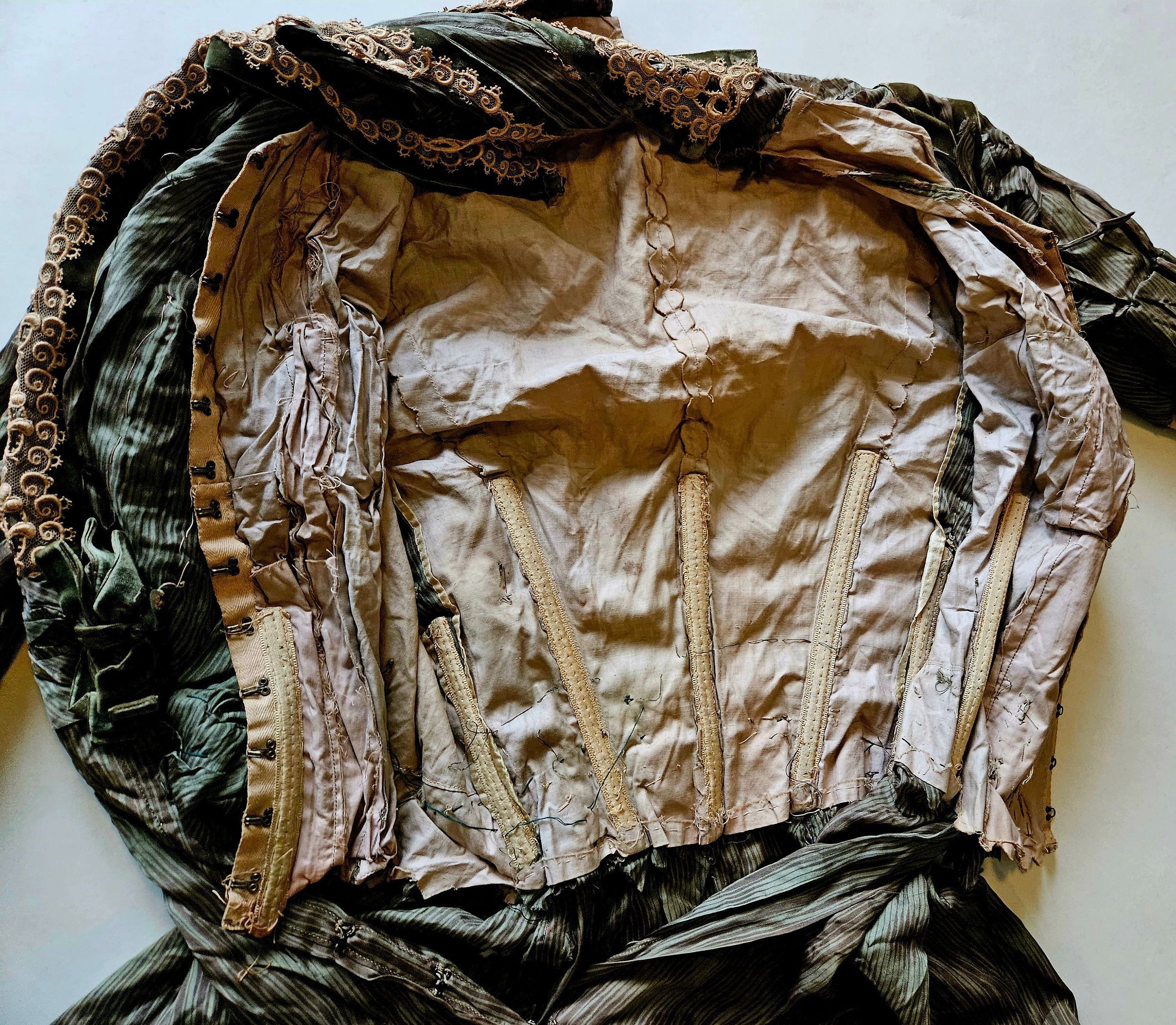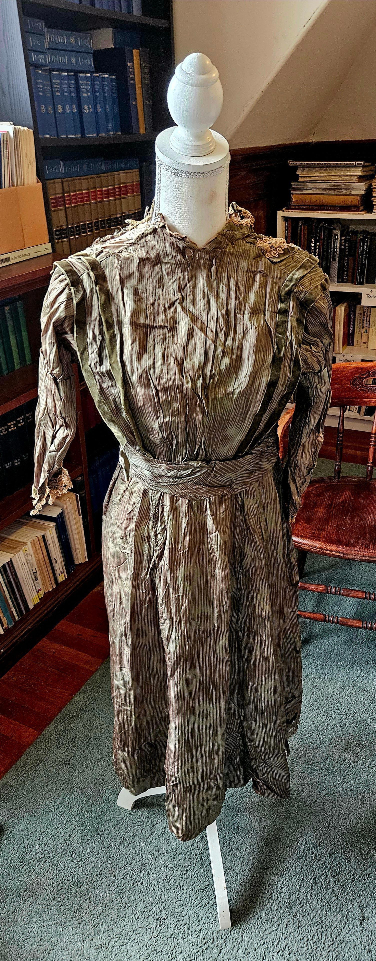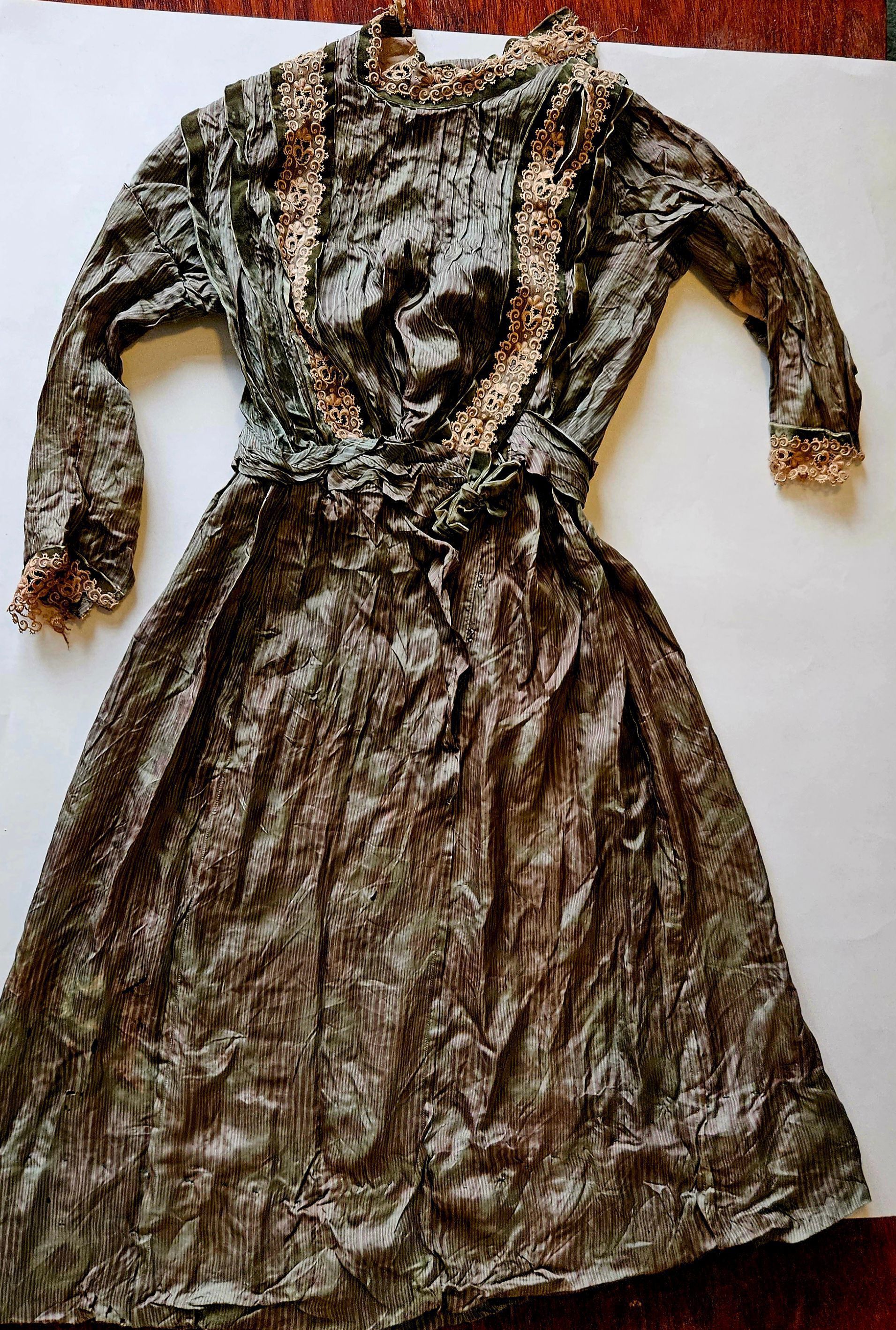 Green silk dress with built-in corset. The donor writes: "My mother's family worked in the textile mills in the area there. She recently passed away, and these were found among her belongings. The dress belonged to her mother or grandmother. My home base is Hawaii and I know this will be destroyed by the climate there. I enjoyed your online presentations and images, and I hope that these items can be part of the collection there for women who worked in the mills. My great Aunt Katherine died from what the museum calls, 'brown lung'. She was only 16. I have a photo of her I treasure -- she is standing with a group of women in the mill -- maybe around looms? I know my grandmother ('Babcia' in Polish) was a loom worker." A prayer book (2023.27.2) arrived in the same shipment.Collection