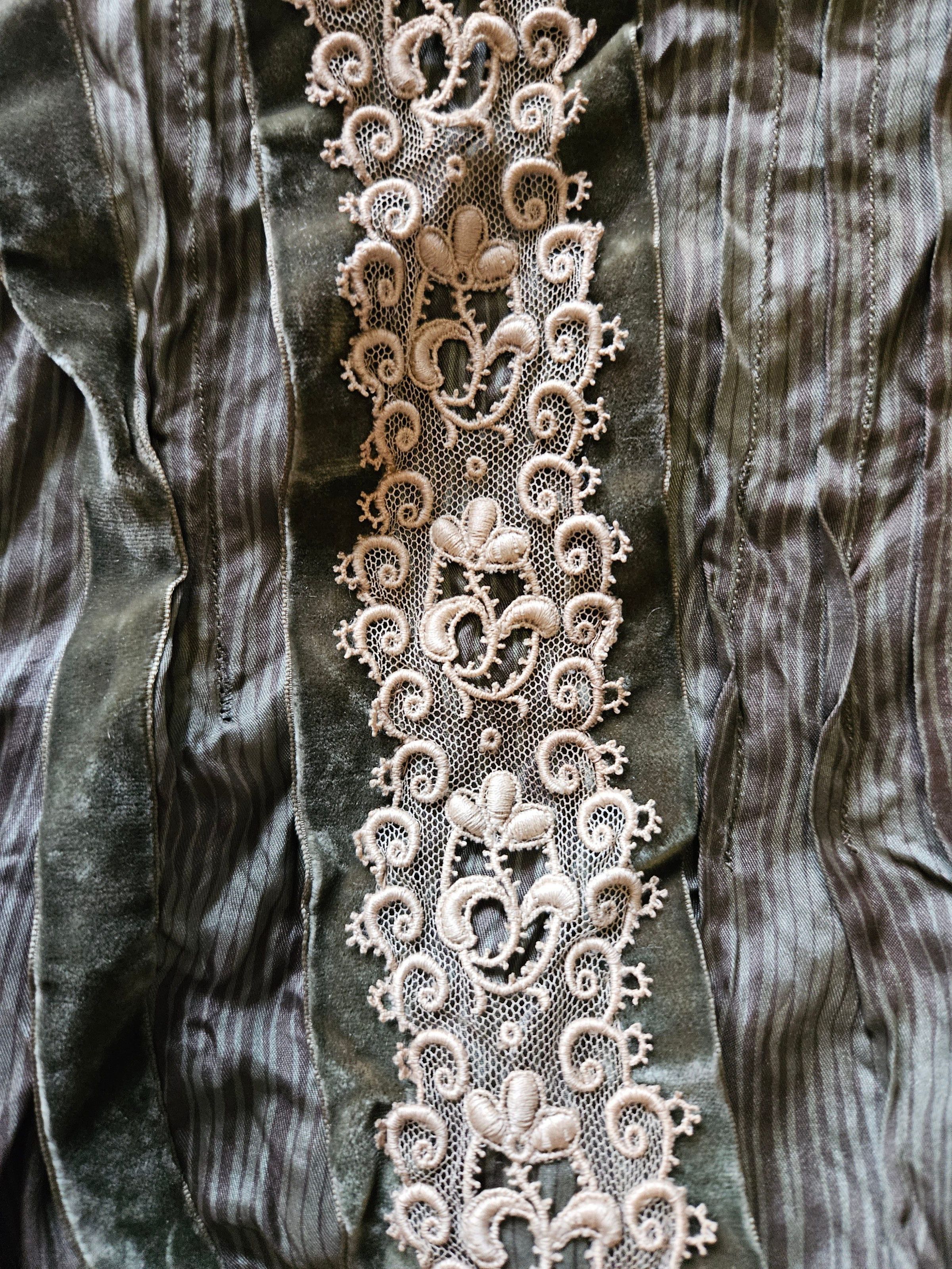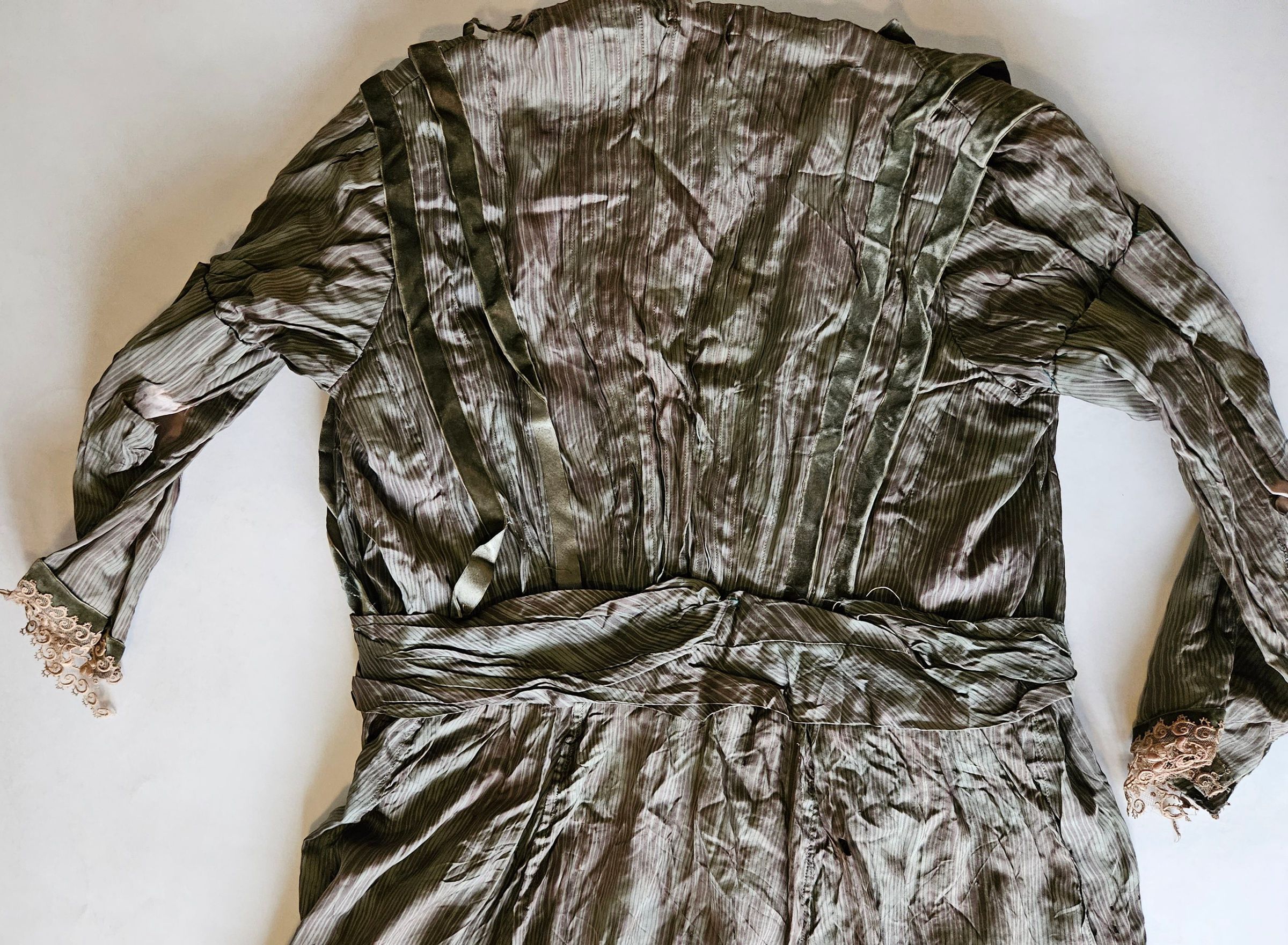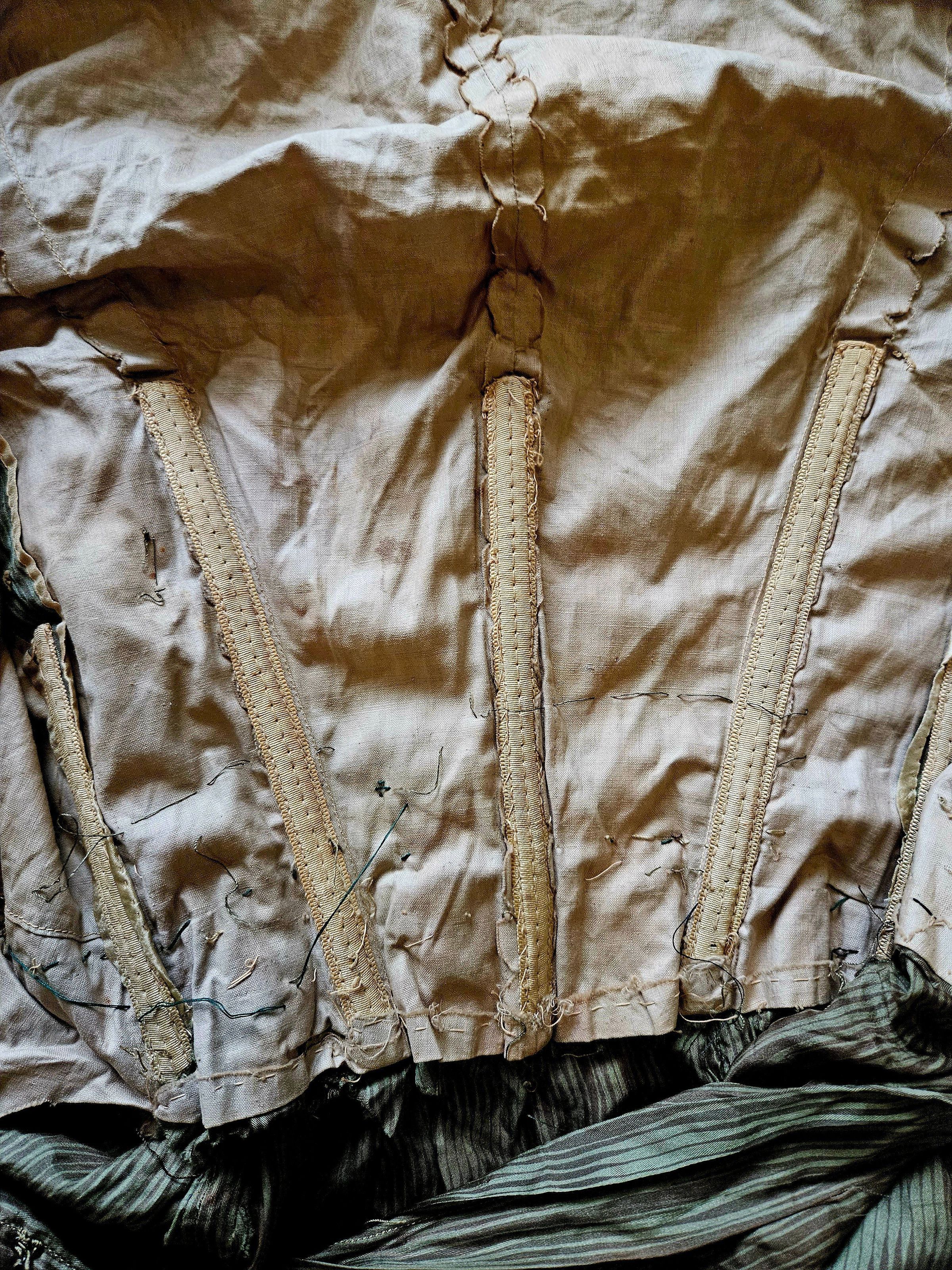 Green silk dress with built-in corset. The donor writes: "My mother's family worked in the textile mills in the area there. She recently passed away, and these were found among her belongings. The dress belonged to her mother or grandmother. My home base is Hawaii and I know this will be destroyed by the climate there. I enjoyed your online presentations and images, and I hope that these items can be part of the collection there for women who worked in the mills. My great Aunt Katherine died from what the museum calls, 'brown lung'. She was only 16. I have a photo of her I treasure -- she is standing with a group of women in the mill -- maybe around looms? I know my grandmother ('Babcia' in Polish) was a loom worker." A prayer book (2023.27.2) arrived in the same shipment.Collection