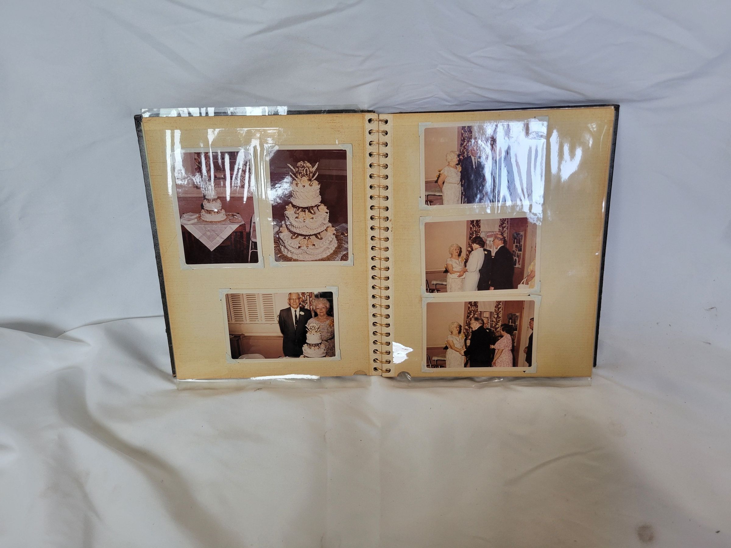 A photo album containing photographs from Harold and Helen Nichols's 50th wedding anniversary party. The album is spiral bound with a plastic cover made to look like wood paneling. Inside, the pages are yellowed with age, holding three photographs on each, and encased in plastic sleeves. the photographs themselves appear to be in good condition.Collection