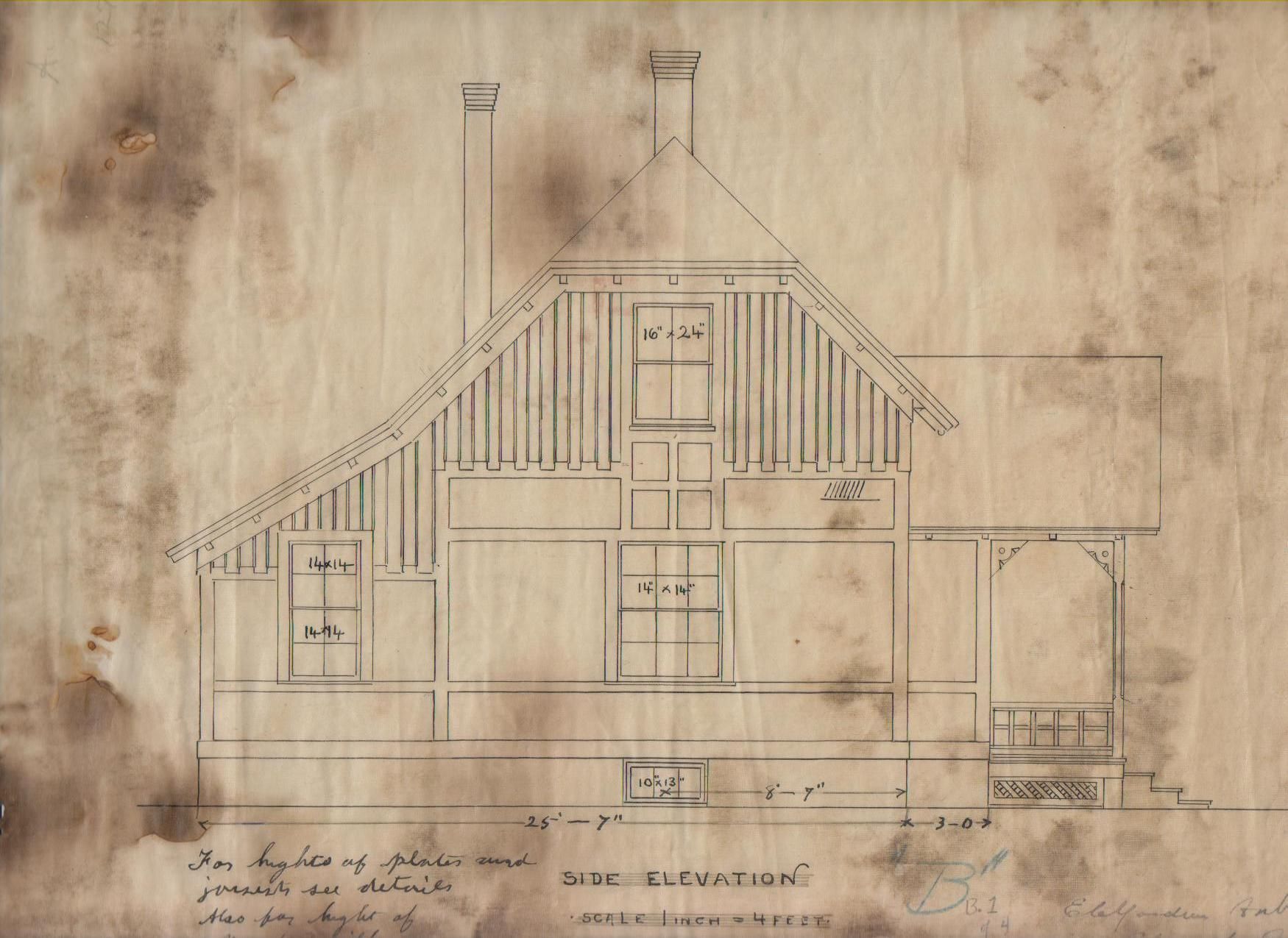 Architectural drawing of cottage (design B-1) in the Oaks, a neighborhood of single-family worker cottages built by the Willimantic Linen Company, the predecessor of the American Thread Company, Willimantic, CT. Side elevation. Scale: 1/4 in. = 1 ft. Designed by noted American (Massachusetts) architect Eugene C. Gardner, among his earliest works.Collection