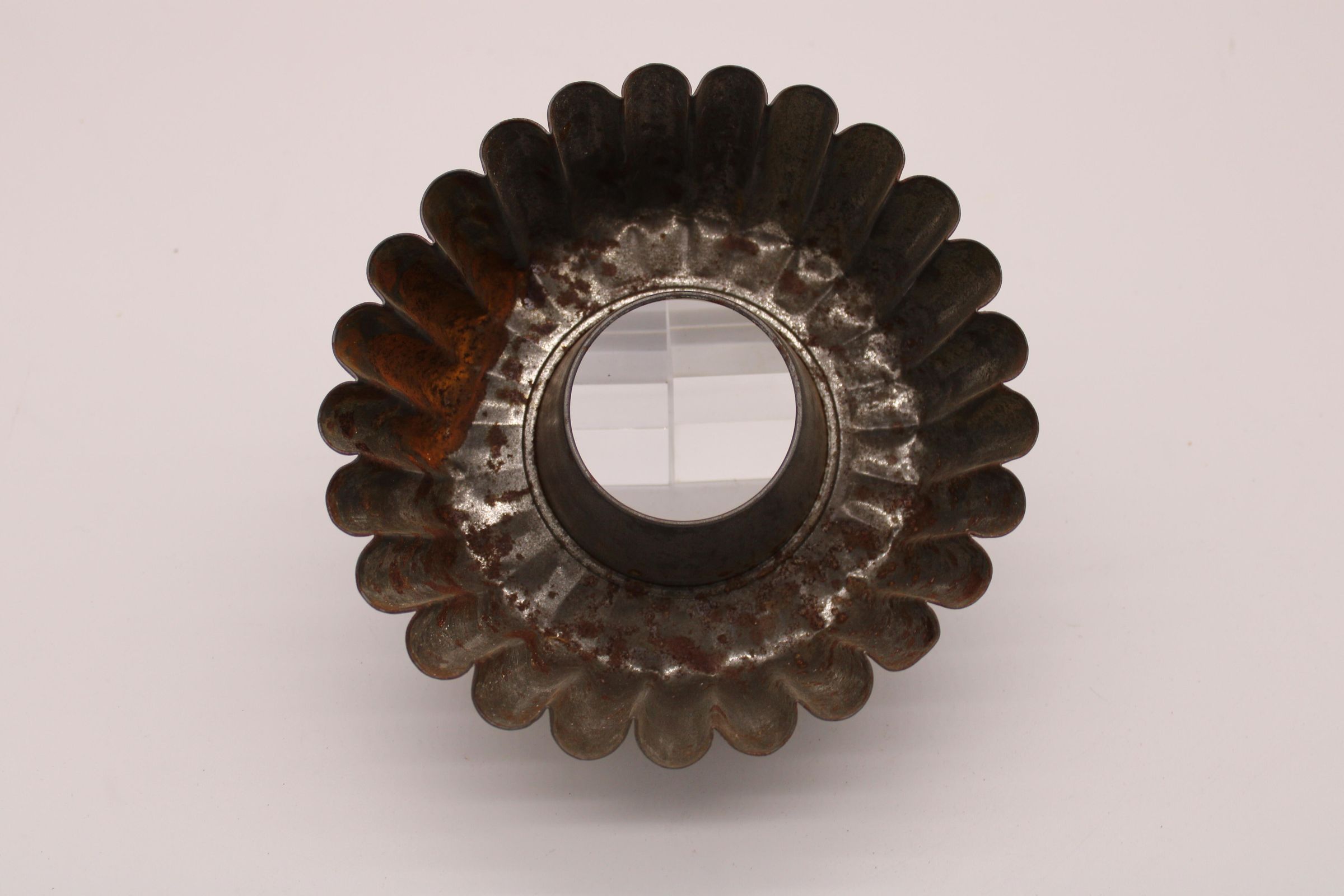 Heavily rusted bundt pan with a scalloped edge.Made/Created