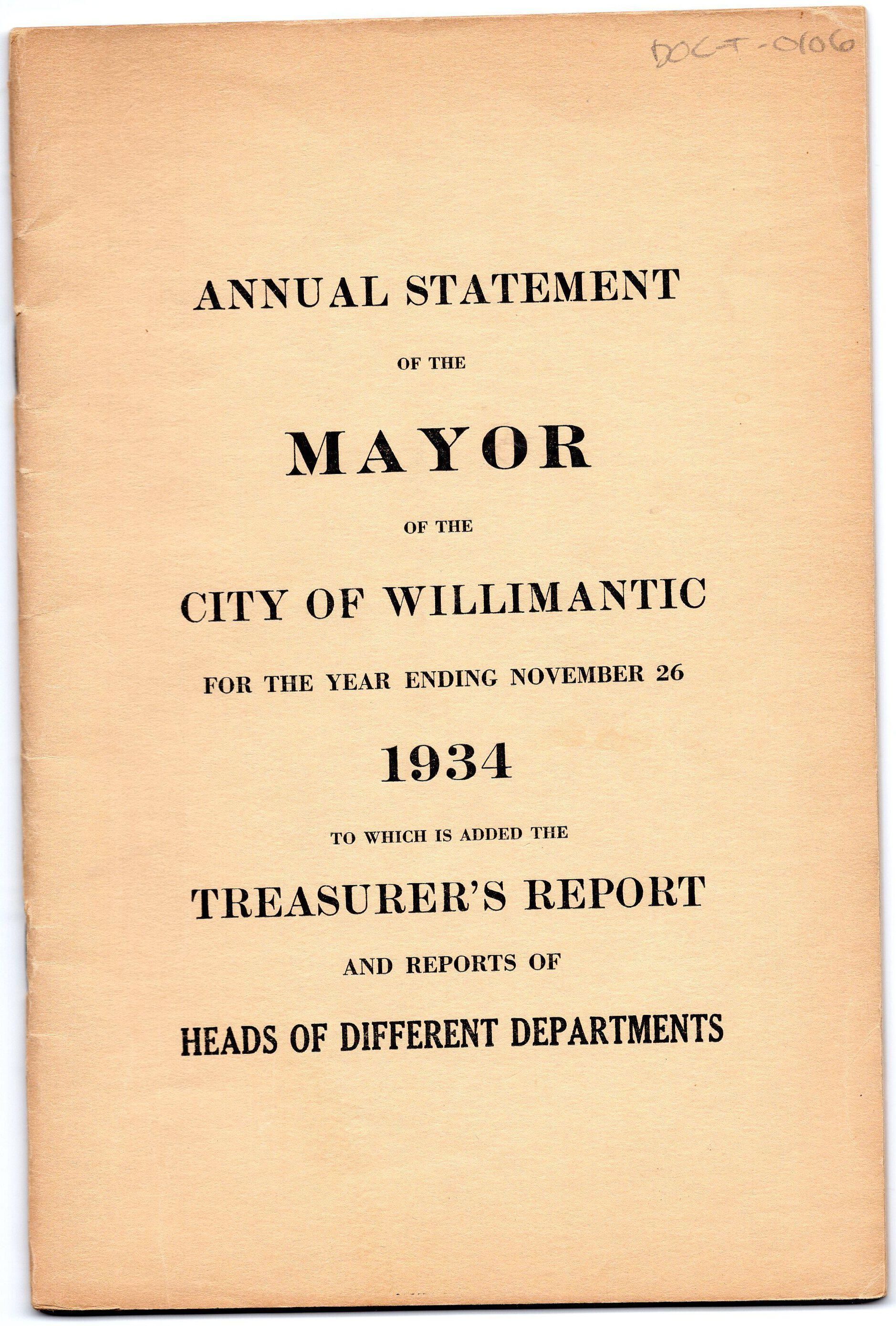 Tan cover of the annual statement of the mayor, James H. Hurley, of Willimantic in 1934. Reports from the treasurer and heads of departments for the year ending on November 26, 1934.Created By
