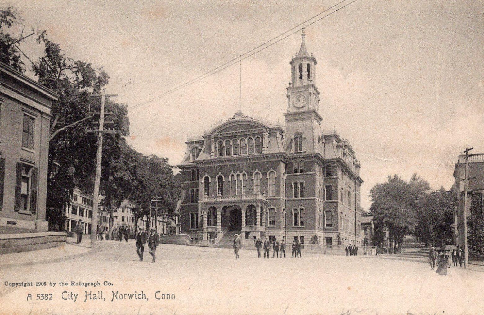 A black and white postcard of City Hall in Norwich Conn. from 1905Condition