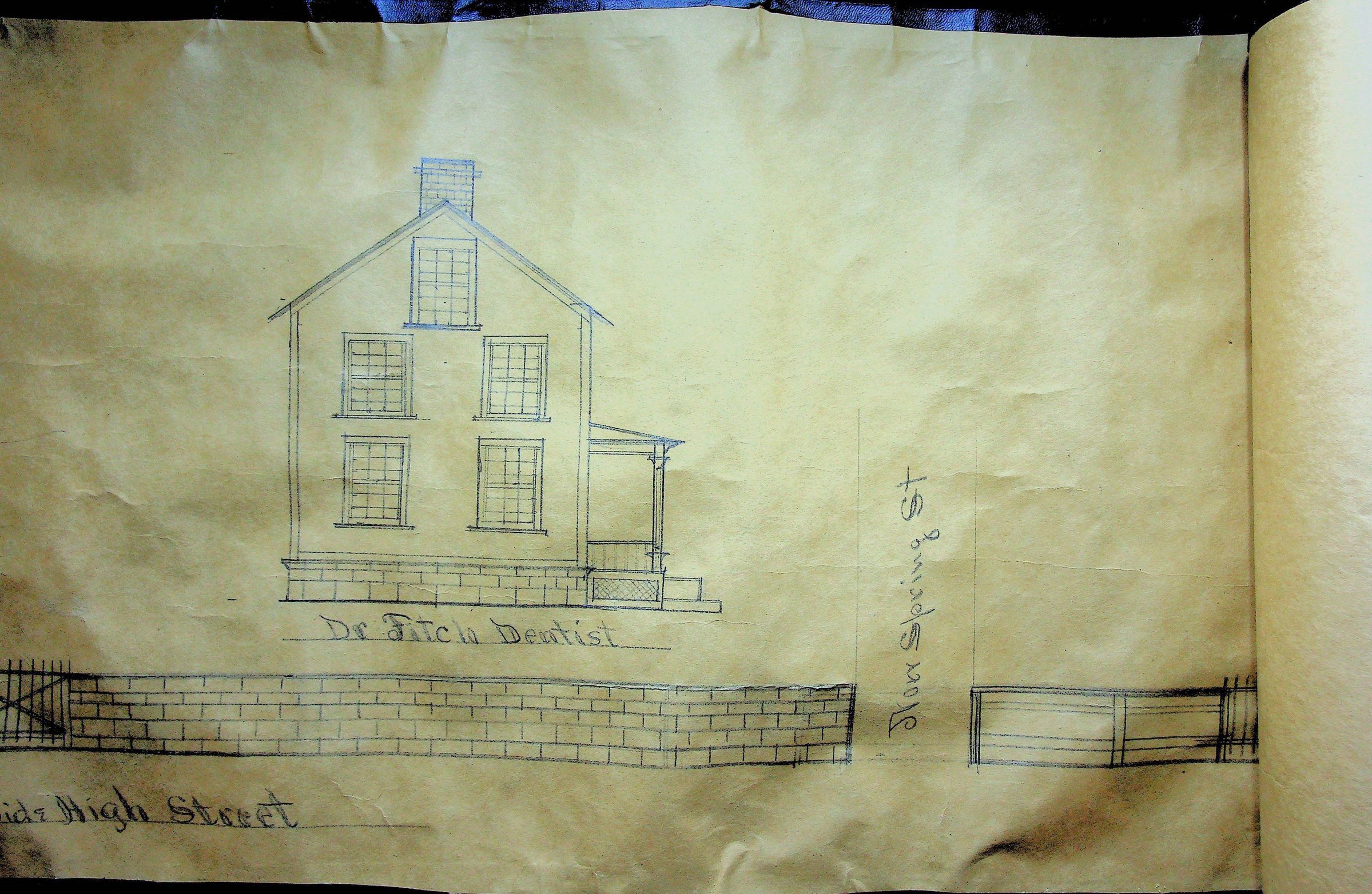 This is a street drawing out of a collection of street drawings of Willimantic done by John Little Leonard. This drawing scroll covers the east side of High Street as it appeared in 1860. These are pencil drawings on a scroll of brown wrapping paper. The buildings on this scroll include: Dr. Witter's House, Thomas Spencer's house, a barn, Chester Burnham's house, Joe's house, Mrs. Littlefield's house, Mrs. Bailey's house, Grandma Dean's house Courtland Babcock's house, Mr. Williams house and Dr. Finch the dentist's place.Artwork Details