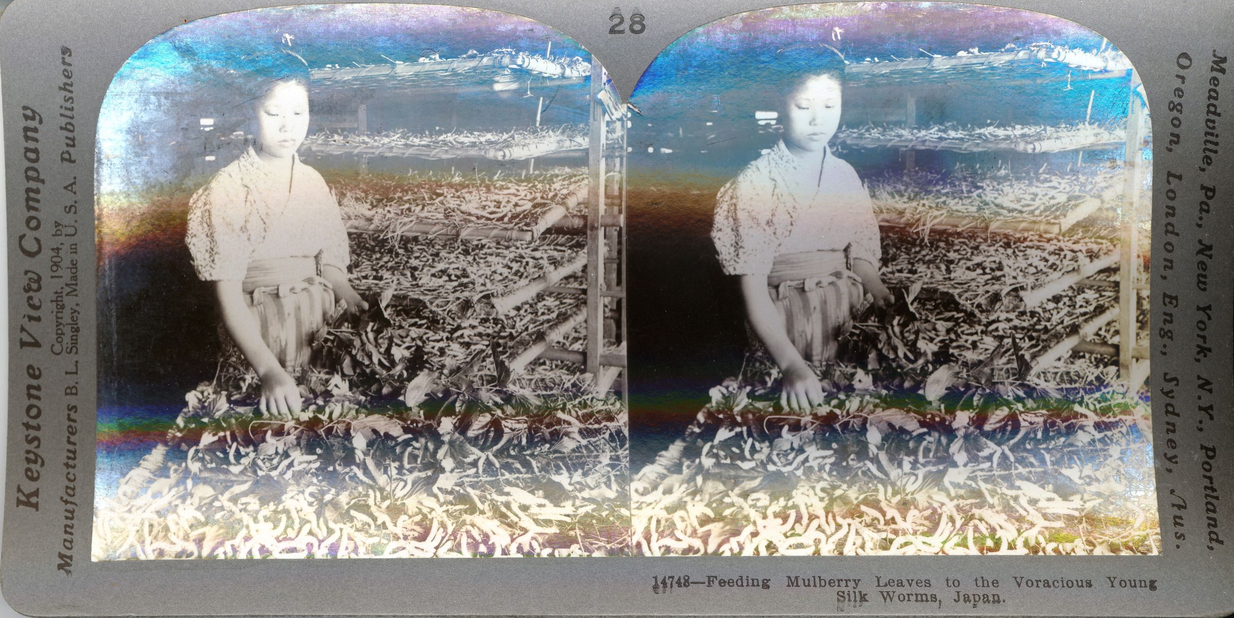 Stereograph of worker feeding mulberry leaves to silk worms. 1904. Card is warped.Photograph Details